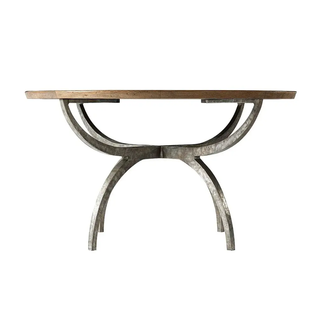A round dining table with beveled edge and oak parquetry top and a walnut line inlays. Finished in our Echo Oak finish and raised on a vintage-style metal parabolic arch form base. Dimensions: 54" W x 54" D x 30" H
