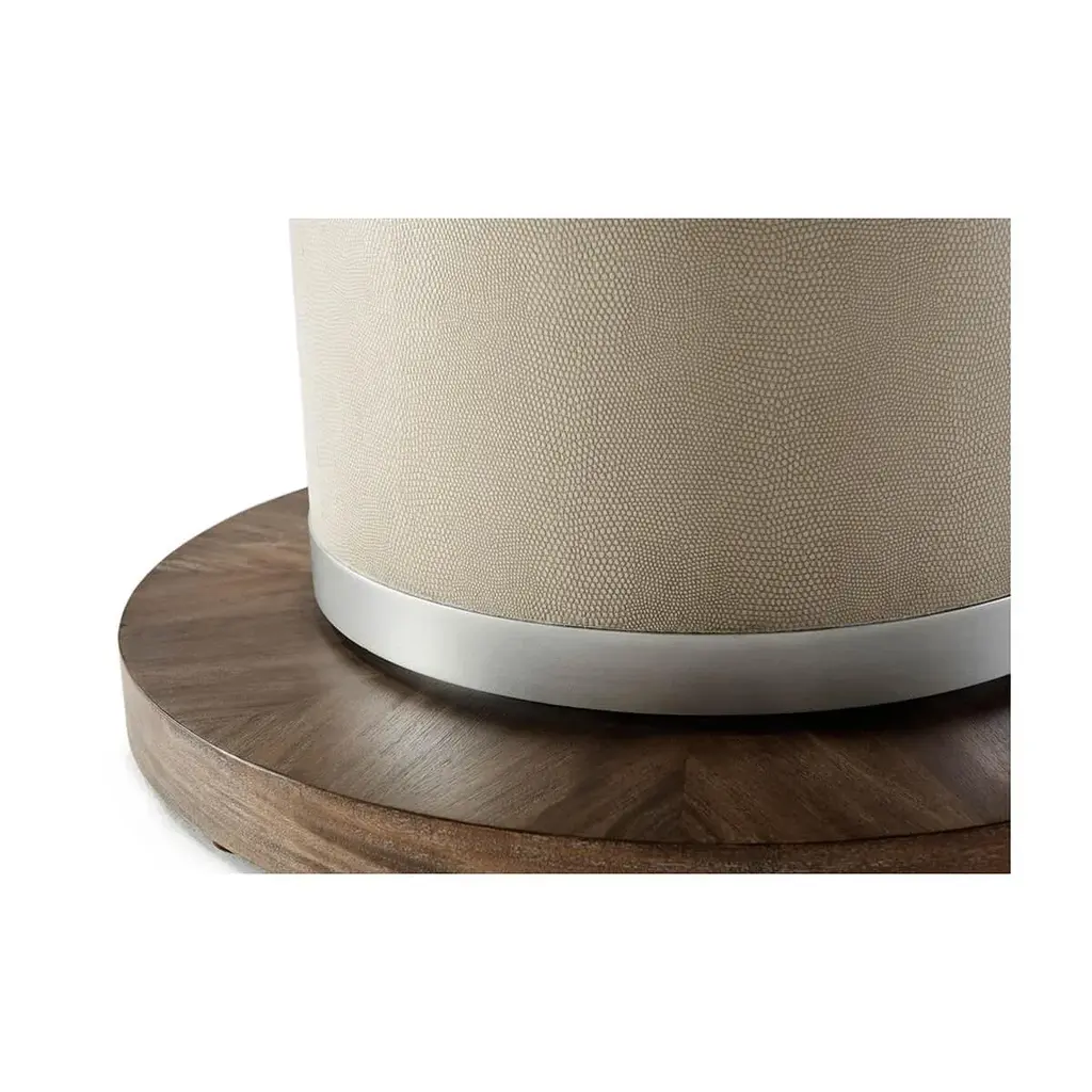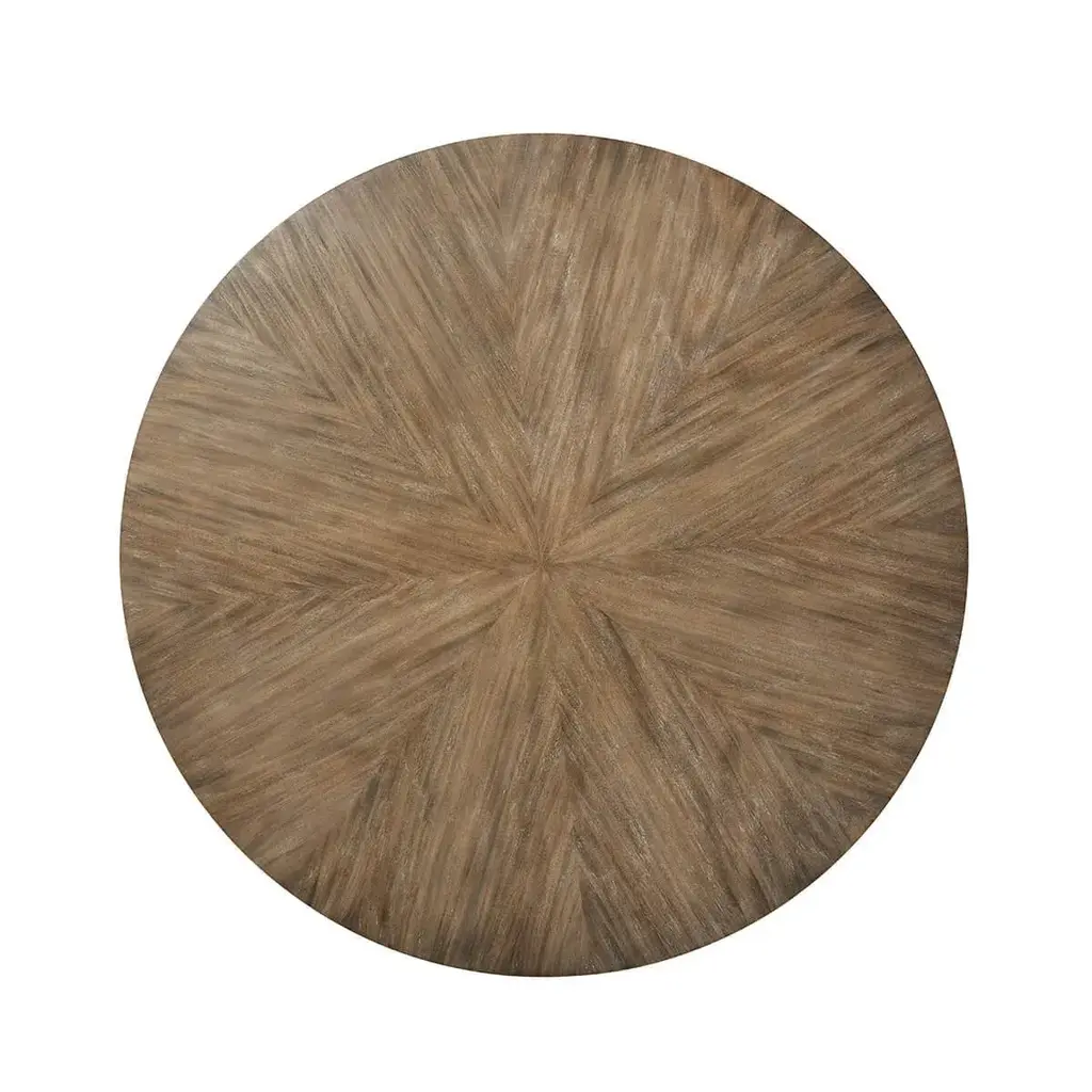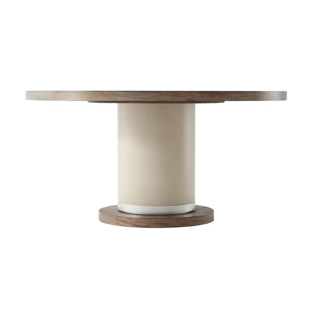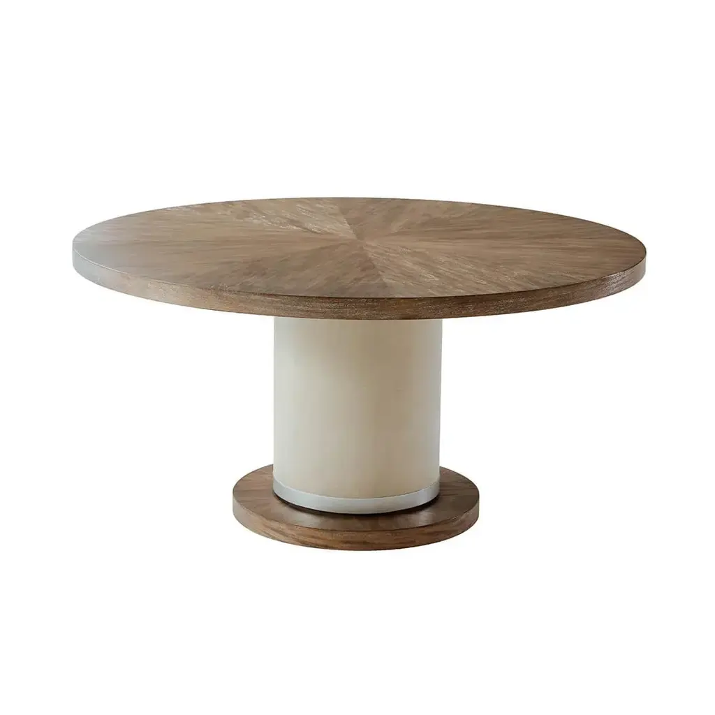 with a sunburst inlaid mangrove primavera veneered circular top in raised on a cylindrical column pedestal wrapped in Komodo embossed leather, with brushed nickel accents and a veneered platform base. Dimensions: 60 " W x 60" D x 30" H