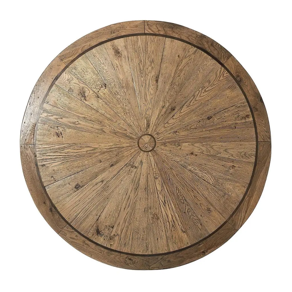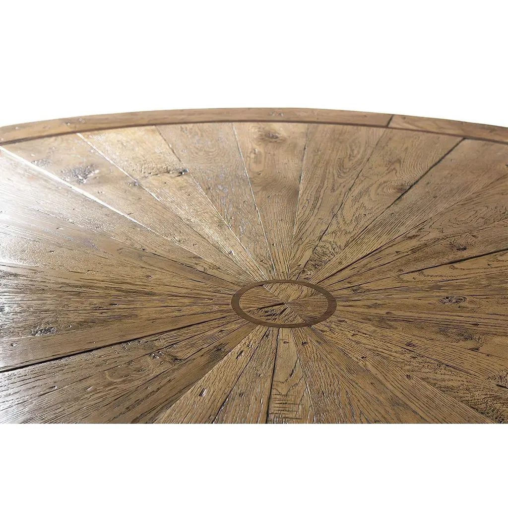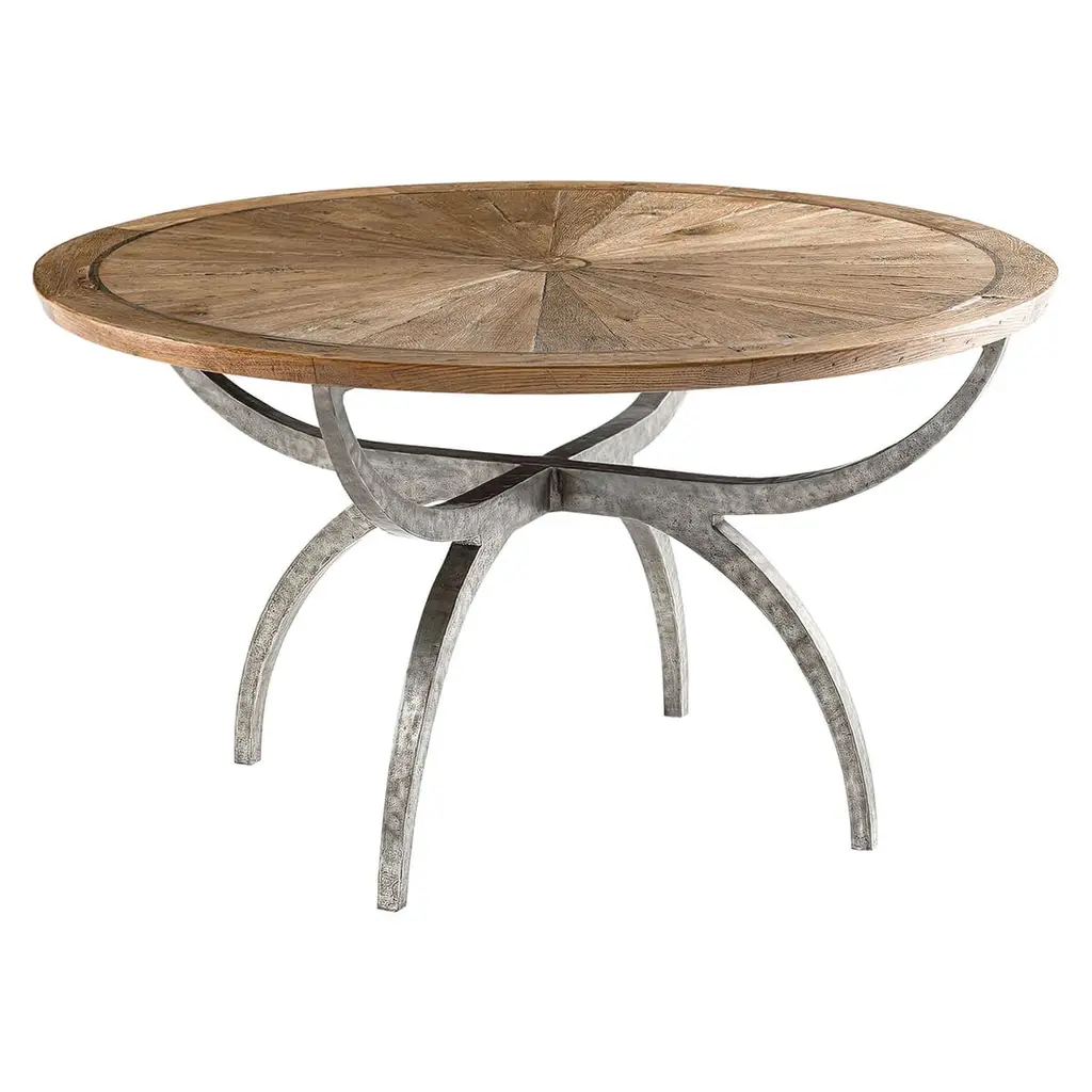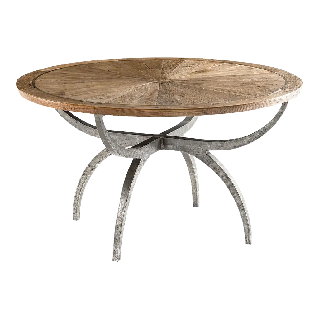 A modern rustic round dining table with beveled edge and oak parquetry top and a walnut line inlays. Finished in our echo oak finish and raised on a vintage style metal parabolic arch form base.Dimensions: 64" W x 64" D x 30" H.