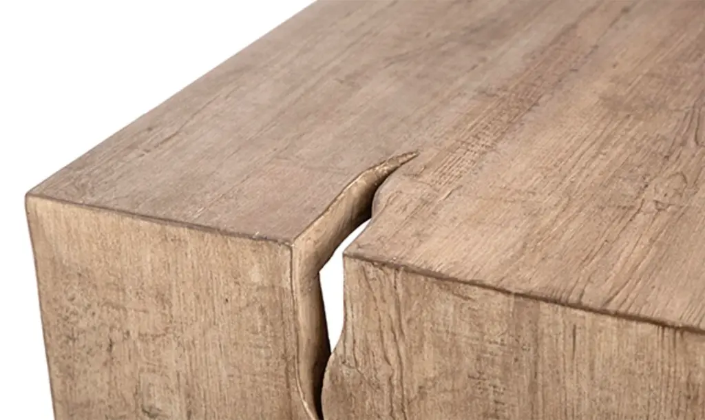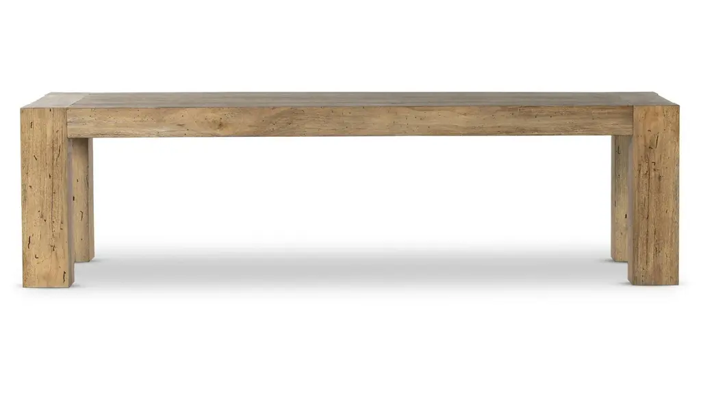 Modern washed salvaged pine wood waterfall dining table. Unique organic modern style with cutout details on corners. Each slightly unique in natural material differences and handmade details. This table weighs approx. 210 lbs.