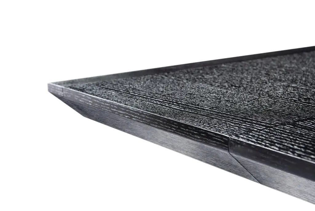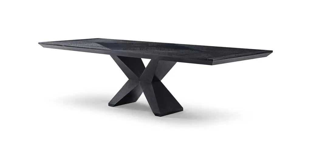 Modern Wenge Oak Dining Table Designed by Greg Sheres. The “Angles” table top features a geometric design. Fully extended with leaves, this dining table opens up to 114-inches, giving you plenty of room to gather friends and family for dinner. The Angles Dining Table adds an effortless twist to your living space, and each one is created with the utmost attention to detail and superior craftsmanship. Greg has been designing and making furniture for over 30 years.The strong angular sculptural base has a "Rustic modern" vibe. The reverse bevelled edges of the table top compliment the angles of the table base. The reverse diamond pattern of the wood in the table top accentuates the angles of the table base.Open 114"x42". Closed 80"x42".
