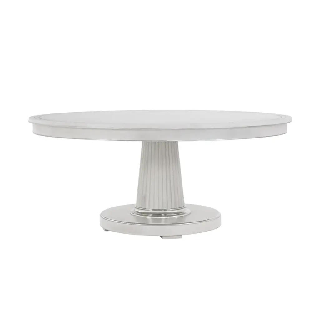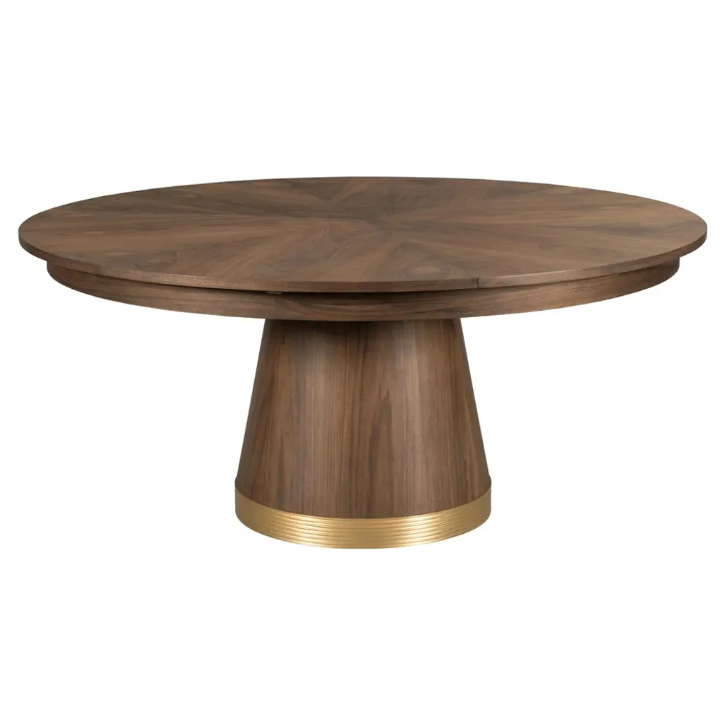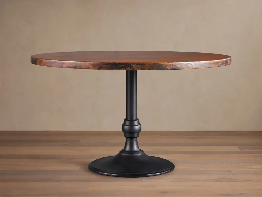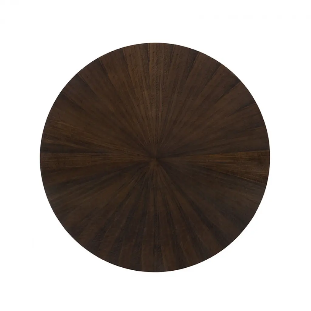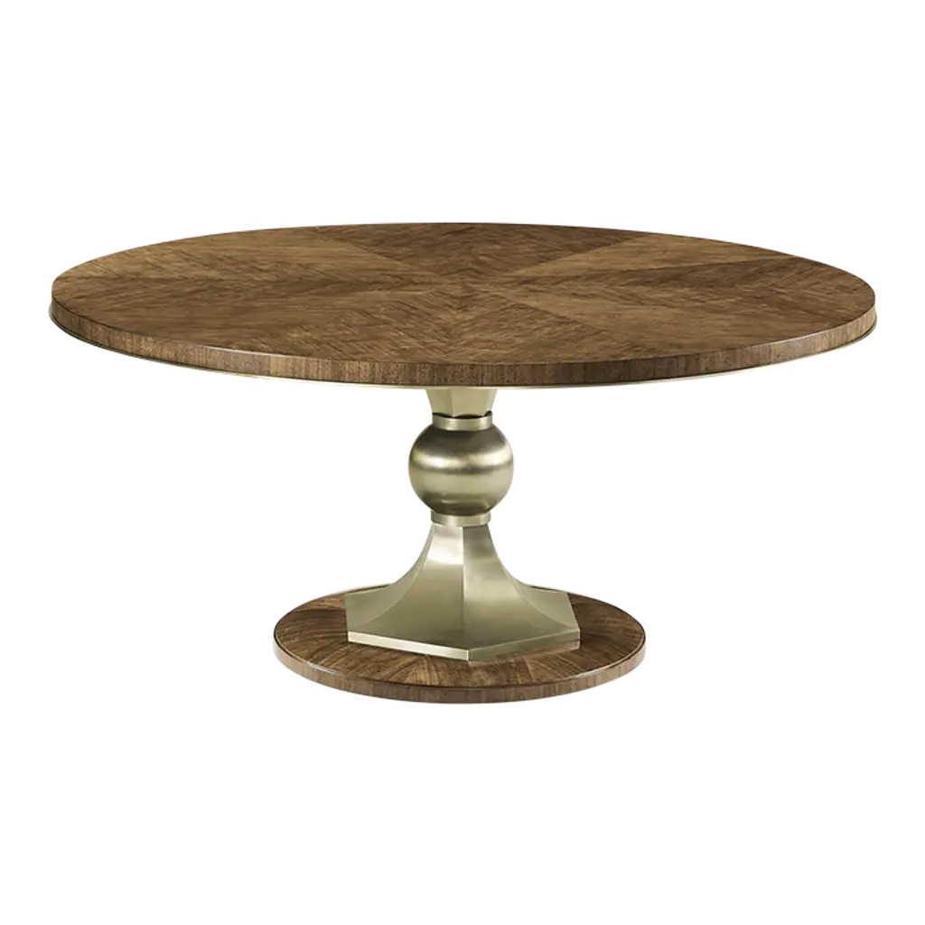Dramatic sculptural details merge in this round dining table with comfortable seating for up to 6 people. Fumed figured eucalyptus takes on a warm glow with its dark Aged Bourbon finish. The eucalyptus has been inlaid in a starburst pattern surrounded by a band of Smoked Bronze accent molding. Your eye is immediately drawn to the pebbled Smoked Bronze base that is a work of art on its own.