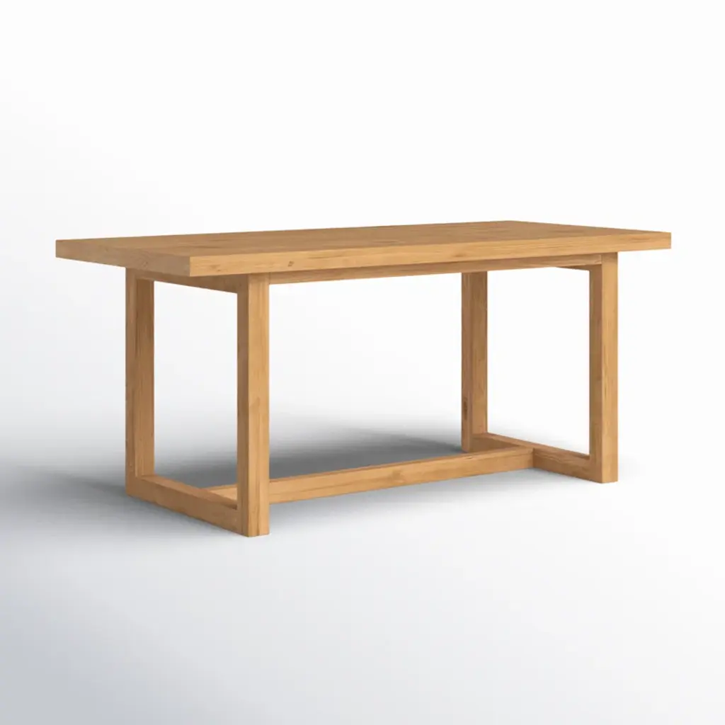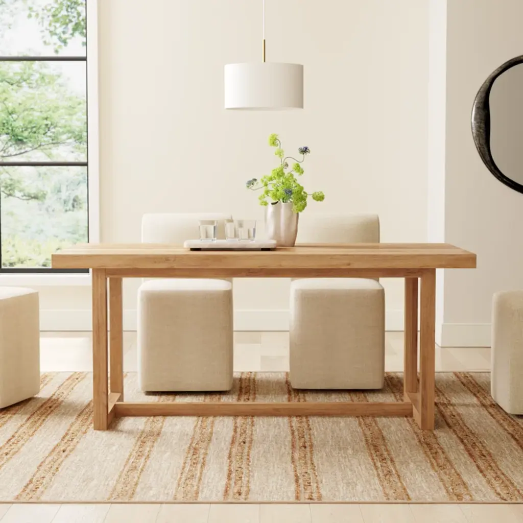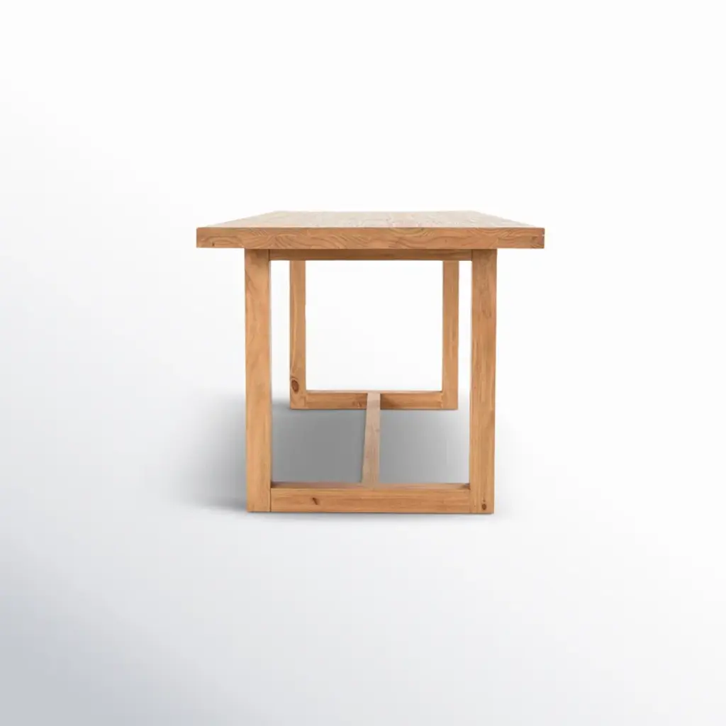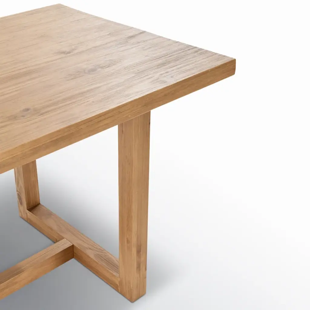 This dining table blends modern and classic design, making it a versatile centerpiece for your dining room. Made from kiln-dried, reclaimed pine wood, it showcases warm natural grain variations. The spacious rectangular top seats six, supported by a sturdy sled base with ample legroom. Pair it with your favorite chairs (sold separately) and add some dried florals – you're ready to host.