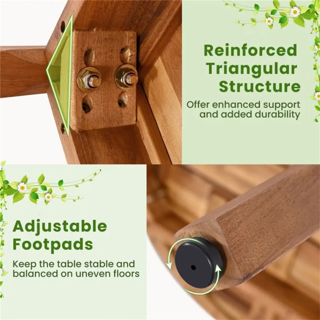 Acacia Wood Structure: The dining table is crafted from 100% natural acacia wood, renowned for its exceptional durability and ability to resist cracking. Furthermore, the paint free surface will stimulate your imagination to customize its appearance. Large Table for 6 People: The 36in x 30in(Dia. x H) round outdoor dining table can comfortably accommodate up to 4 individuals. This versatile piece is ideal for both outdoor and indoor dining settings, making it a perfect addition to your backyards, terraces, gardens, or kitchens. Excellent Sturdiness: The wooden dinette table features scientific triangular structures on all four corners and reinforced wood boards to ensure robustness and a substantial loading capacity of 165 lbs. Thoughtful Details: Presented are smooth round corners and a slatted design on the tabletop to prevent damage and spill accumulation. Additionally, adjustable foot pads have been incorporated for secure placement on all surfaces. Easy Assembly and Maintenance: The simple assembly process, complemented by clear instructions, ensures that setting up the patio table is a hassle free experience. Please apply oil to the wood surface regularly for optimal maintenance and please avoid rain exposure for prolonged lifespan.