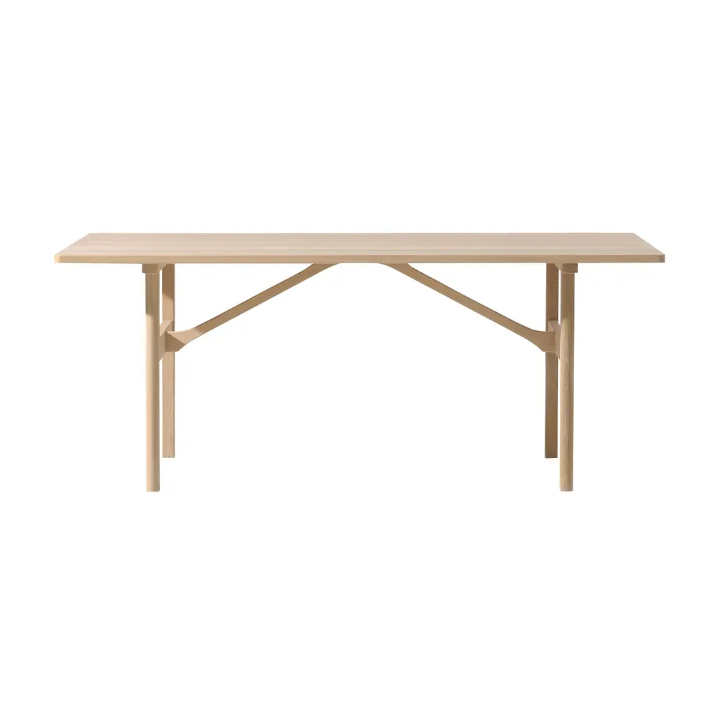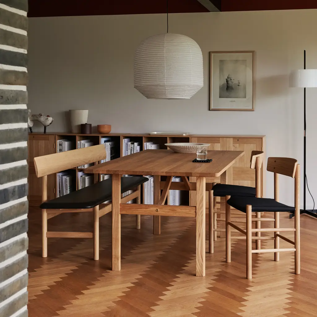 Børge Mogensen’s 6284 Table from 1958 embodies his desire for longevity in a restrained aesthetic, made from the finest selection of solid oak available in a variety of finishes. Inspired by the functional, utilitarian approach of the Shaker movement, his aim was to create beautiful, distinctive furniture by emphasizing simple horizontal and vertical lines and surfaces. That restrained manner imbues the structural beauty of the versatile table’s angled leg support and joinery with a modest appearance intended to create a sense of tranquillity.