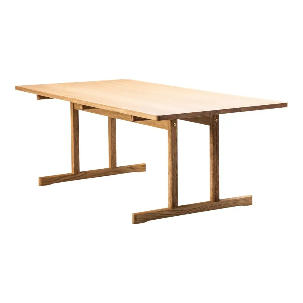 Mogensen's iconic Shaker table in solid oak was designed in 1964, with premium selection solid oak being its highlight. Extra-large planks of solid oak create a powerful statement inspired by Shaker style, allowing for any chair width. Ideal for dining or meeting, it's a sturdy, straightforward, durable table designed for life. Available with additional plates extending the table top on each end.