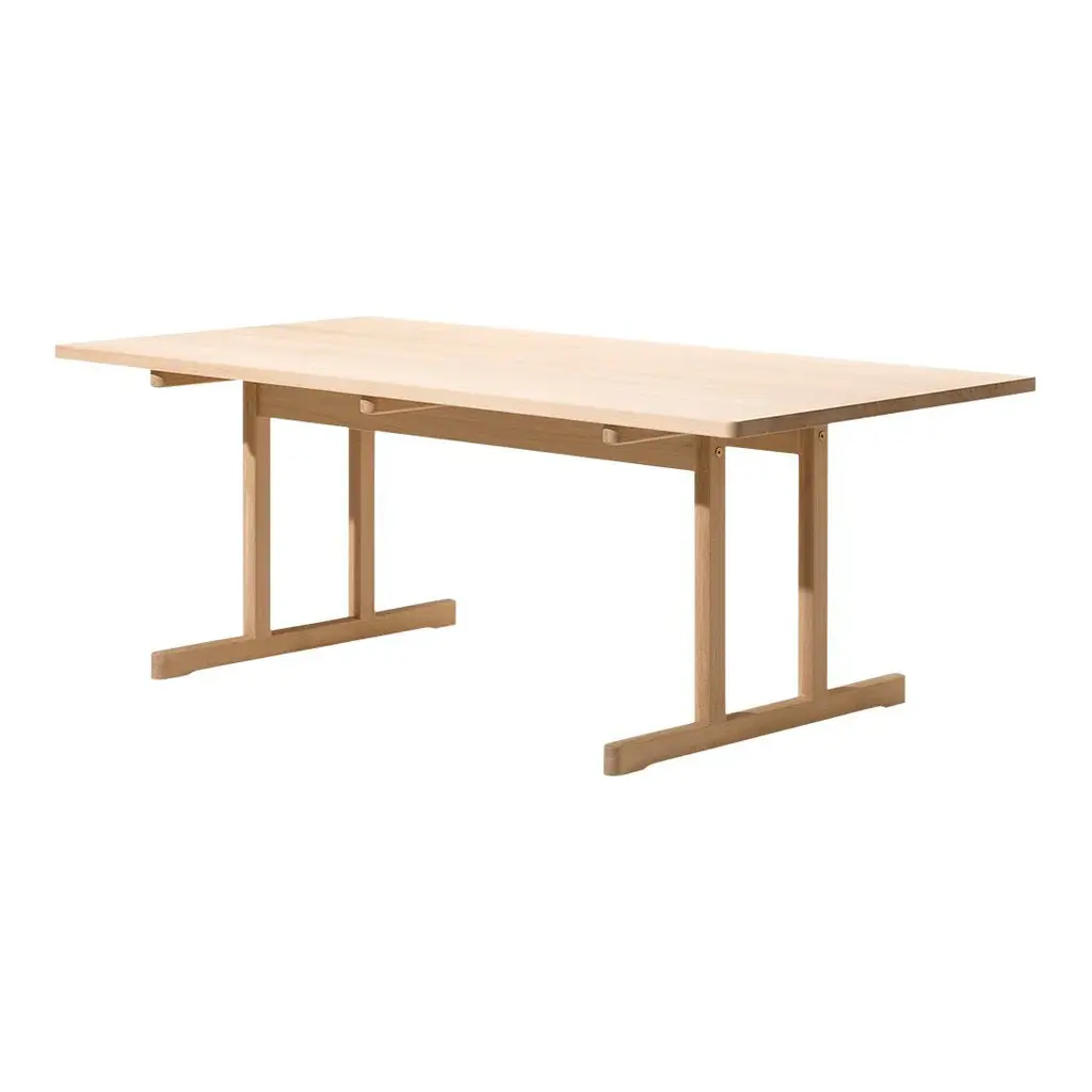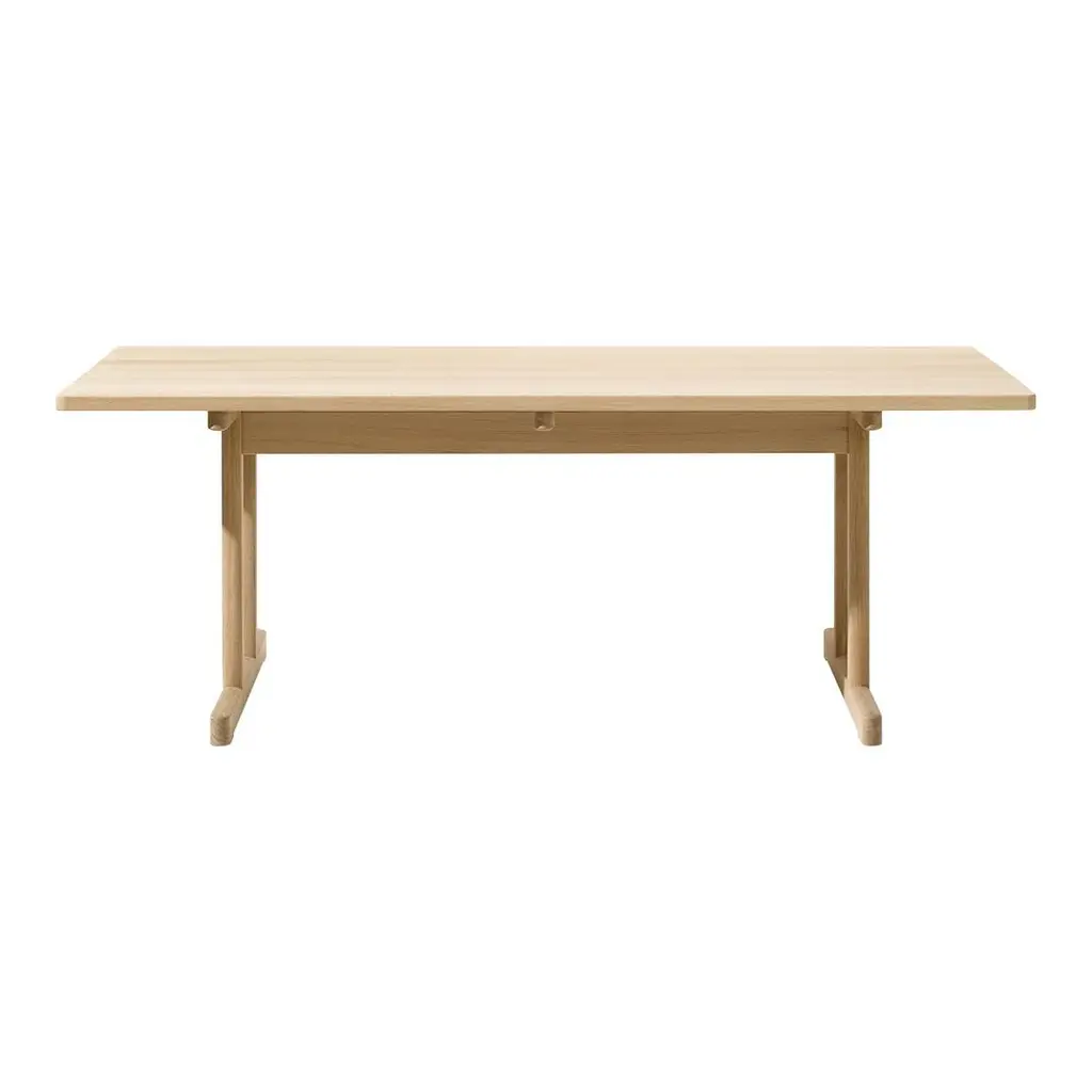 Mogensen's iconic Shaker table in solid oak was designed in 1964, with premium selection solid oak being its highlight. Extra-large planks of solid oak create a powerful statement inspired by Shaker style, allowing for any chair width. Ideal for dining or meeting, it's a sturdy, straightforward, durable table designed for life. Available with additional plates extending the table top on each end.