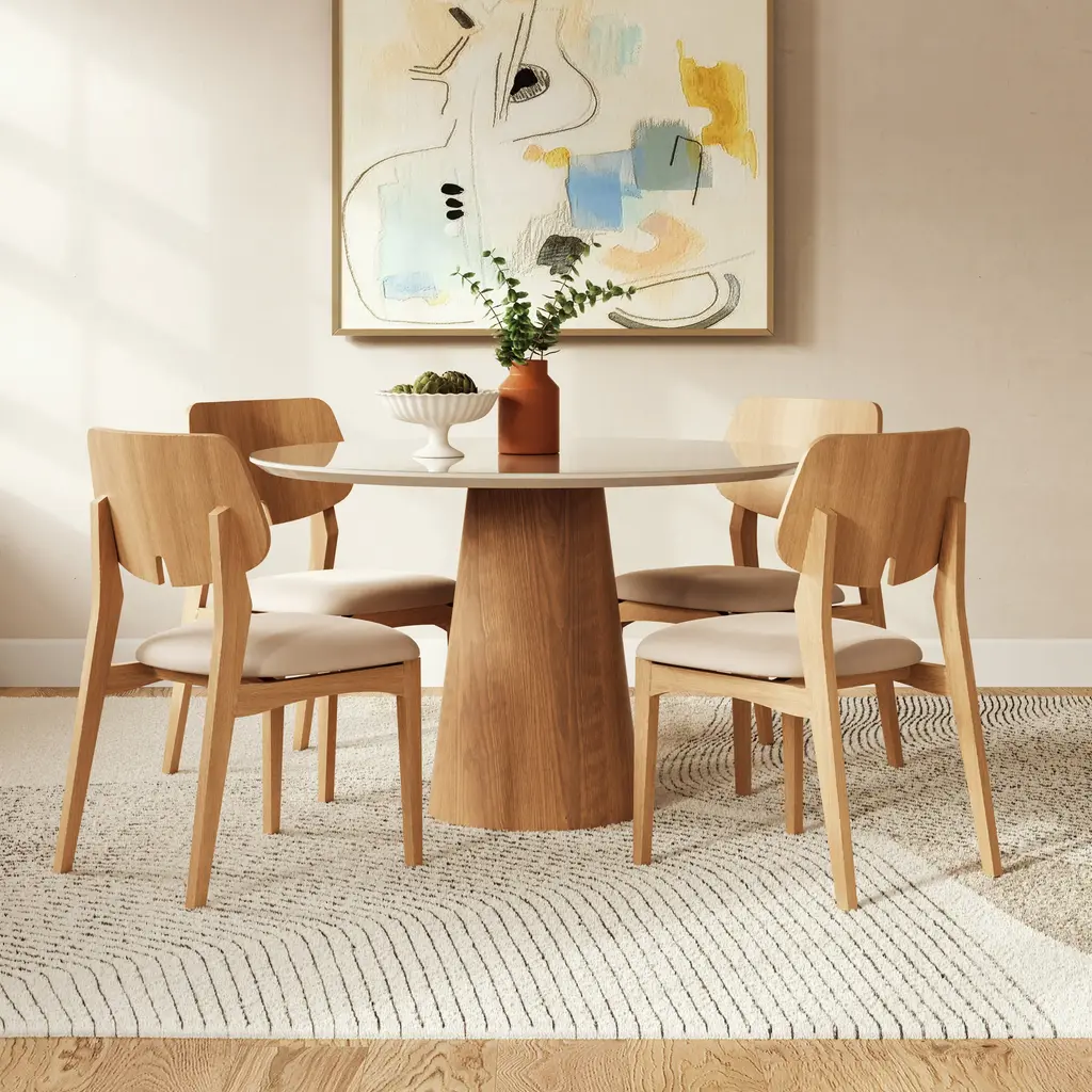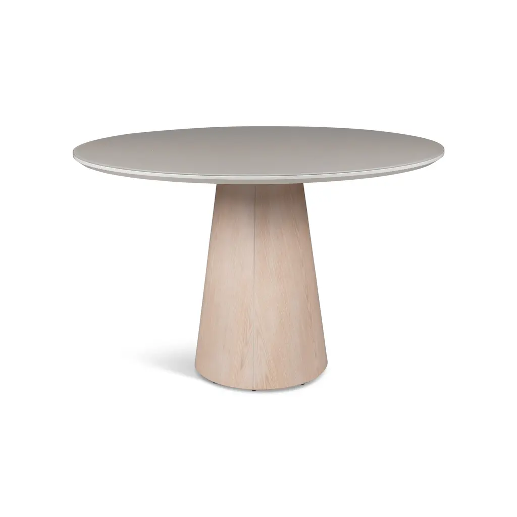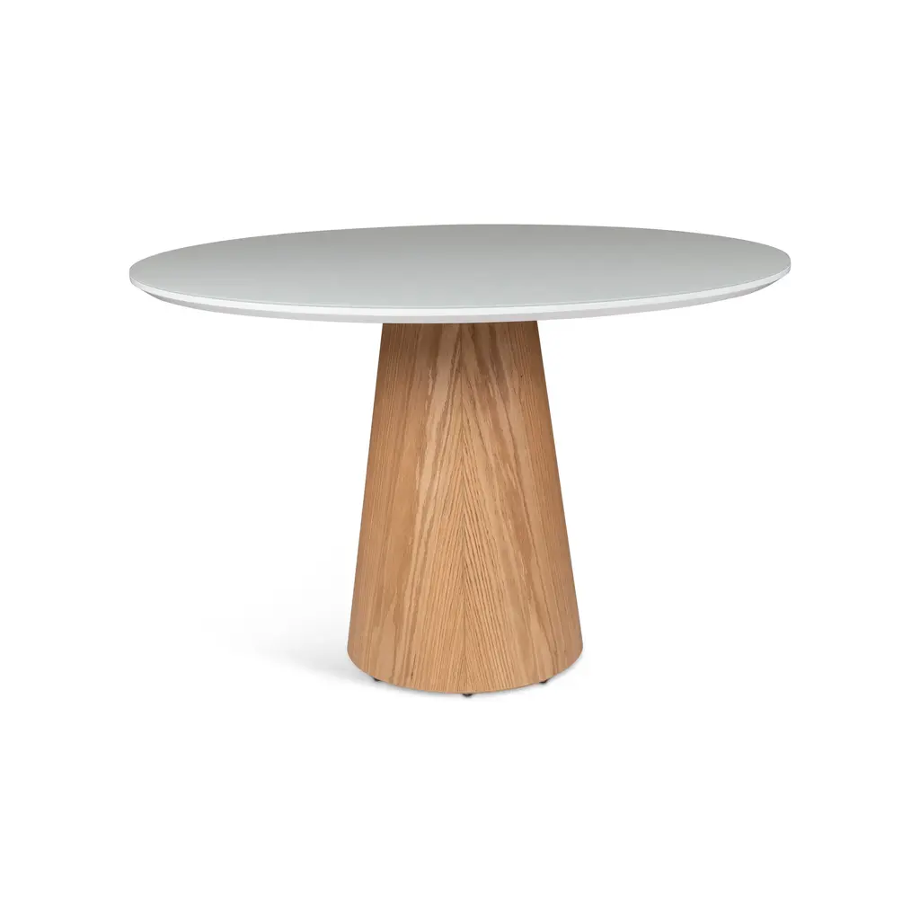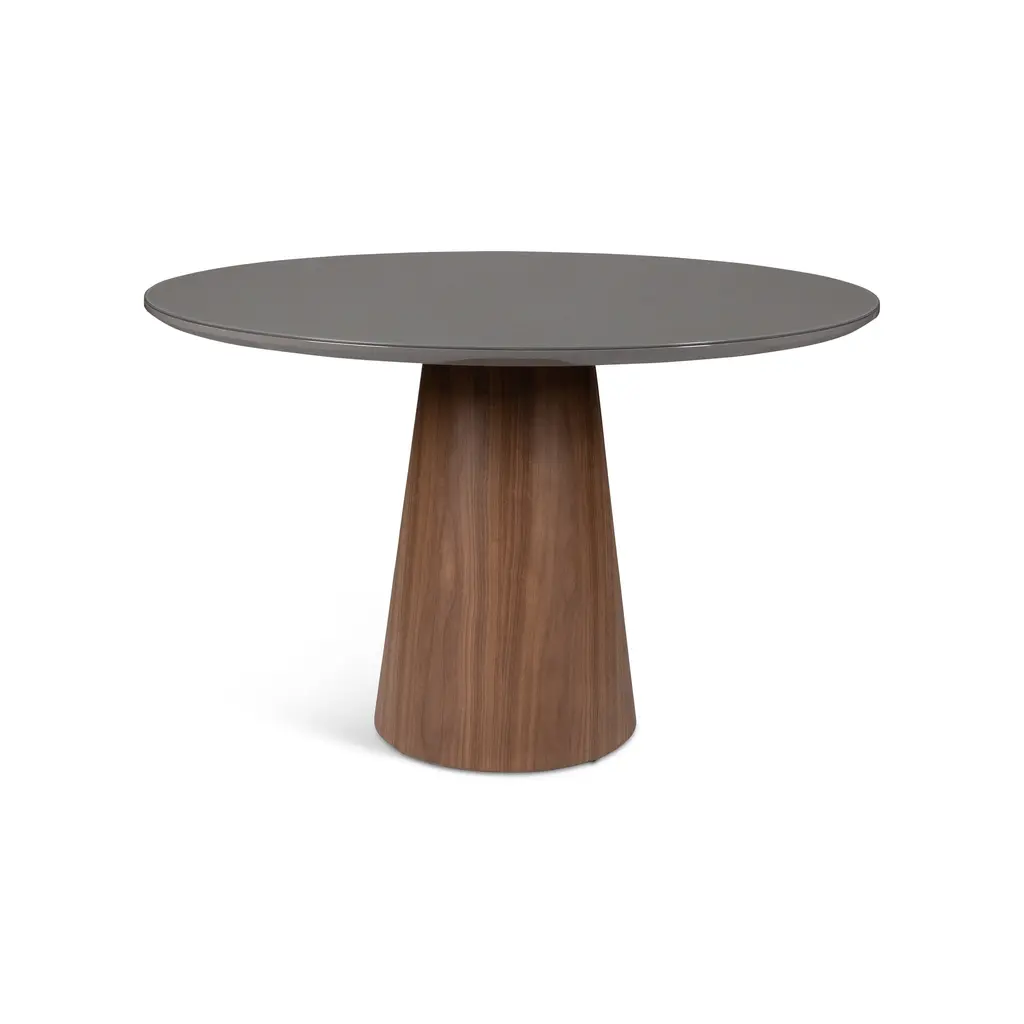 Infusing your dining room with modern flair, the Mona Round Dining Table with Glass Top from Urbia is a statement of understated Brazilian elegance. Crafted in Brazil, this table features a captivating lacquered glass top with exceptional clarity and depth. The sleek surface rests on a sculptural, conical pedestal base crafted from fine wood veneers for a sense of harmony and balance. Perfect for seating four to six guests, it's a sophisticated centerpiece for any contemporary dining room. Highlights: