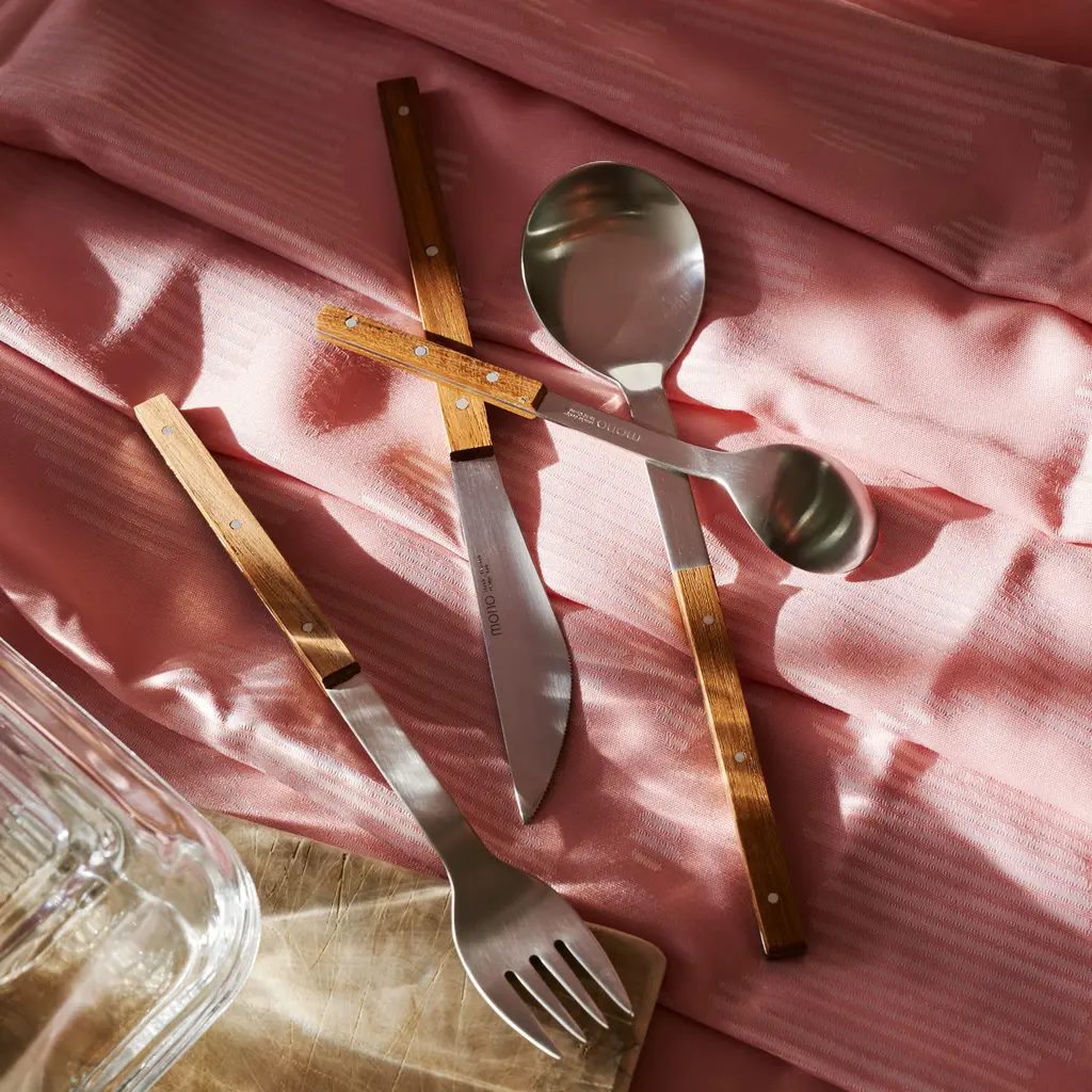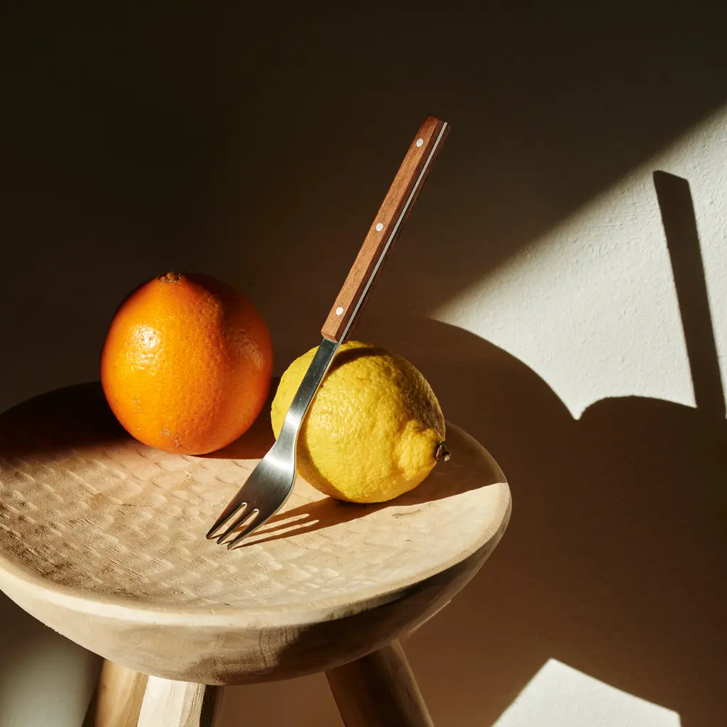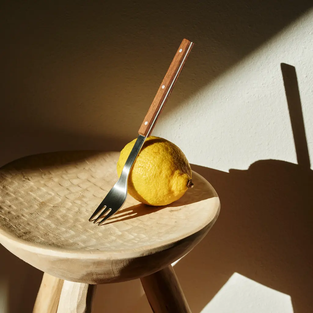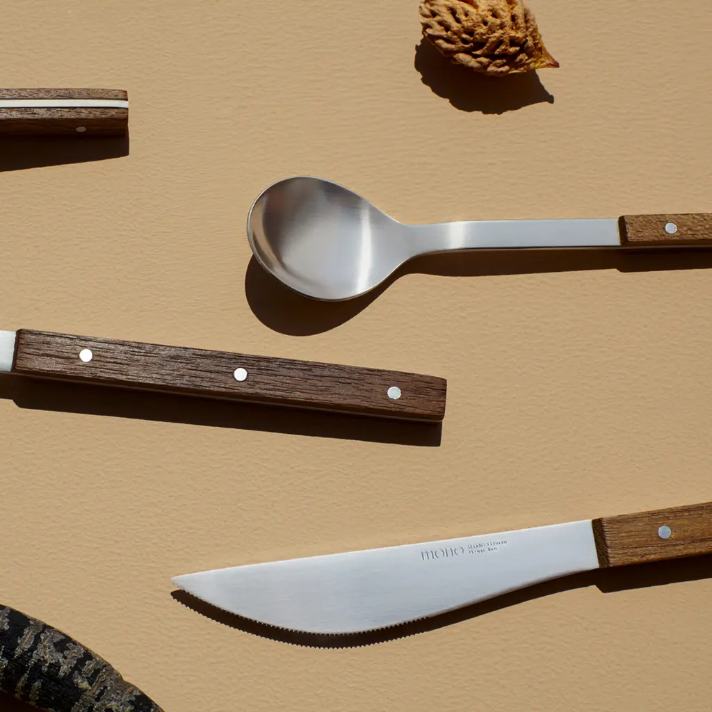 Bring a rustic accent to the dining table with the Mono T collection from German brand Mono. Introduced in the early 1960s, this flatware range complemented the minimalist forms of the popular Mono A collection with wood handles. This version boasts teak wood handles with a light brown color and with rivets on both sides. The natural wood adds warmth and contrast to the stainless steel flatware. With appropriate care, this collection lasts for decades even with daily use, gaining more character over time. Mono T comprises seven items, with products available either separately or in convenient sets. A matching design with black ebony handles is also available.