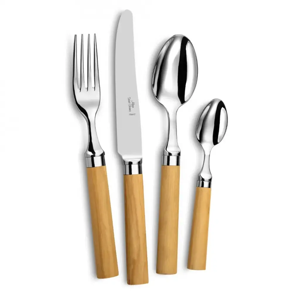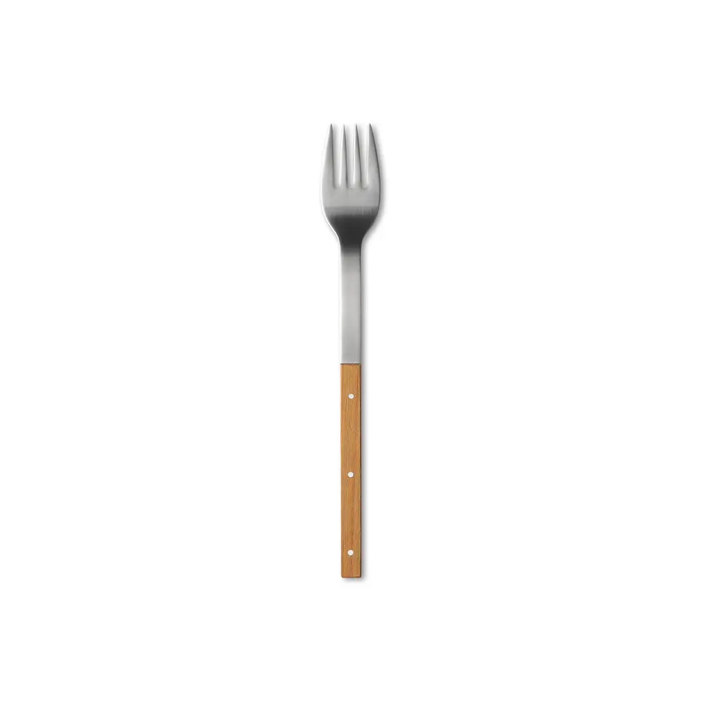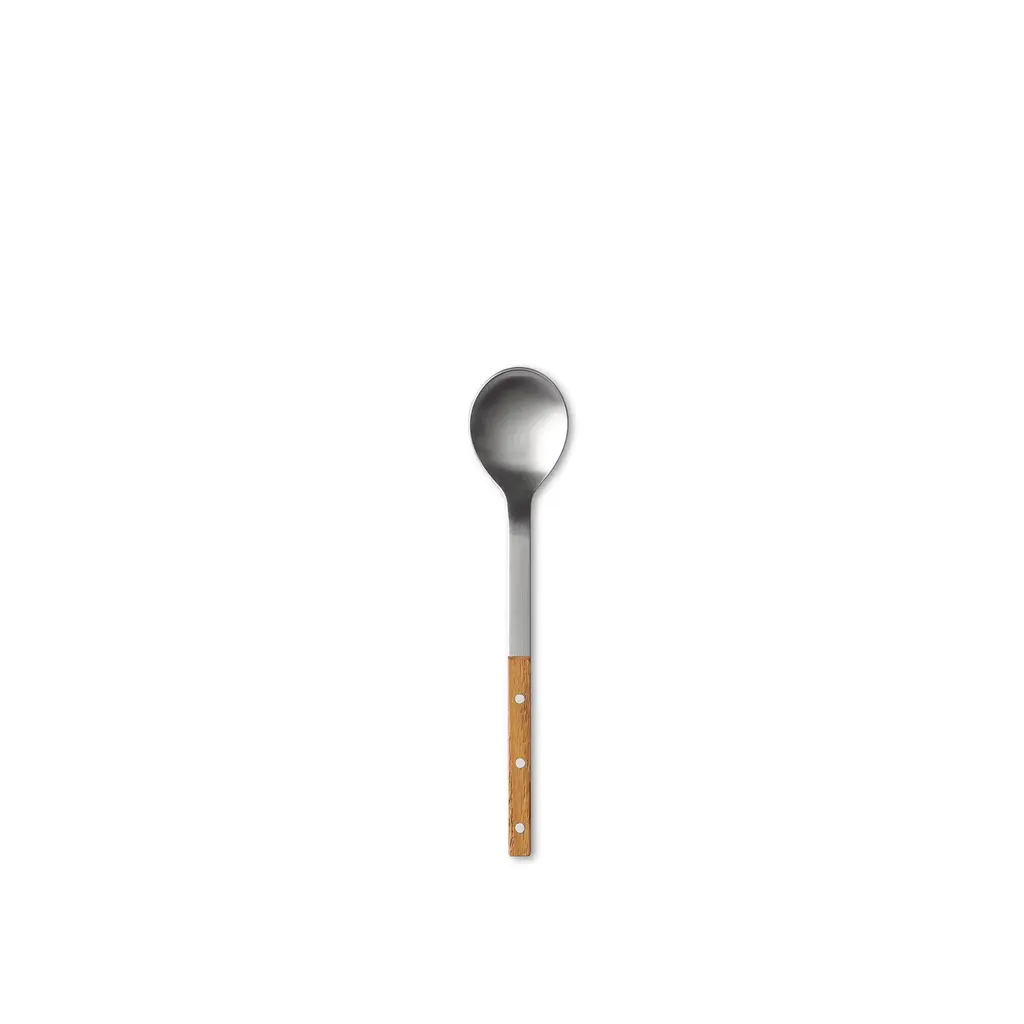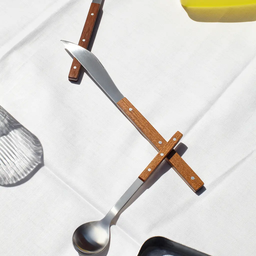 Bring a rustic accent to the dining table with the Mono T collection from German brand Mono. Introduced in the early 1960s, this flatware range complemented the minimalist forms of the popular Mono A collection with wood handles. This version boasts teak wood handles with a light brown color and with rivets on both sides. The natural wood adds warmth and contrast to the stainless steel flatware. With appropriate care, this collection lasts for decades even with daily use, gaining more character over time. Mono T comprises seven items, with products available either separately or in convenient sets. A matching design with black ebony handles is also available.
