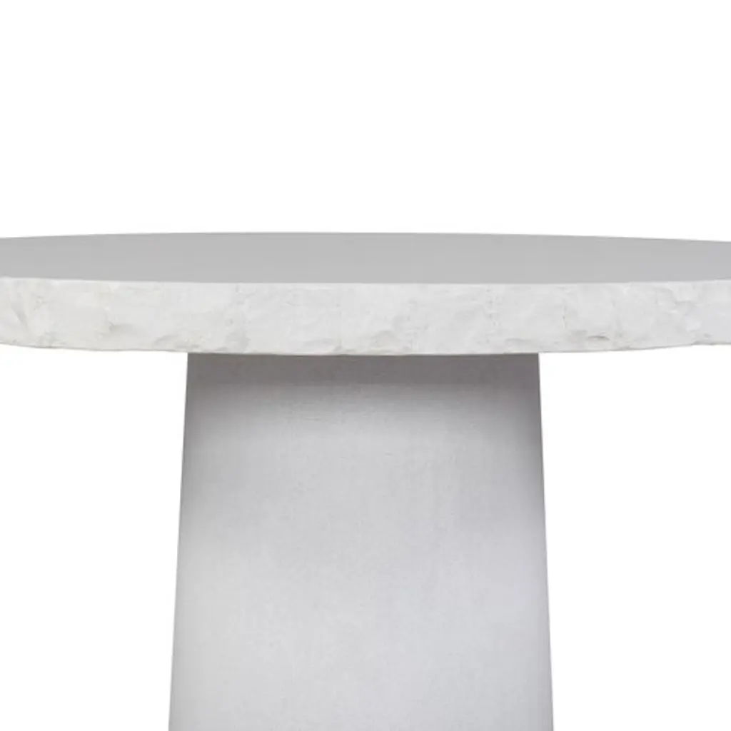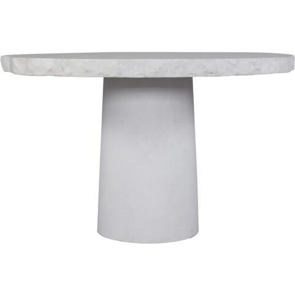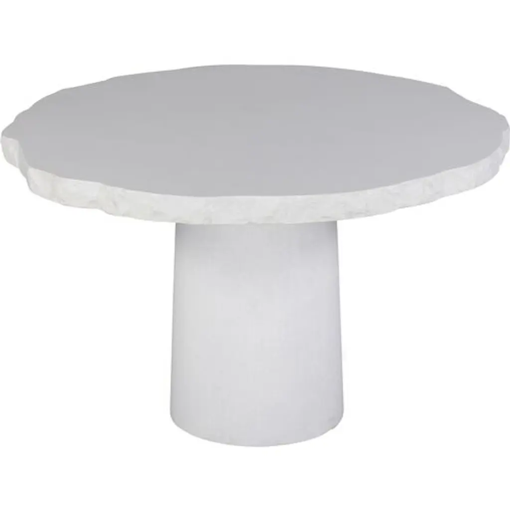 Beautiful enough for indoors yet durable enough for outdoors, this dining table features a raw-edge top resting on an elegant pedestal base. As many as six people can fit comfortably around the table.