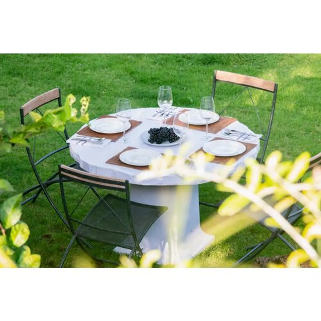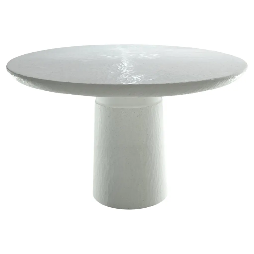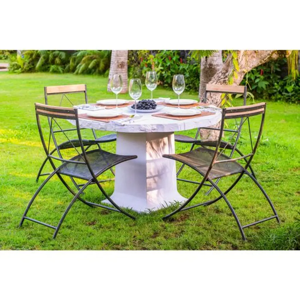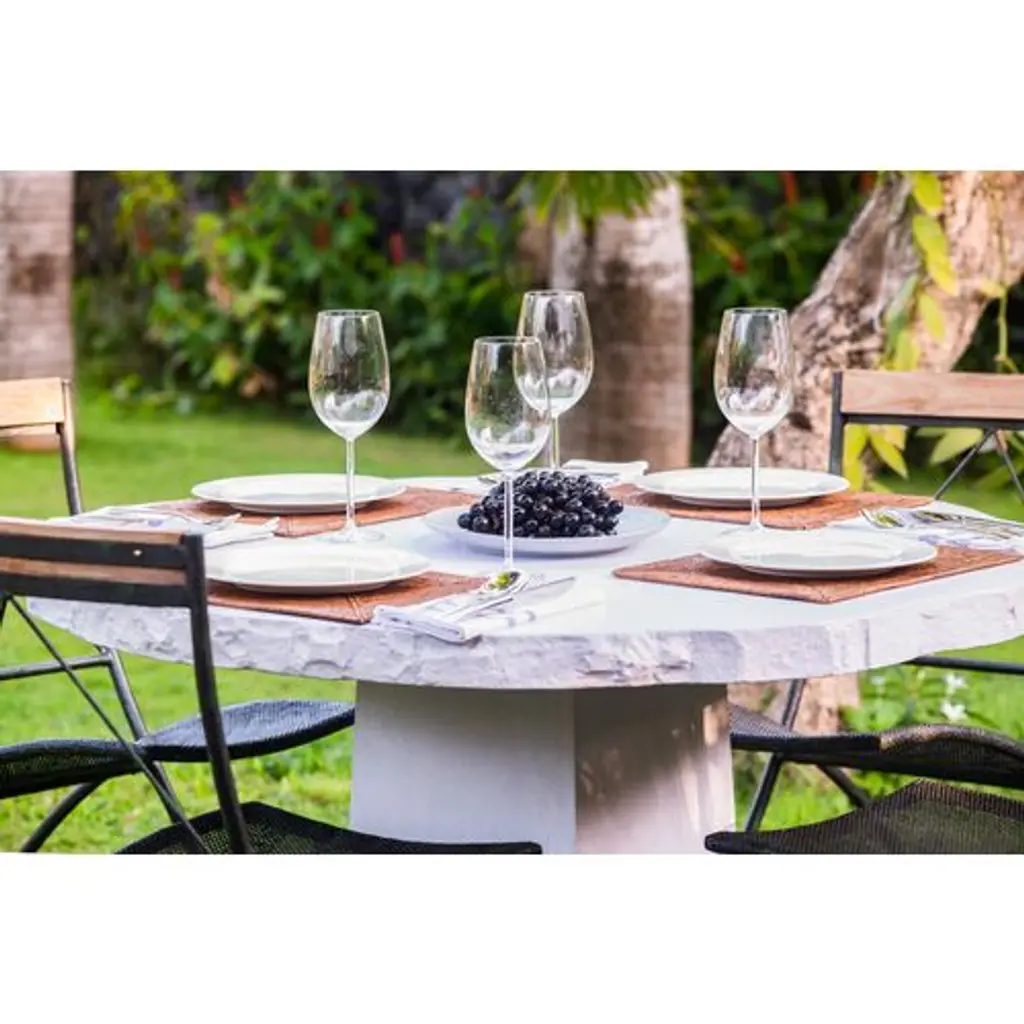 Beautiful enough for indoors yet durable enough for outdoors, this dining table features a raw-edge top resting on an elegant pedestal base. As many as six people can fit comfortably around the table.
