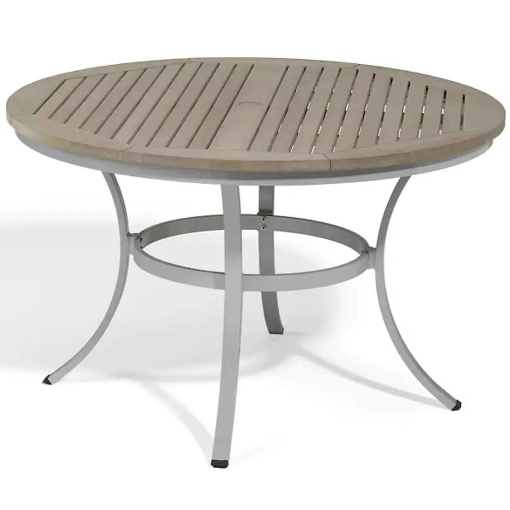 A sleek bronze finish calls attention to the slatted top and crisp, clean lines on this outdoor aluminum dining table. Accommodates four guests.
