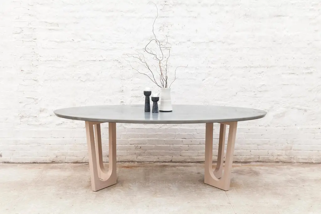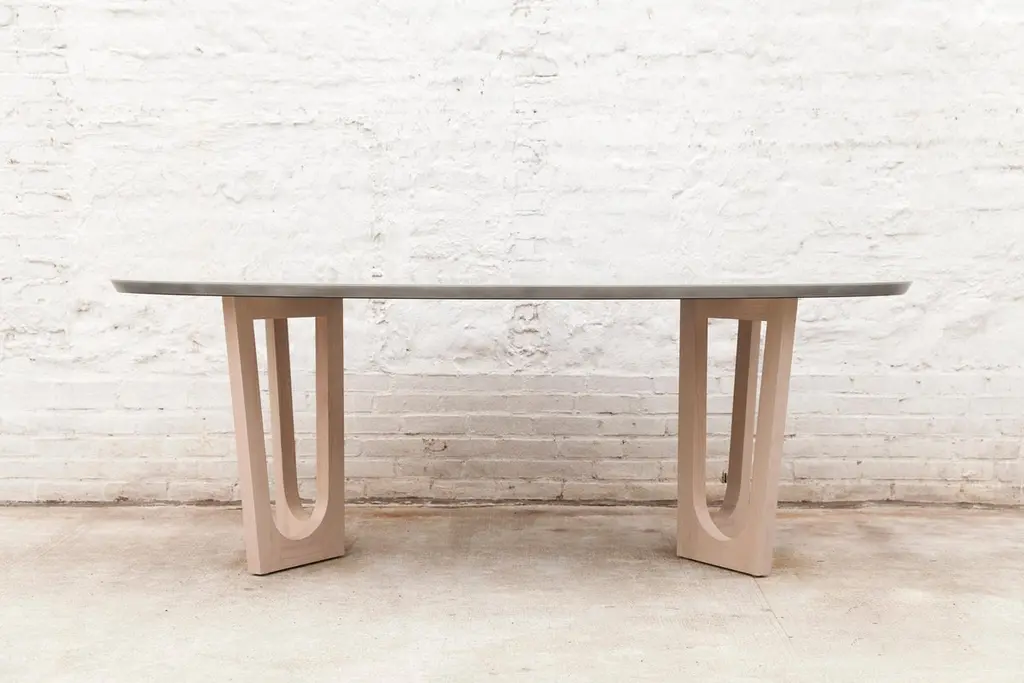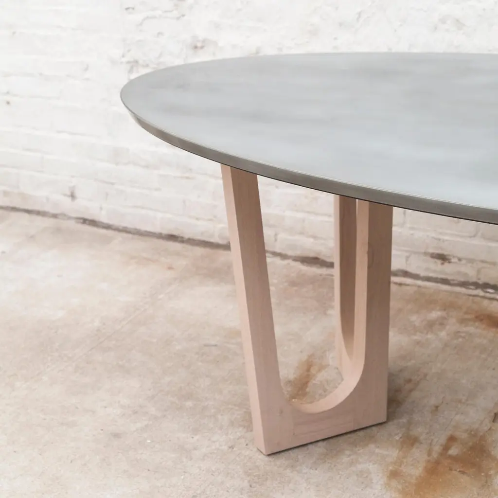 The elegant Moore dining table is a striking addition to any space. The Oval shaped zinc encased in epoxy resin tabletop is non-porous, making it the ideal surface for food and drinks. Materials: Zn-R (Zinc encased in Resin), white washed oakStandard dimensions:L 72” / W 42” / H 30” L 80” / W 48”/ H 30” Pricing is for 80" table shownL 96” / W 54” / H 30”Available Pb-R (Metal encased in epoxy resin) and finishes: Brz-R (Bronze): Blackened/burnished, light patina/burnished, brushed. Zn-R (Zinc): Blackened/burnished, light patina/burnished, brushed. Cu-R (Copper): Blackened/burnished, light patina/burnished, brushed. Crs-R (Cold rolled steel): Blackened, burnished. Al-R (Aluminum): Burnished. Custom sizing and finishes available.
