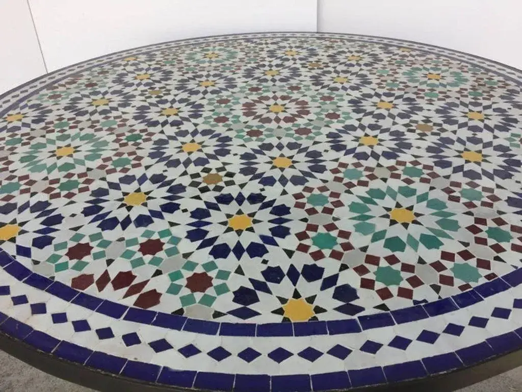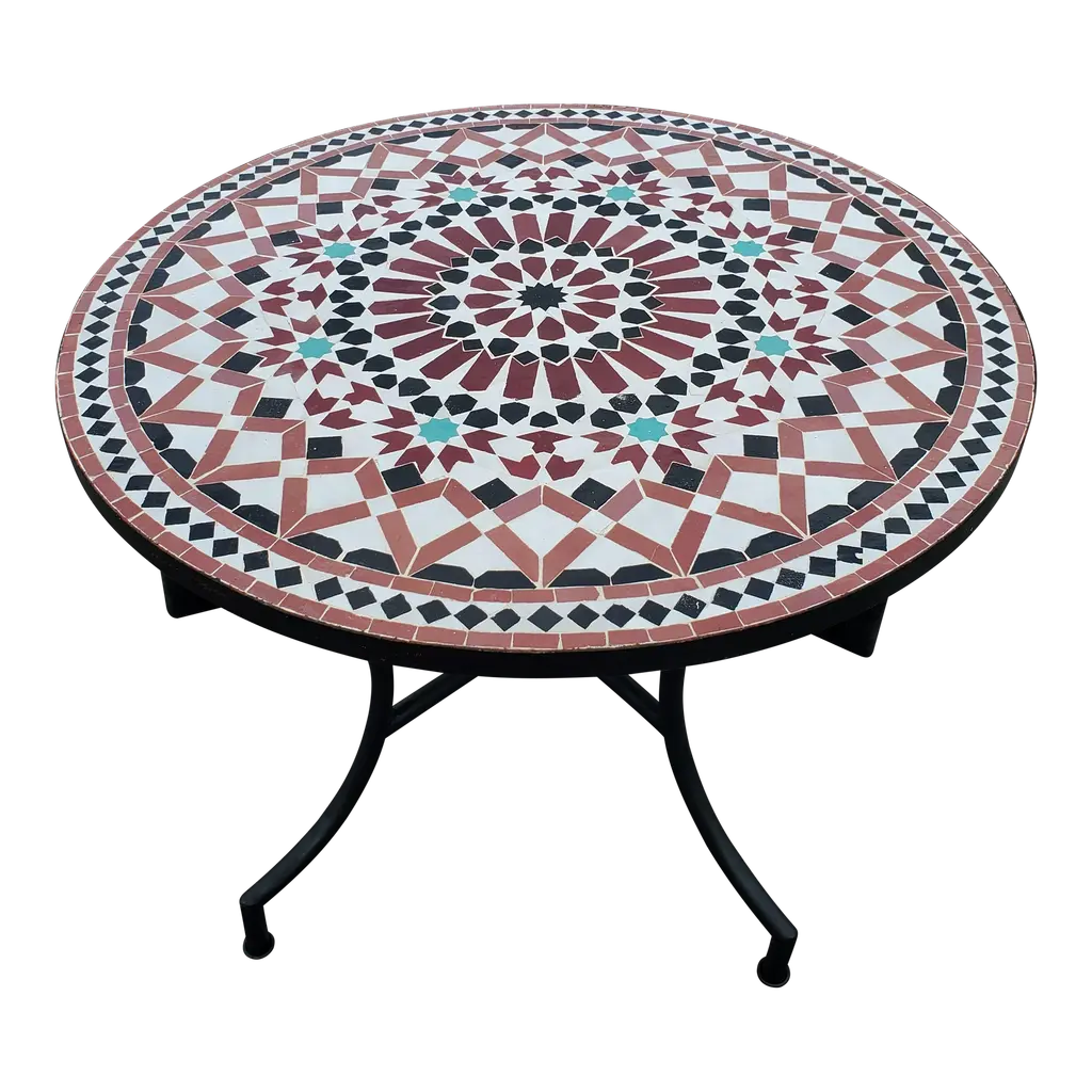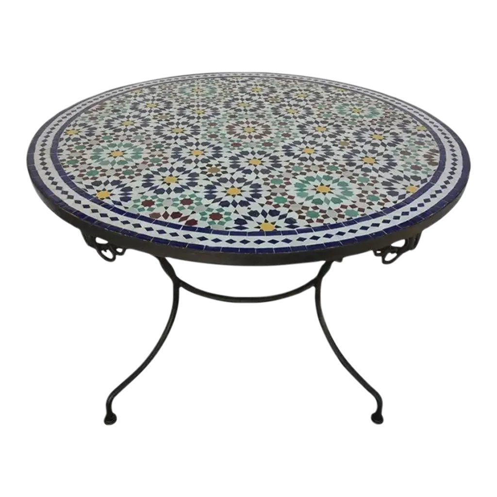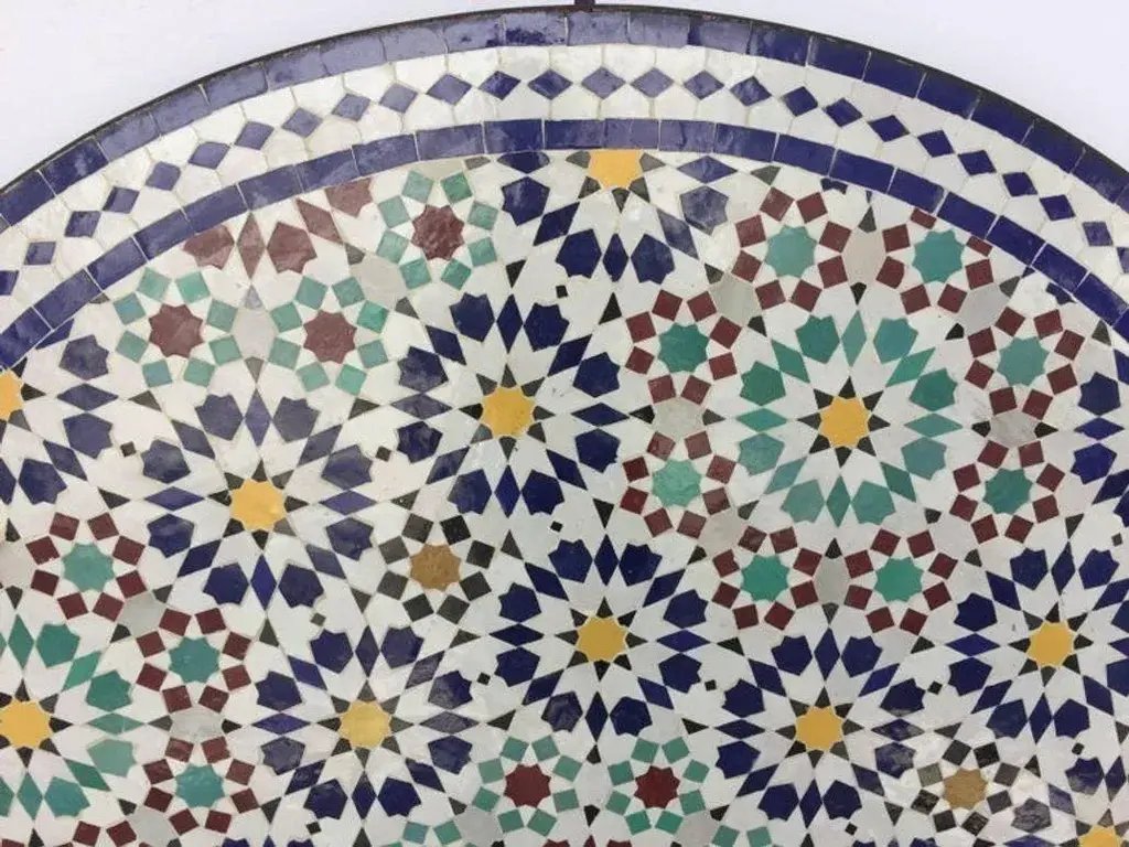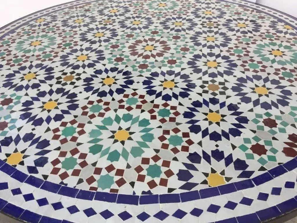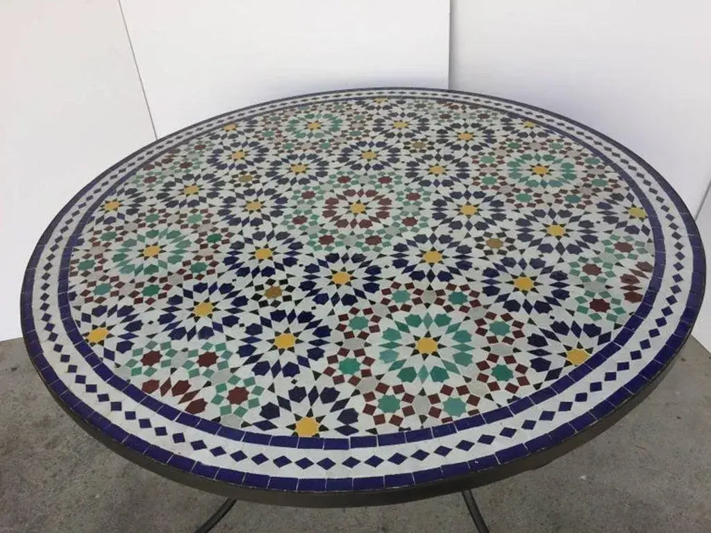Moroccan round mosaic tile table delicately handcrafted by expert artisans in Fez, Morocco, using reclaimed old glazed tiles inlaid in concrete with traditional Islamic Moorish geometrical design in white, blue, red, green and green colors. Moroccan mosaic tables evoke the charm of another world, made by hand with very simple tools each reflects the spirit of the maker. The tile table sit on an iron hand-forged base in black color. Great to use indoor or outdoor as a dining table or kitchen table. This patio, garden table will last a life time, tiles are inlaid into concrete. Very easy to maintain. Comes in two pieces, the top is not attached to the base. Size is 47" D x 30" H. two tables available, price is for one. Will last a life time