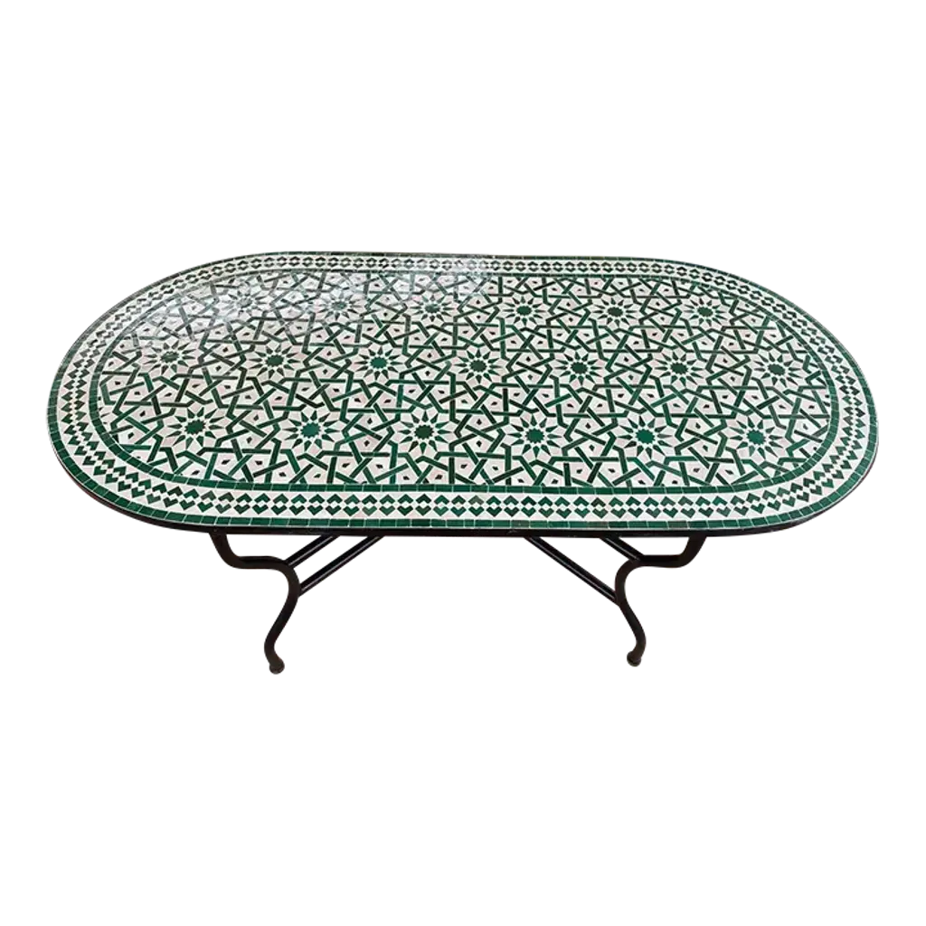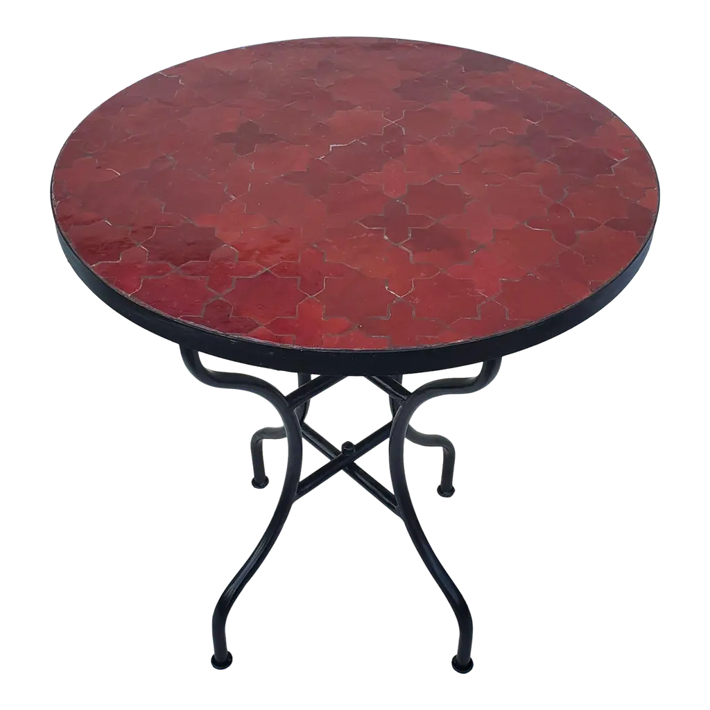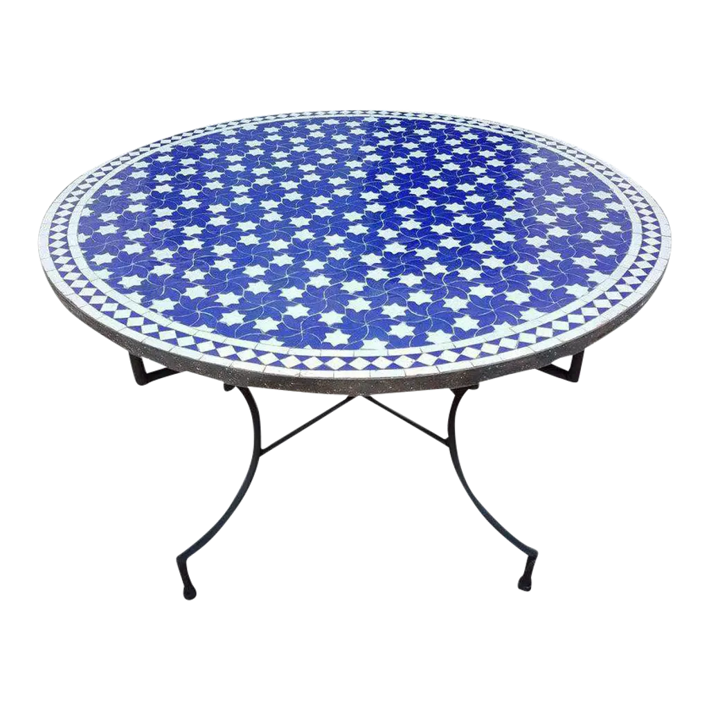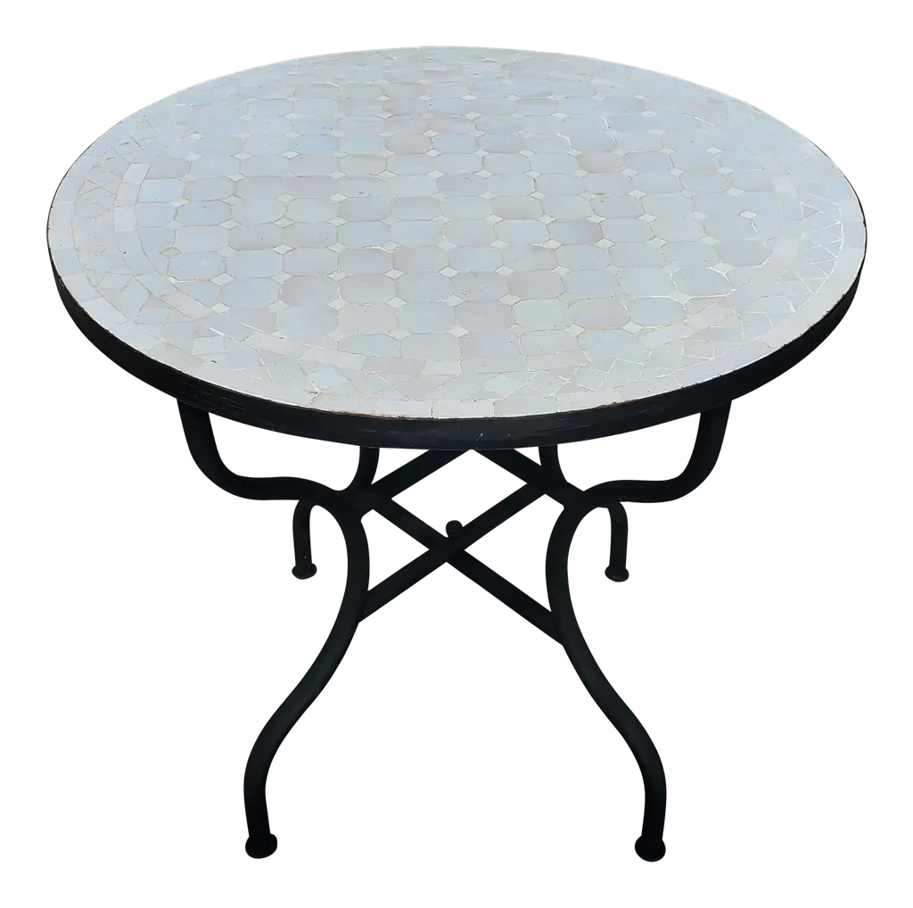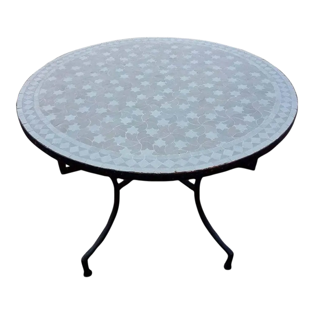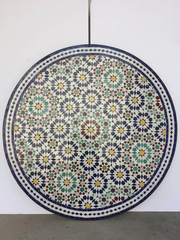 Moroccan round mosaic tile table delicately handcrafted by expert artisans in Fez, Morocco, using reclaimed old glazed tiles inlaid in concrete with traditional Islamic Moorish geometrical design in white, blue, red, green and green colors. Moroccan mosaic tables evoke the charm of another world, made by hand with very simple tools each reflects the spirit of the maker. The tile table sit on an iron hand-forged base in black color. Great to use indoor or outdoor as a dining table or kitchen table. This patio, garden table will last a life time, tiles are inlaid into concrete. Very easy to maintain. Comes in two pieces, the top is not attached to the base. Size is 47" D x 30" H. two tables available, price is for one. Will last a life time