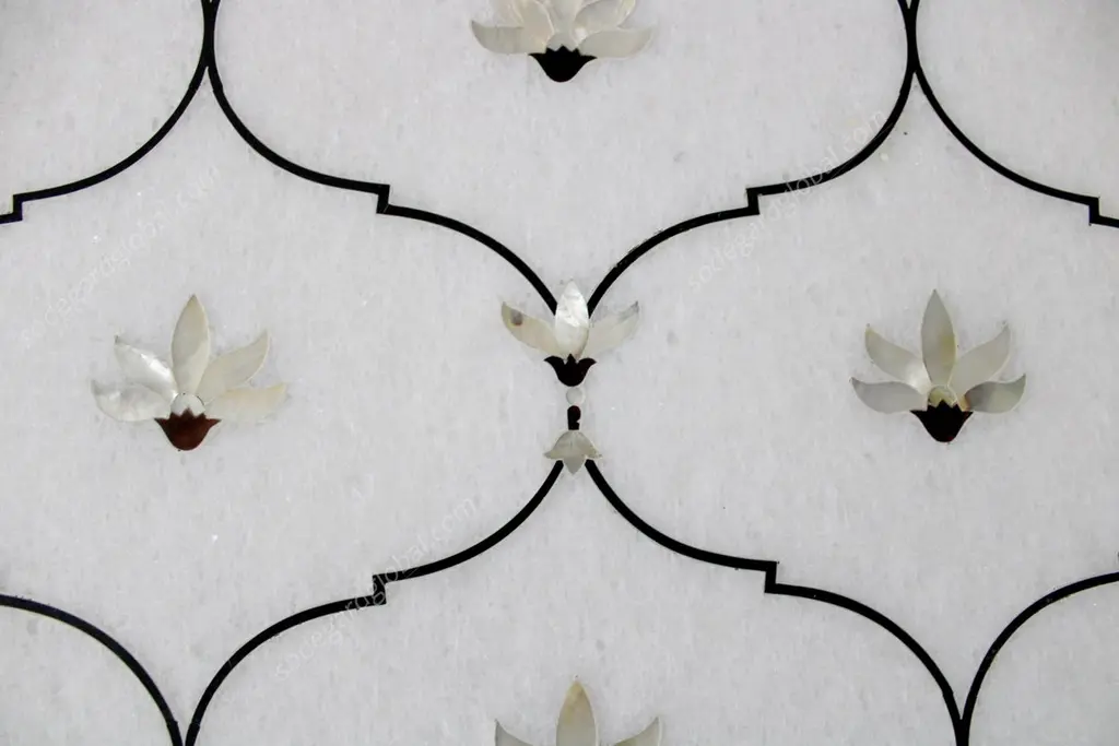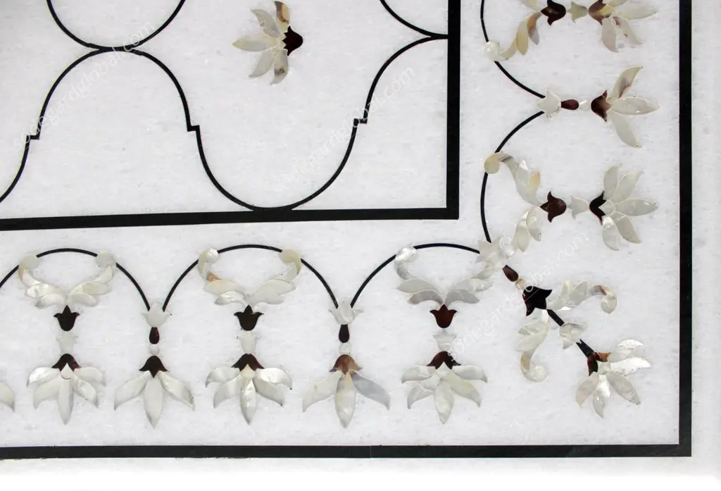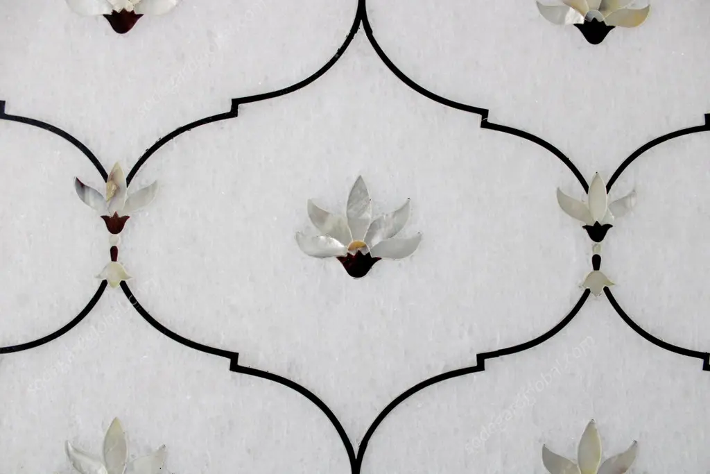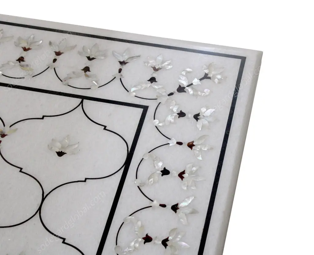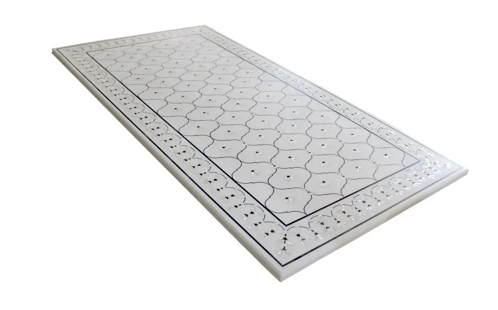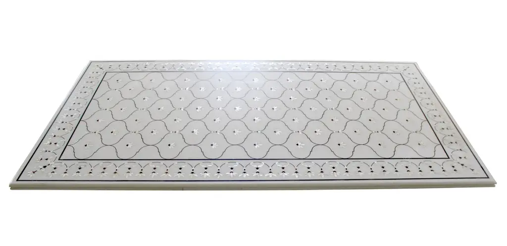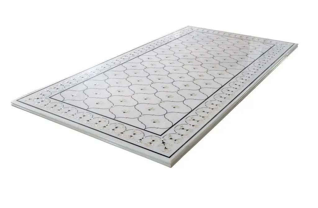 This stunning dining table top exhibits one of the most striking motifs of the mughal architecture in India. The lotus motif is inlaid using mother of pearl on the whitest of the marble using the centuries old technique of pietra dura / pacchikari. Mughal Lotus Inlay Dining Table 'Top Only'Size- 90" x 48" x 02" H.Materials - Marble, Hand-CarvedBuyer Cancellation-The cancellation charge is 25% which increases to 50% if the production is started.Prices do not include shipping from India (for custom orders) or our MN warehouse (items from stock). That will be additional.