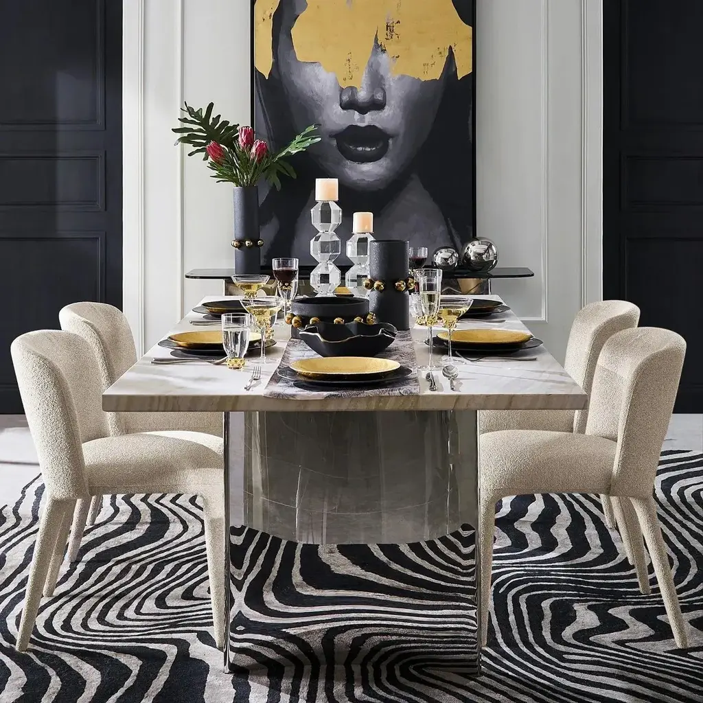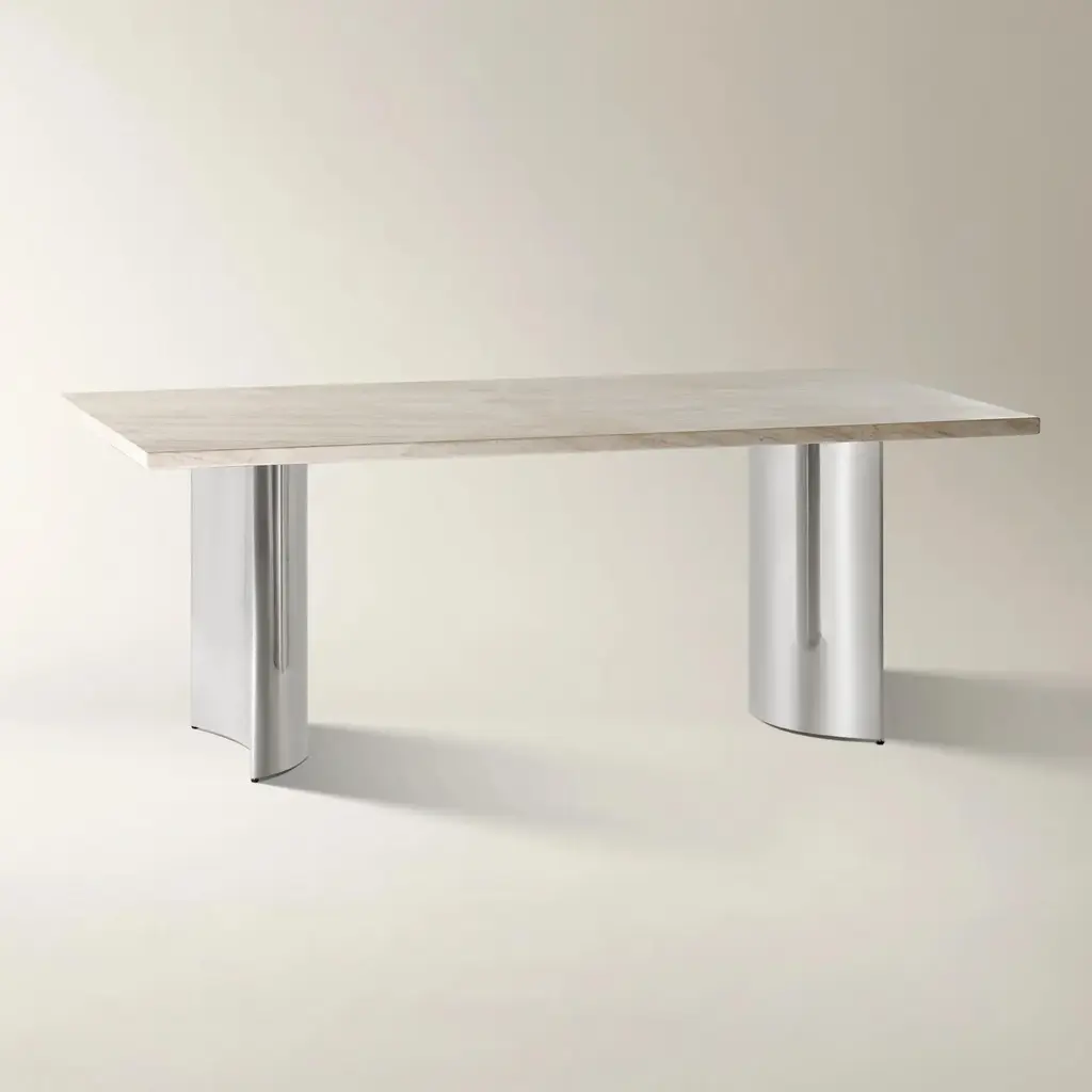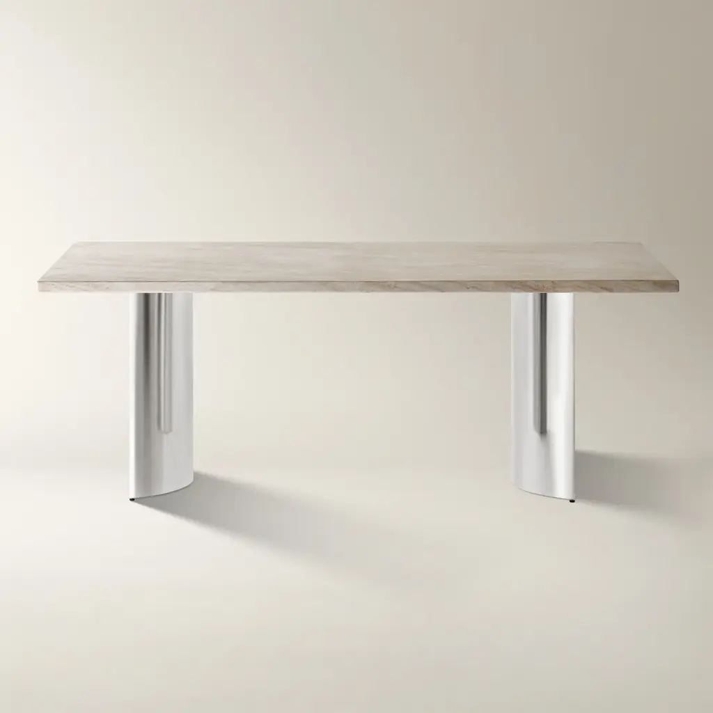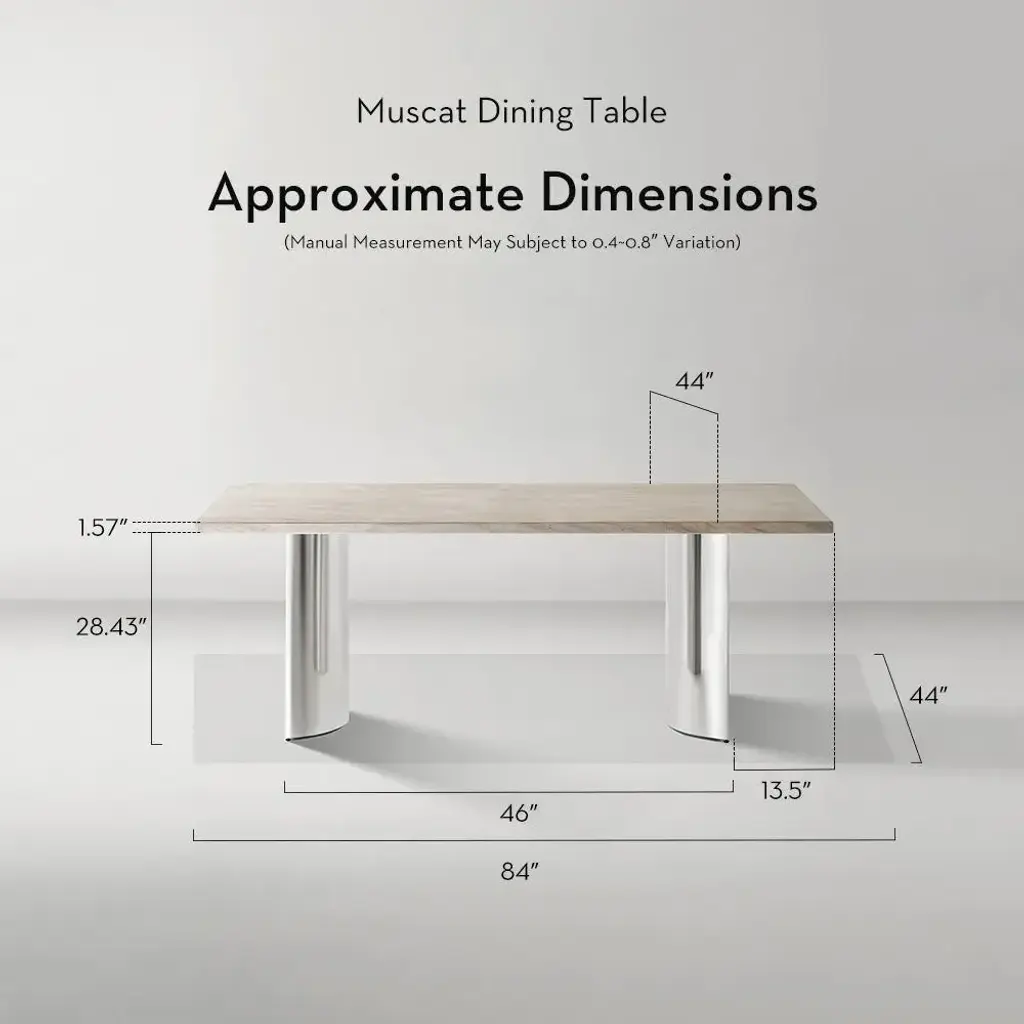 Bring a touch of warmth and sophistication to your dining room with the Muscat Dining Table in Tan. The travertine marble top, with its unique veining and warm tones, pairs beautifully with the polished stainless steel base for a look that is both refined and inviting. A versatile design that complements a variety of decor styles, it’s the perfect foundation for your dining moments.ZG Exclusive