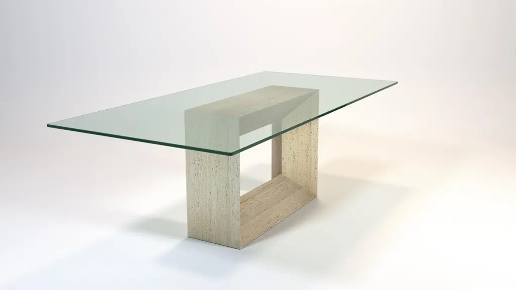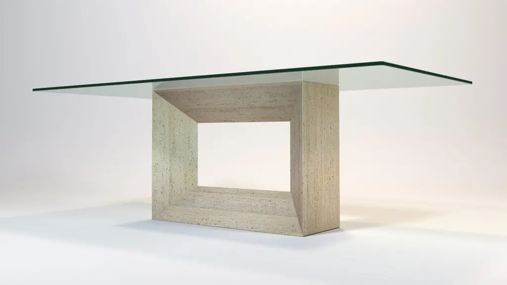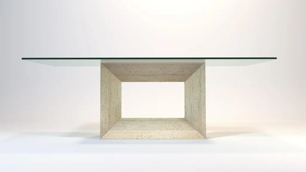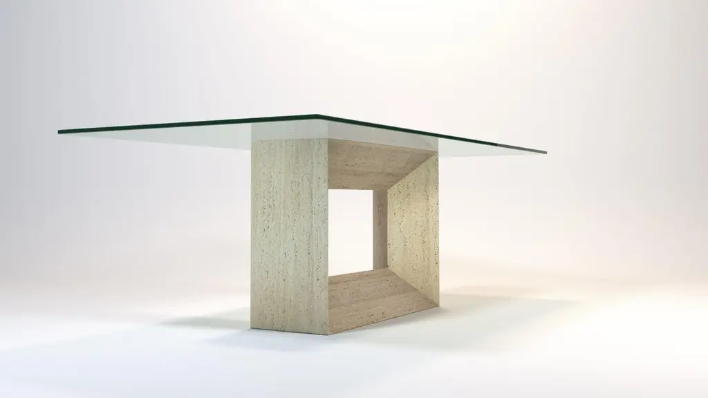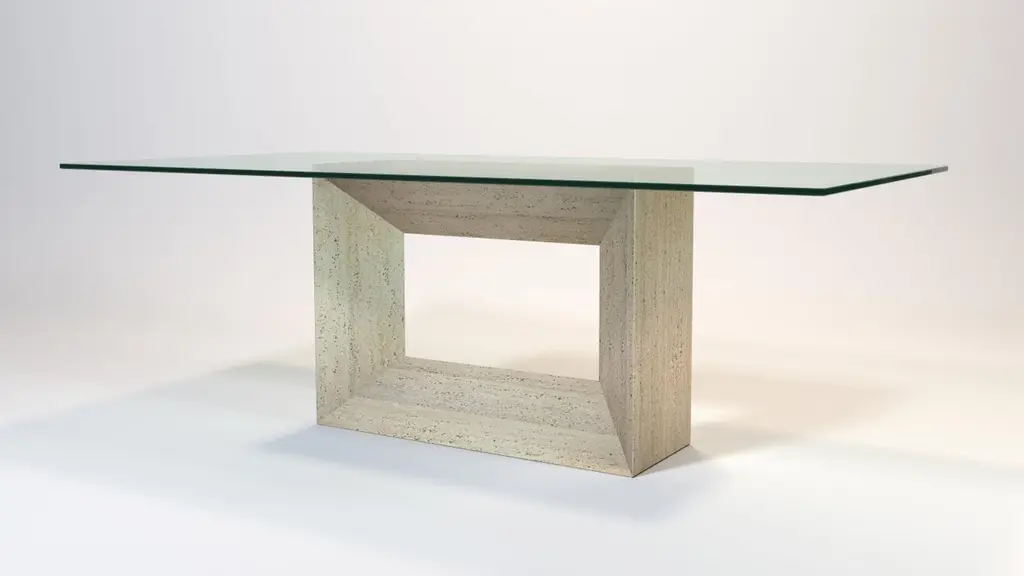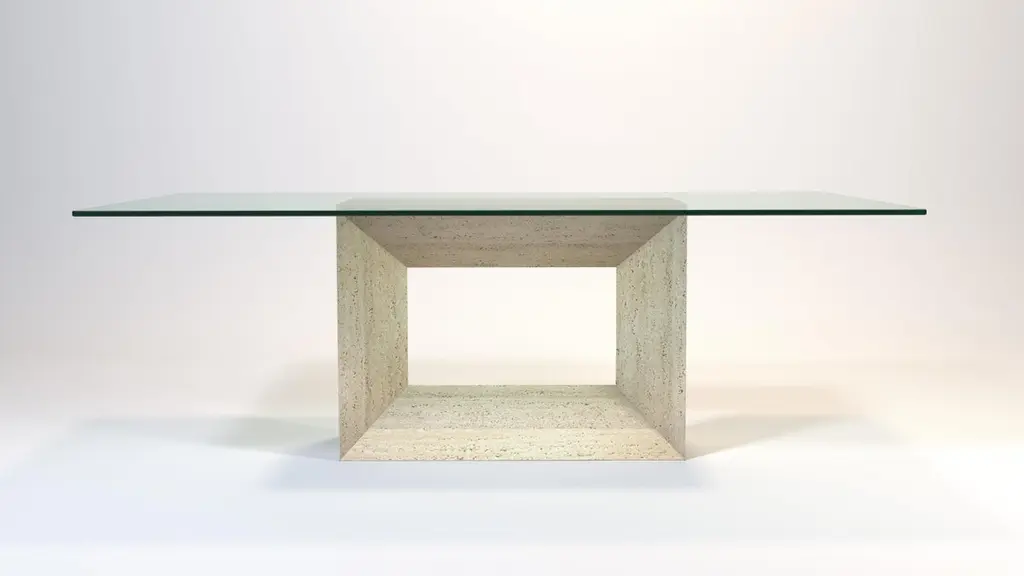 MYA Dining Table Italian Travertine Marble Contemporary Design Joaquín Moll Meddel Spain.The MYA travertine marble dining table is a perfect choice to upgrade a dining room and bring style, class, elegance and luxury.This wonderful marble dining table consists of a travertine marble pedestal with 15 mm transparent glass top. The travertine marble structure is a hollow structure of geometric shapes with angles that make this piece of furniture a unique and dizzyingly designed item.The shape of the pedestal is a cube with a hollow inside and the sides and inner edges angled with an inner junction point. The execution of this piece shows a great mastery in the work in marble and natural stone that Meddel contains. All Meddel tables are made in their facilities in Segovia, Spain.The designer of this MYA dining table is Joaquín Moll, a marble furniture designer with 40 years of experience in furniture design. His pieces are of impeccable design and his base is the perfect proportion turning marble into a light material.MYA is light and light and its marble structure is hollow, which reduces the weight of the structure. Joaquín Moll's tables are delicate and contemporary in style. The design with natural Roman travertine marble in furniture is perfect to combine with all types of furniture. The cream tone of the travertine together with the contemporary design of the MYA dining table are key to always combine with all interiors and adapt to changes in decoration.MYA is a contemporary design travertine marble table custom made in a wide selection of marbles.Marble has a great added value in interior design, especially when it is a sculptural piece of furniture such as the furniture of Joaquín Moll, a prestigious designer specialized in contemporary design furniture pieces in natural stone.