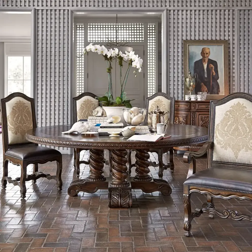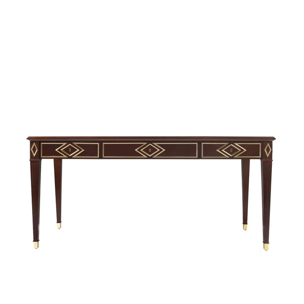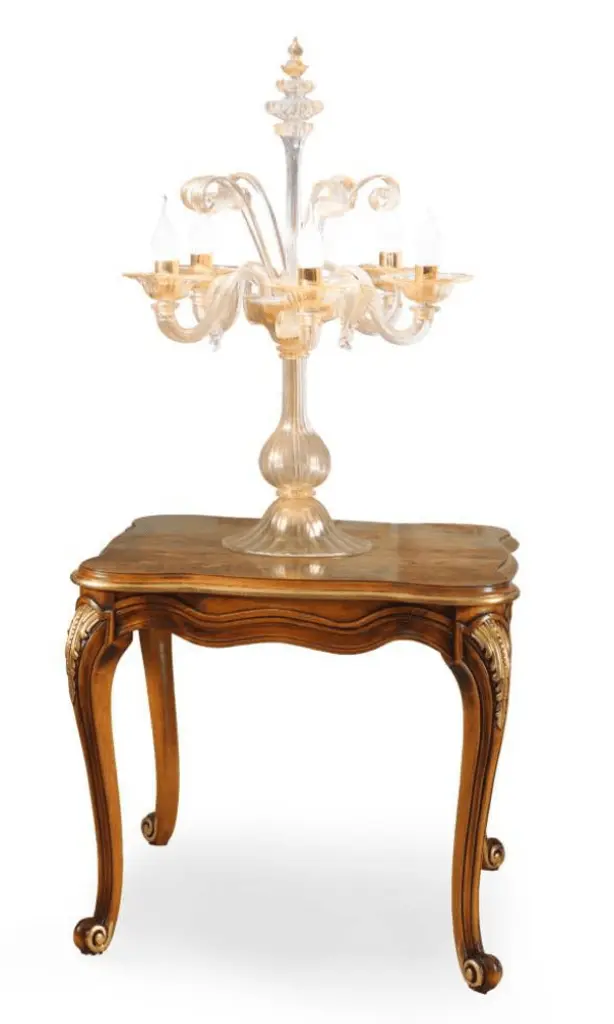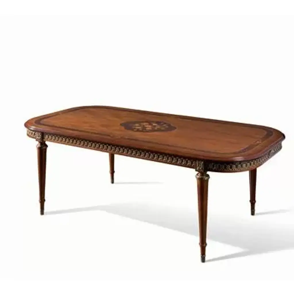 The unrivaled beauty of this dining table with extendible top lies in the combination of its superb inlays in rosewood, walnut briar, and feathered ash with meticulously carved details - accented with gold leaf - that embellish the tapered profile of the four supporting legs. Especially mesmerizing as addition to light color palettes, this design will take center stage in any decor with its artistic flair.