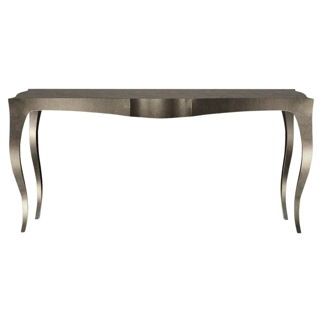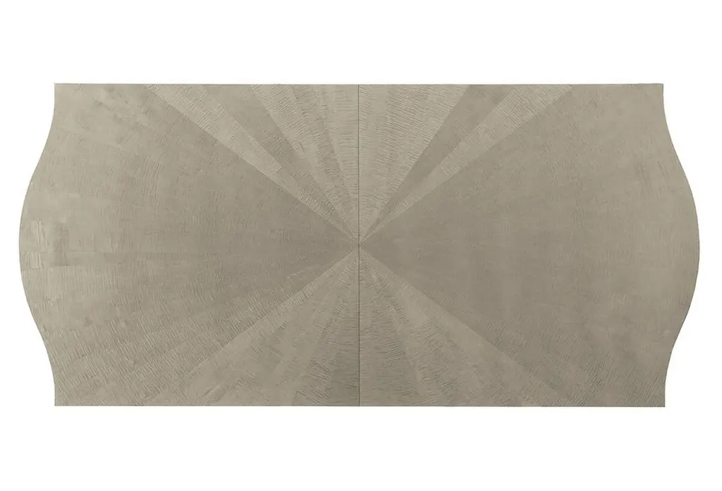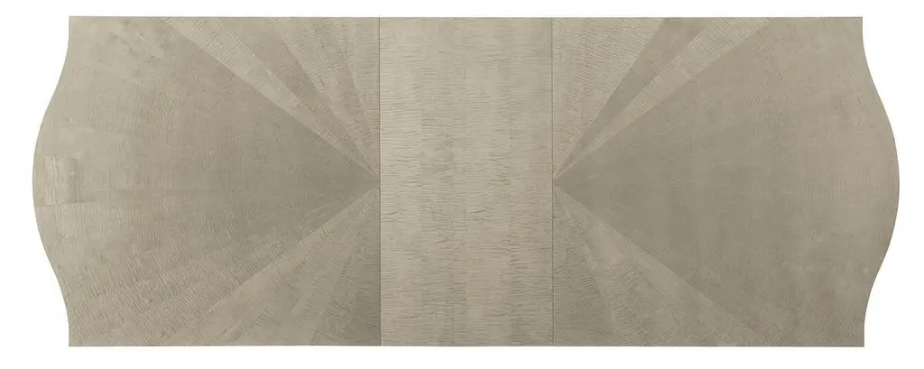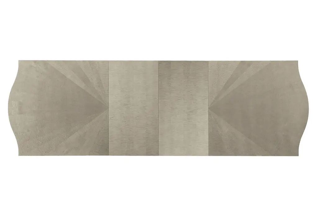 Perfect for a family gathering or sophisticated soirée, this dining table is beautifully carved of pine and birch with a removable leaf to accommodate anywhere from 12 to 14 guests. A sleek silver-leaf finish and impressive maple parquetry complete the design in high style.
