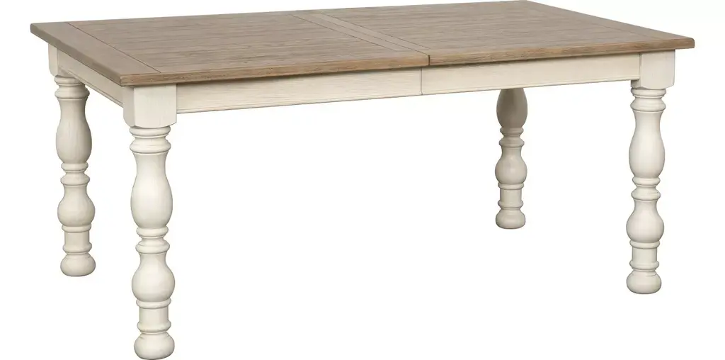 Our Nantucket dining table boasts classic charm and grandeur. With a white oak rectangle top that comes with one 18-inch leaf for easy entertaining and featuring a white and driftwood two-tone finish, this piece makes a bold statement. Designed for the ultimate entertainer, this table is inviting and ideal for get-togethers.