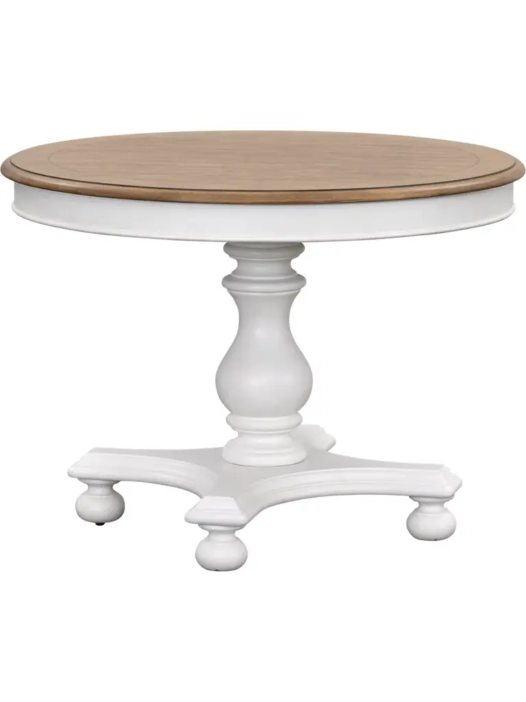 Gather around for festive fare on our Nantucket round pedestal dining table. A two-tone white and driftwood finish gives this dining table a distinct farmhouse charm. This piece is available in either a 42" top with no leaf or a 48" top that easily expands into an oval shape to create a space fit for family gatherings with one 12" leaf. Please select your size before adding to cart.