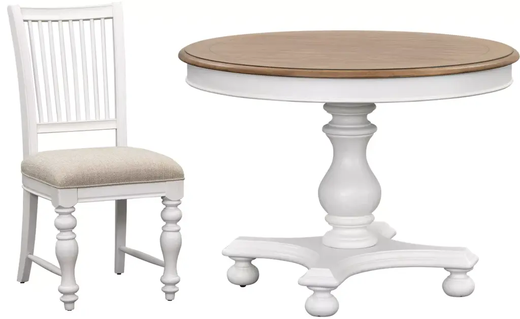 Gather around for festive fare on our Nantucket round pedestal dining table. A two-tone white and driftwood finish gives this dining table a distinct farmhouse charm. This piece is available in either a 42" top with no leaf or a 48" top that easily expands into an oval shape to create a space fit for family gatherings with one 12" leaf. Please select your size before adding to cart.