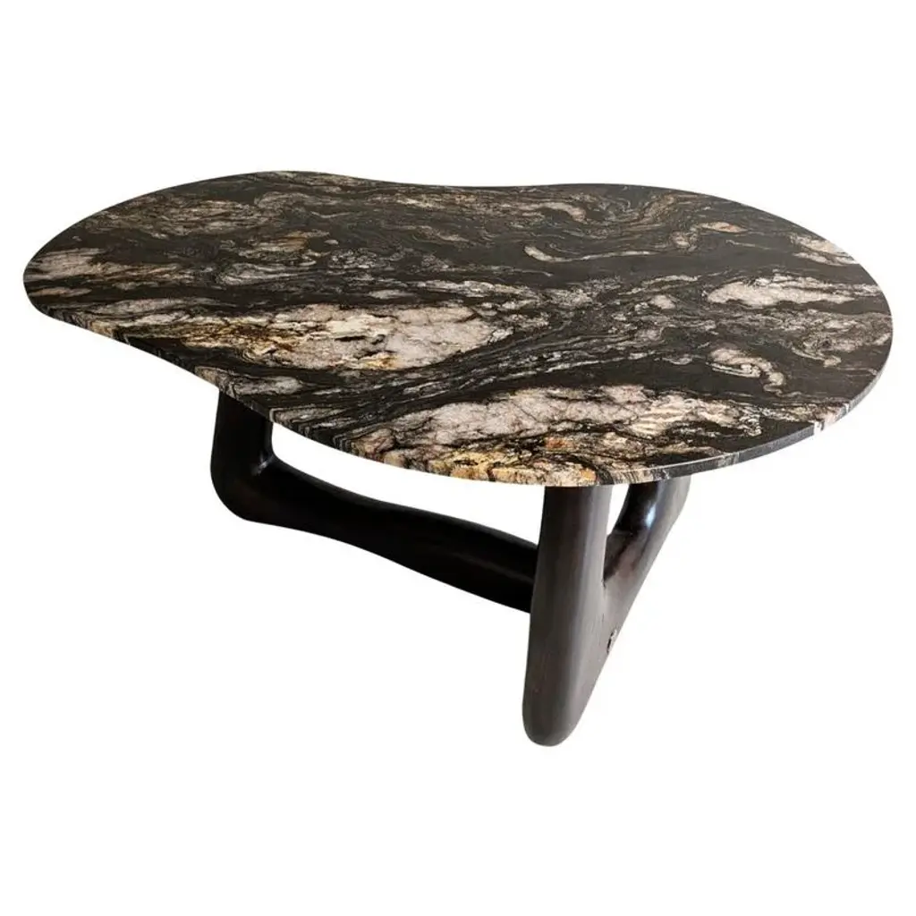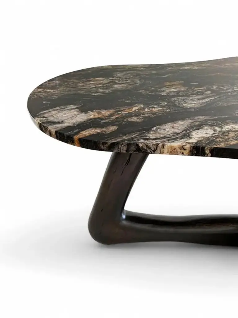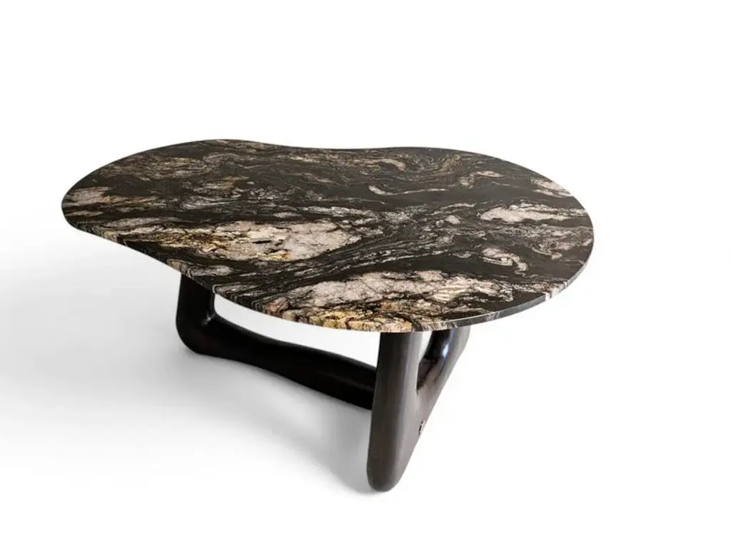 Narco teak collection dining table pebble by amber x iñigo calleja dimensions: w 150 x d 110 x h 75 cm. Materials: dry teak trunks base, emperor black granite top, charred and stained pitch black, matt finish.