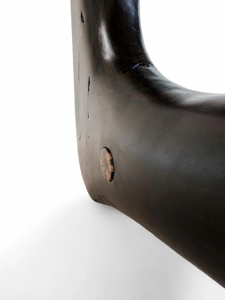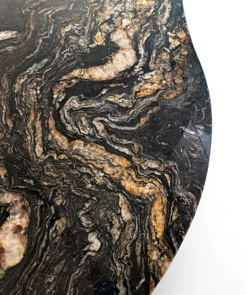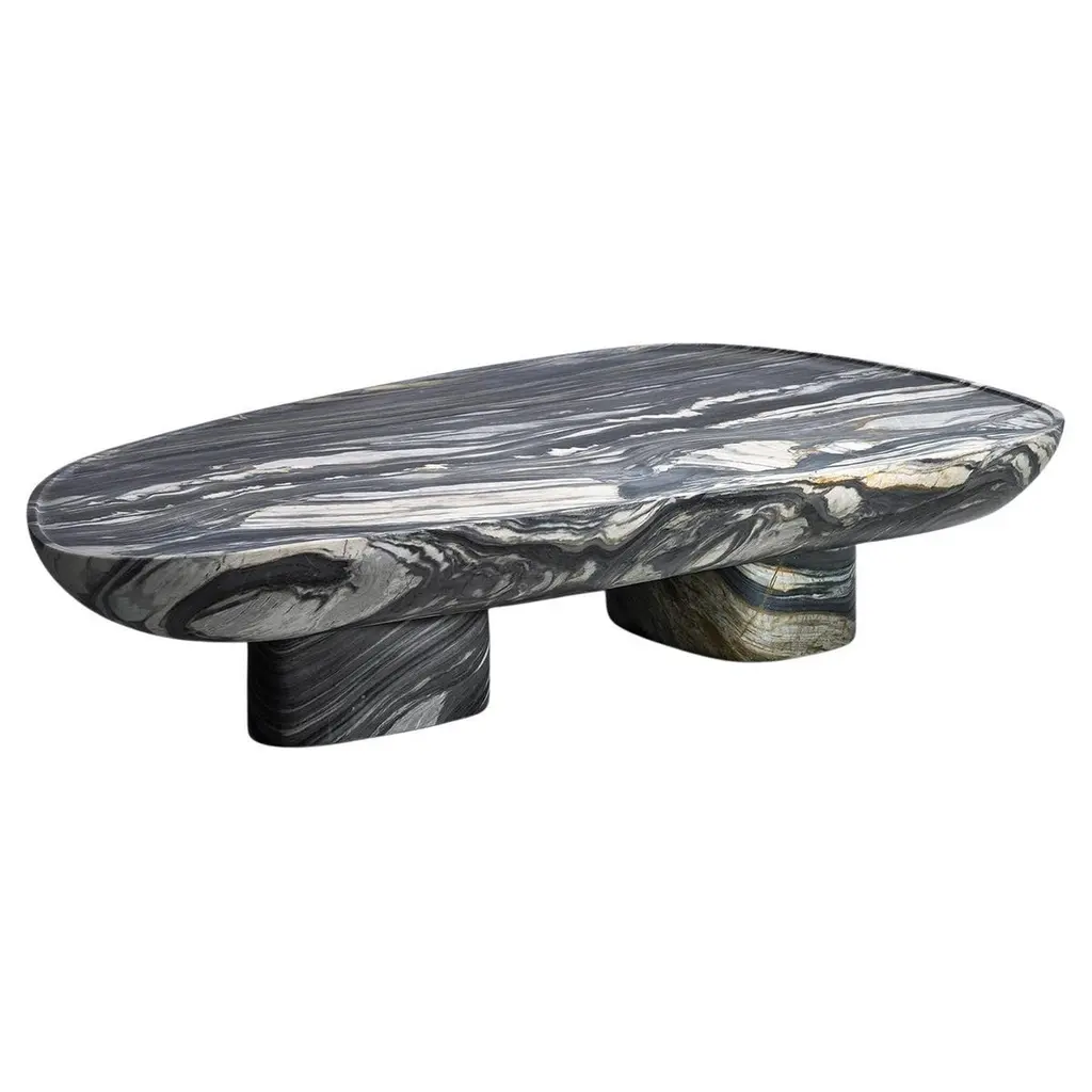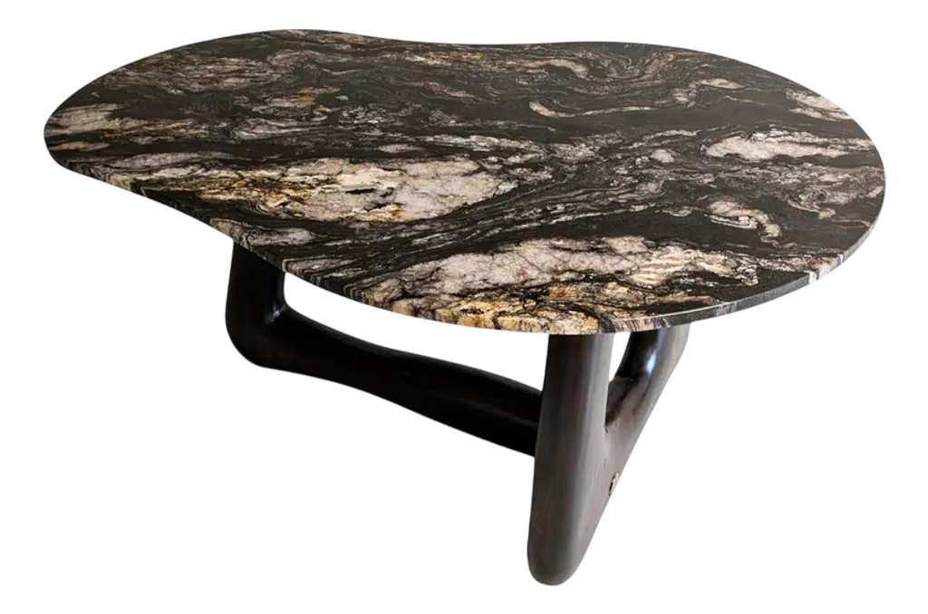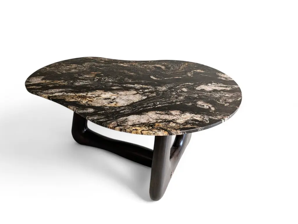 Narco Teak Collection Dining Table Pebble by AMBER x IÑIGO CALLEJADimensions: W 150 x D 110 x H 75 cm. Materials: Dry Teak Trunks Base, Emperor Black Granite Top, charred and stained pitch black, matt finish.Also available in Ivory cream Marble top.Iñigo Calleja is an engineer, designer and soulful maker born in Spain. He landed his first graduate job at European engineering leader BMW in Munich and developed a successful career in different companies that took his places all around the world. He found his inner entrepreneur living in Sydney and self developed his woodworking skills by chance and need. Once he realized he could build almost anything that he sketched he knew were about to get really exciting. In 2017 he decided to lay roots in coastal Cádiz, a city founded in the year 1000BC that hosts a breathtaking history and constructions that have seen human civilizations grow. Iñigo feels an unstoppable attraction for rare timbers he finds in many derelict buildings that were built centuries ago that are being demolished or renovated and becomes attracted to the stories those fine timbers treasure within.NARCO TEAK COLLECTION “We came across a batch of 70 trunks of Teak that were once seized by the Spanish border patrol during and antidrug raid.We have designed different pieces around the beautiful and cheeky shapes of these unconventional logs.By charring the trunks with fire we purify all cracks and achieve an splendid grain contrast and a wonderful silky touch”