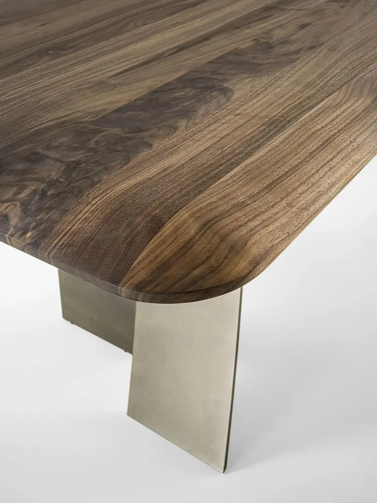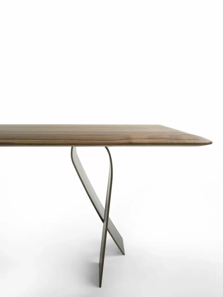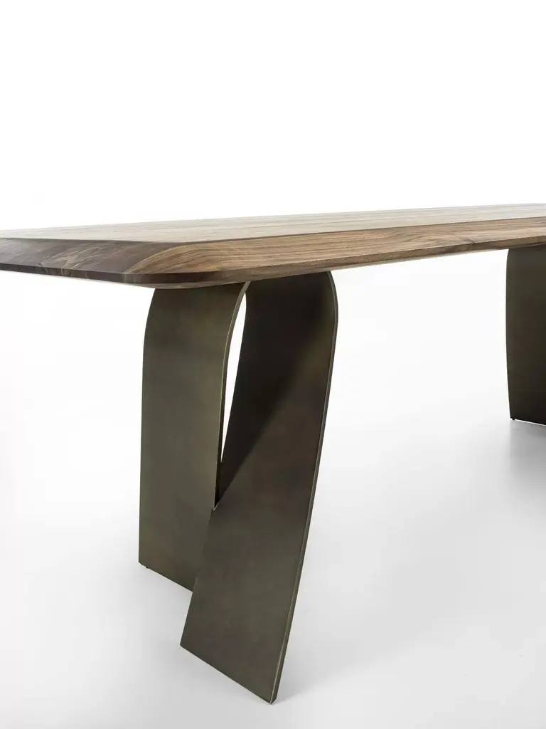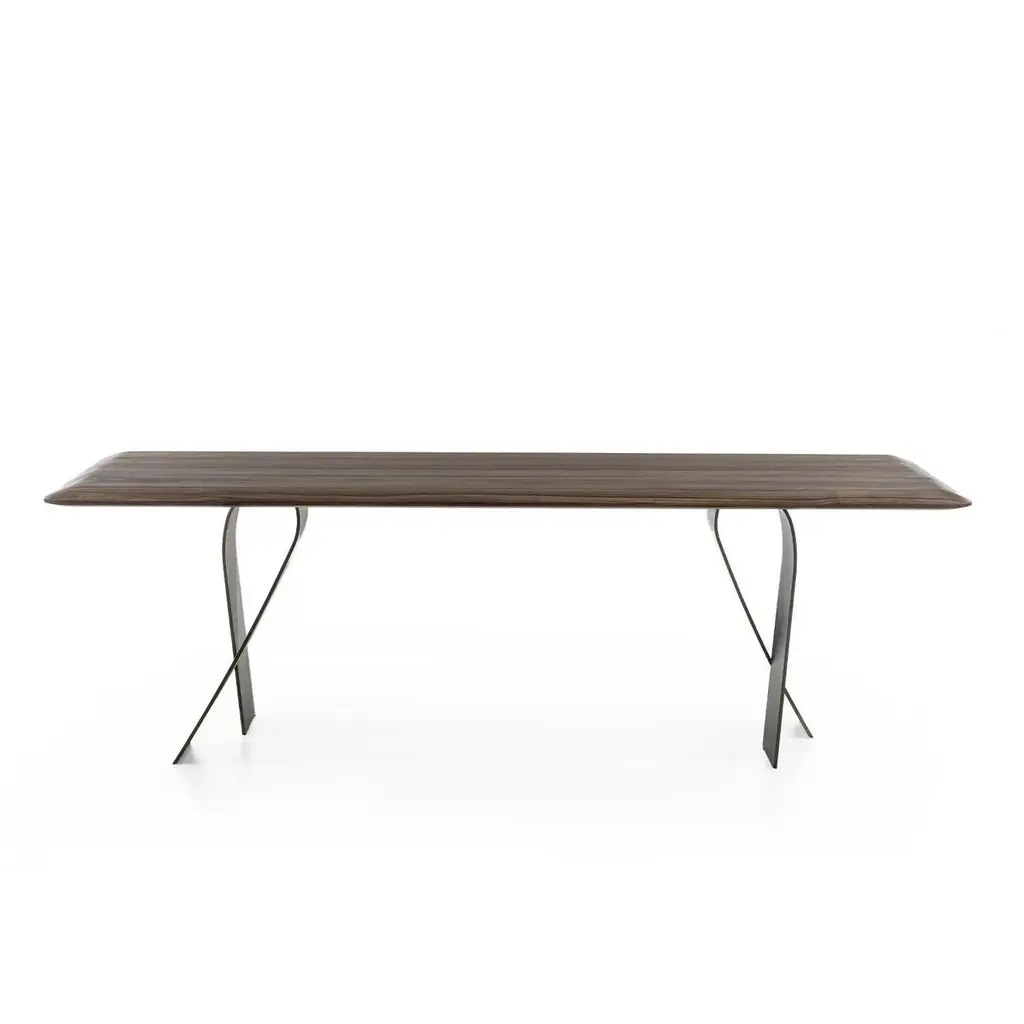 Table with a solid wood top with glued slats, characterized by a thin thickness thanks to the bevelled and rounded edges, which give it a light and sinuous design, and paired with winding iron legs evoking the flexibility of a ribbon.Variety of sizes and finishes available, please enquire within.
