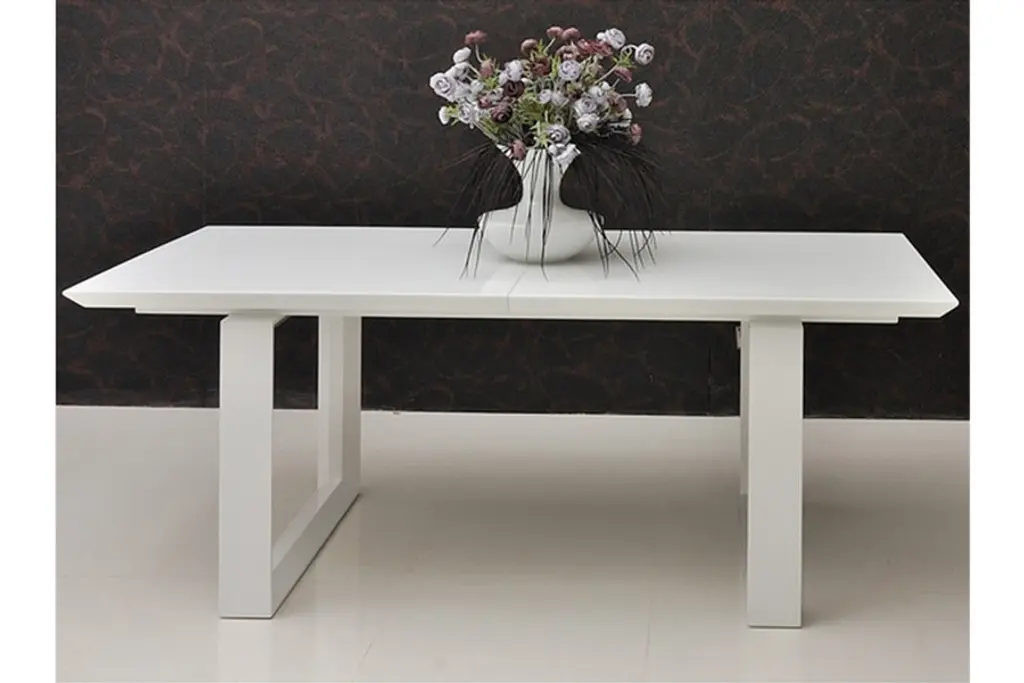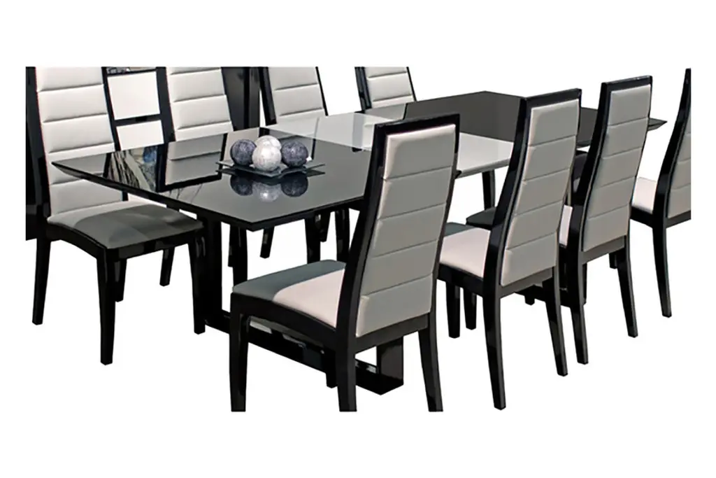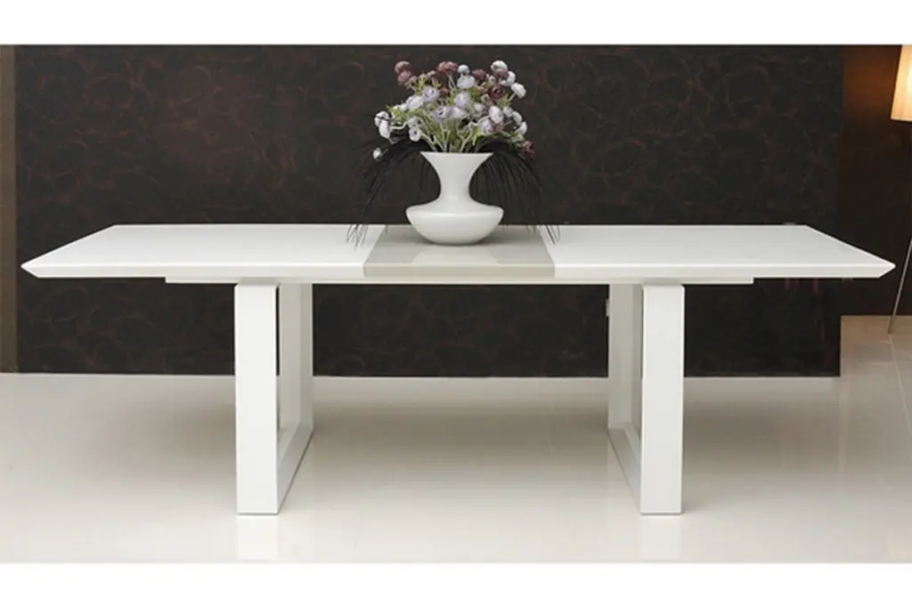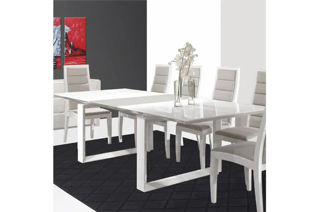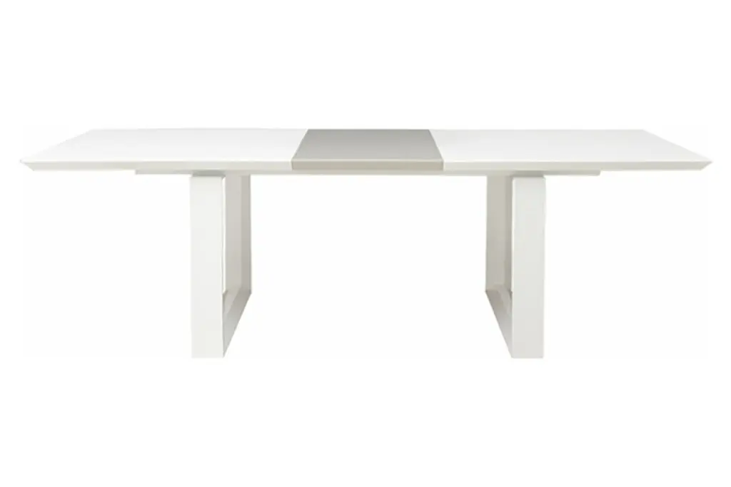 Guests may mistake the Natalia Dining Table by Sharelle Furnishings for a piece designed by a famous designer. Keep them guessing with this ultra-modern dining table. Rectangular in shape, this is where the ordinary ends and the extraordinary begins. The crisp lines and square-shaped legs are reliable and sturdy, yet keep the space underneath and above open and light. Use this as a place for weeknight meals, but also accommodate a dinner party or holiday meal with the self-storing extension in the center. This extension can be set up and taken down in a matter of minutes and when inserted, can seat up to 10 of your lovely friends and family comfortably. Whether you choose the sultry black lacquer finish, or clean stark white, the extension is finished in a light gray lacquer, giving even further contrast and reminding you of its unique place in the center stage of your home. From the Natalia Collection by Sharelle Furnishings.