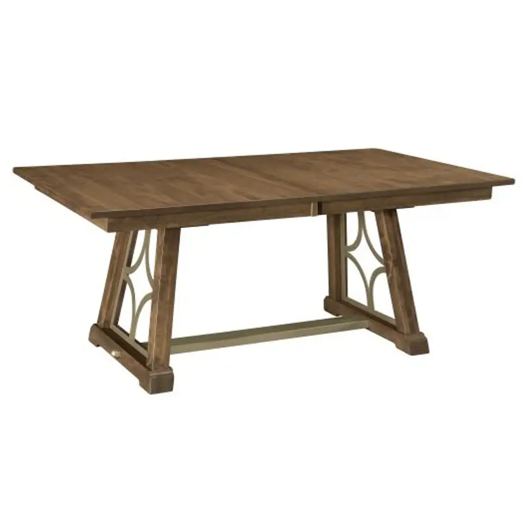 Dining Table Weight Limit: 100lbs. Elegant Trestle Design: A rectangular dining table with an ornate trestle base, crafted from poly resin for a sophisticated and decorative look.. Expandable Surface: Features an 18-inch removable extension leaf, allowing flexibility for hosting larger gatherings or intimate meals.. Premium Wooden Top: Crafted with a 34mm-thick wood veneer (oak) and MDF in a maple finish, offering durability and timeless style.. Refined Details: Includes a wooden apron that complements the table's classic design, enhancing its structural integrity.. Functional and Versatile: Knock-down (KD) design with no storage, perfect for dining areas needing both practicality and elegance.