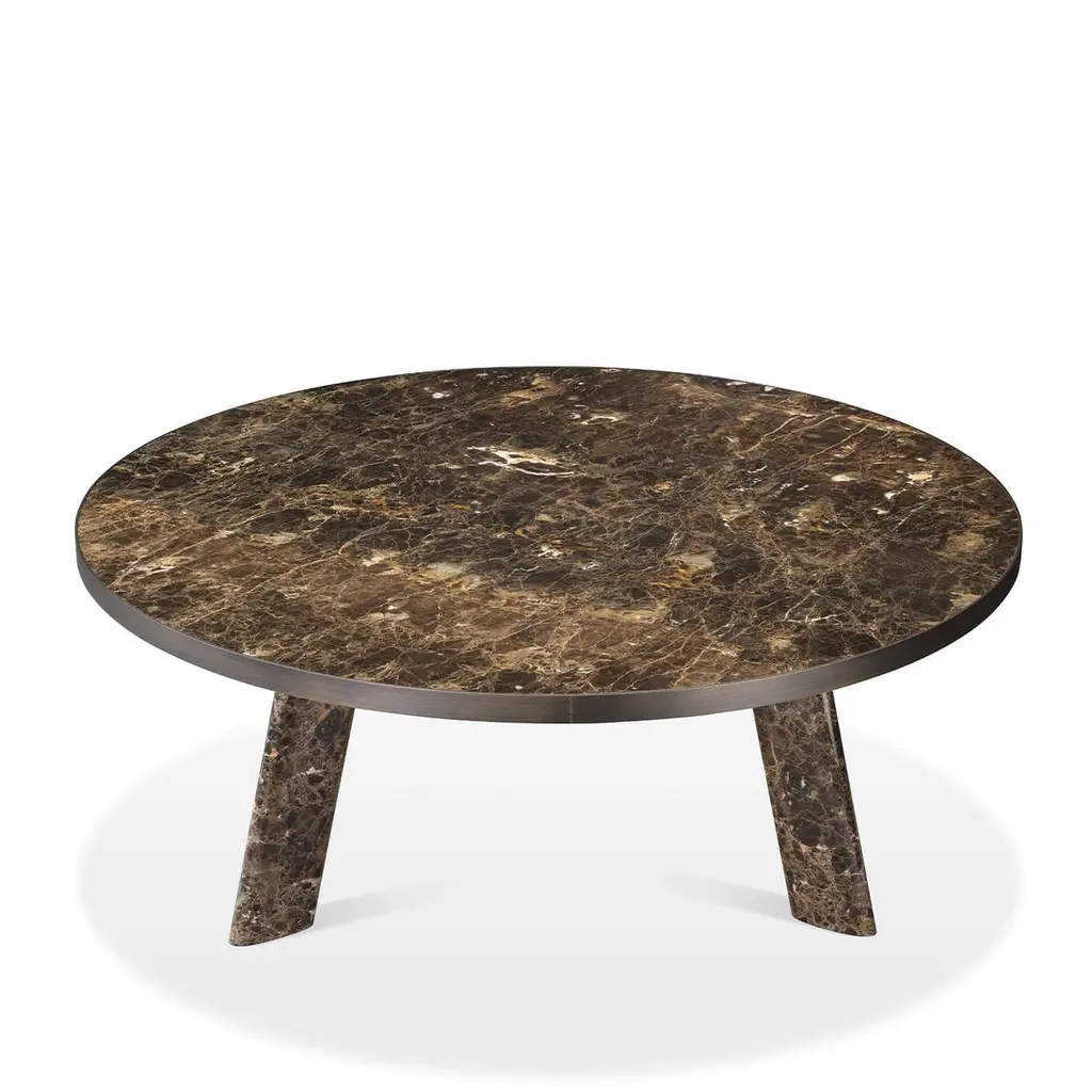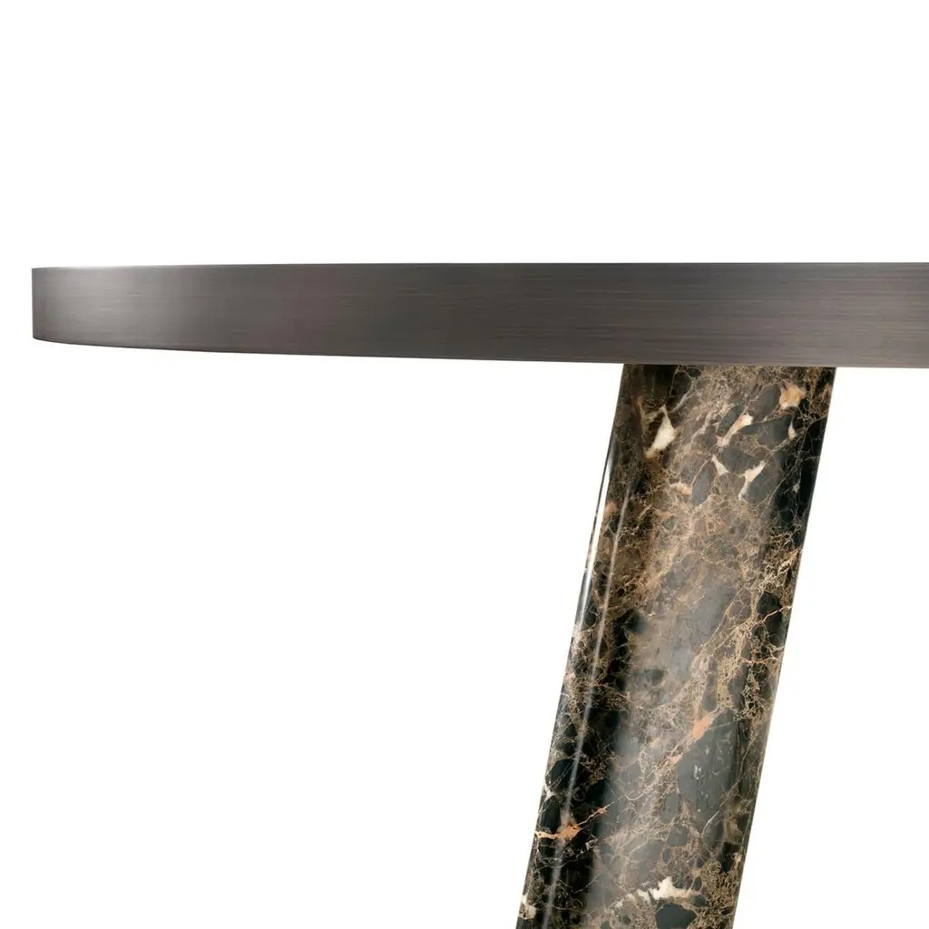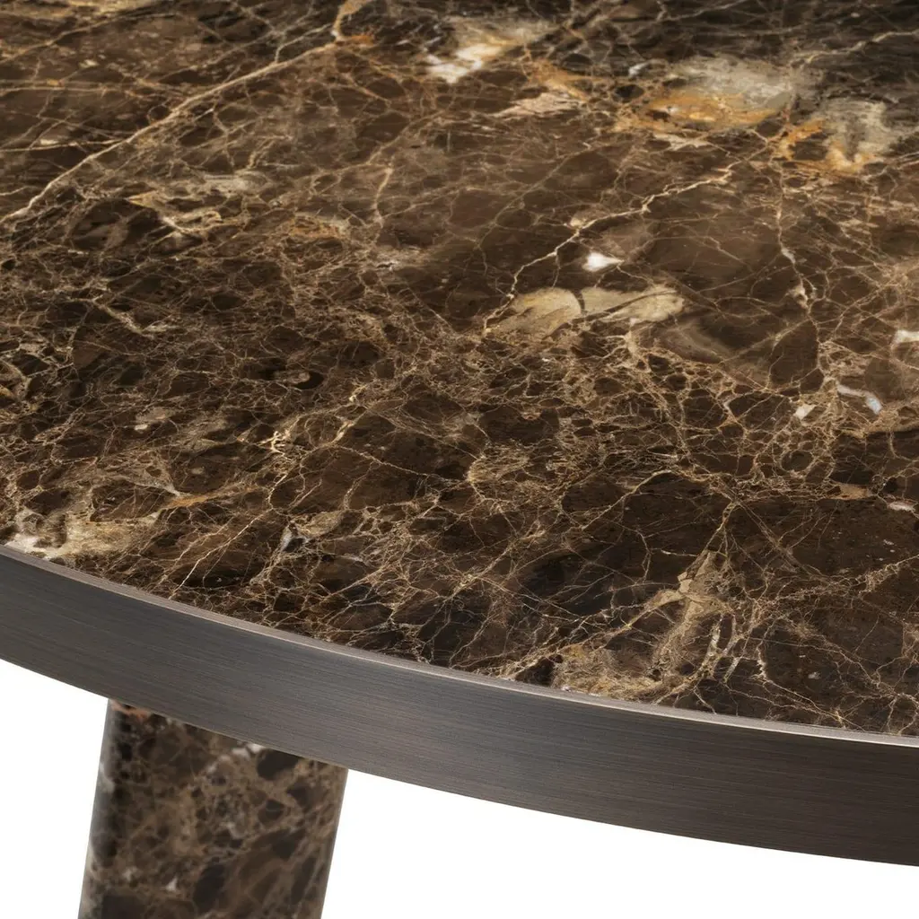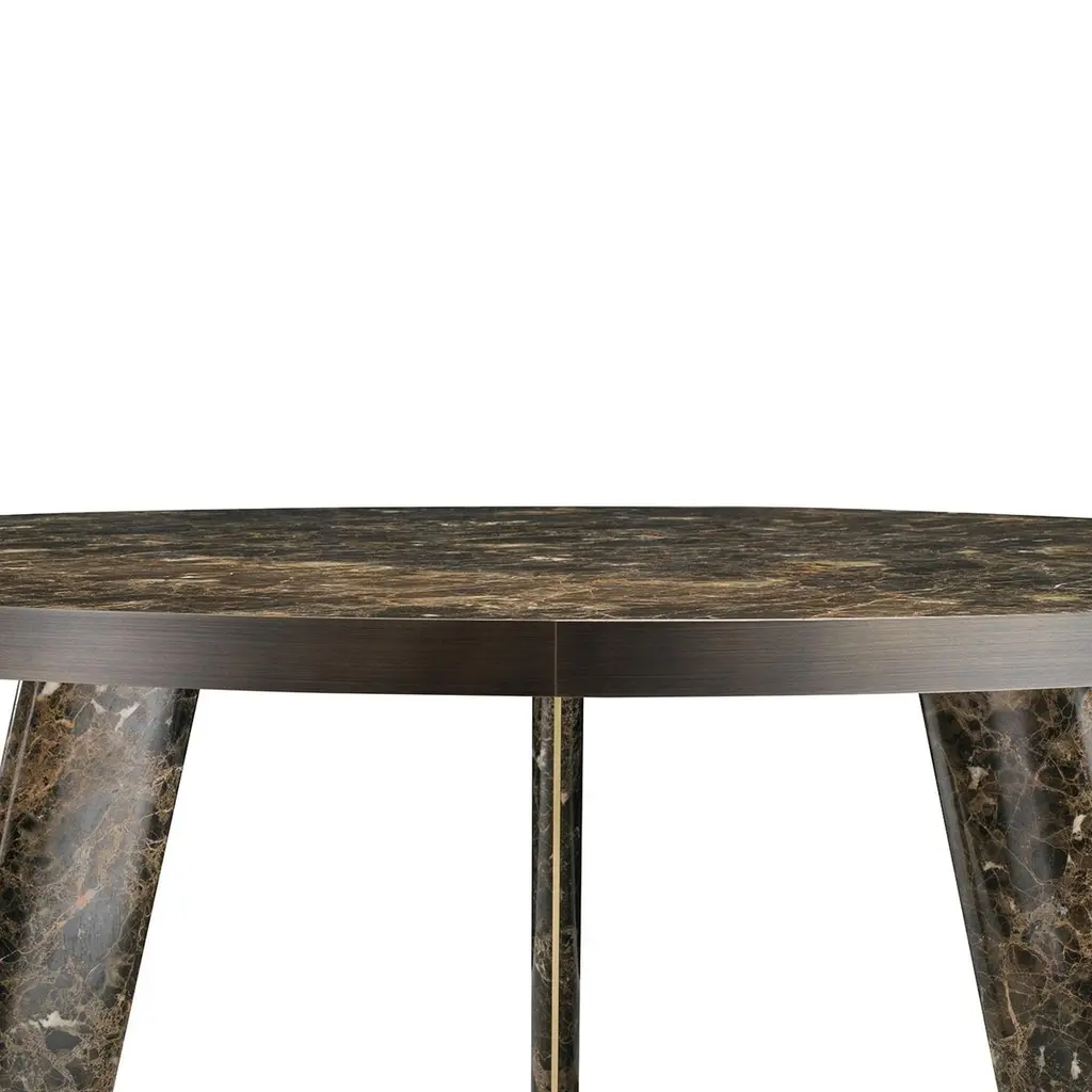 Designed as a balanced synthesis between clean modern lines and the instinctive luxury immediately conveyed by prized Dark Emperador marble, this round dining table will seduce with its intricate, unrepeatable tracery in intense warm tones. The bold circular top offers a design of overlapped surfaces for increased functionality and visual character, sealed by the stately legs making up the tripod base.