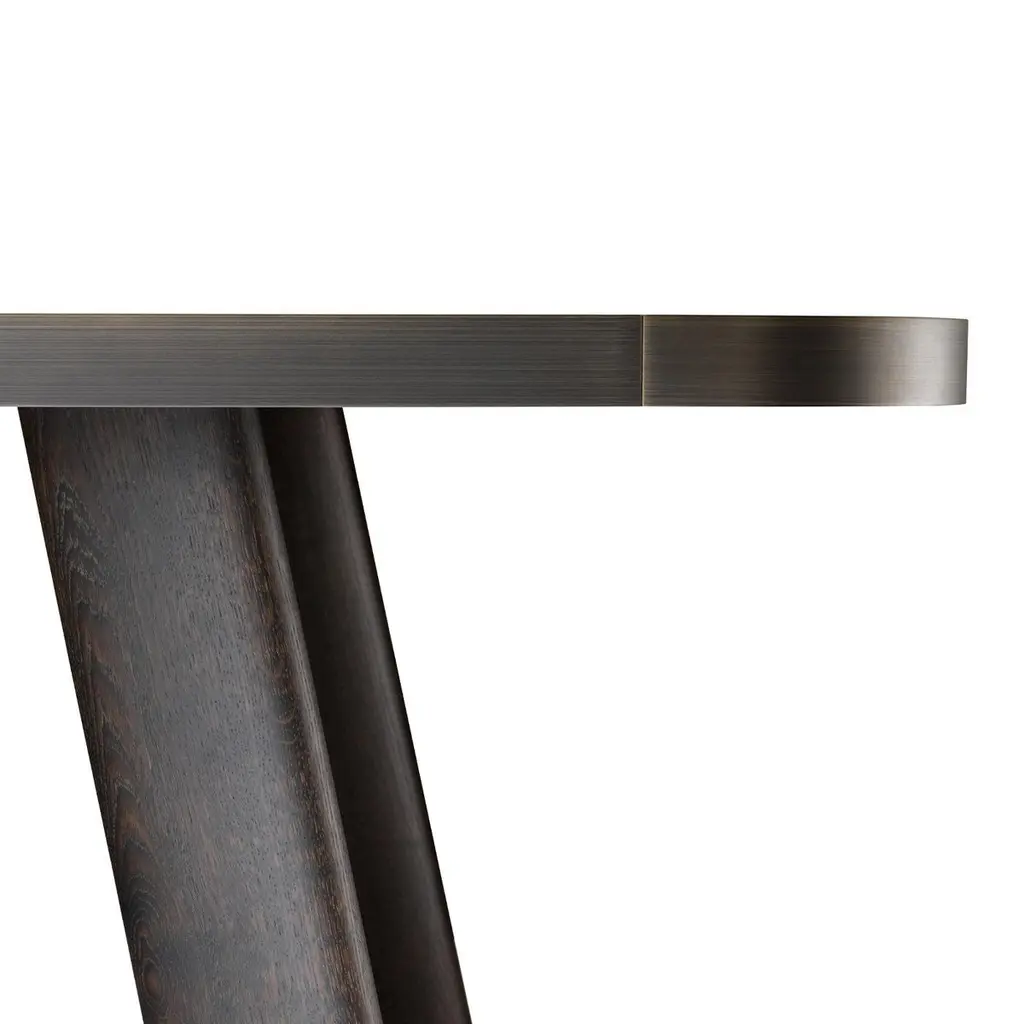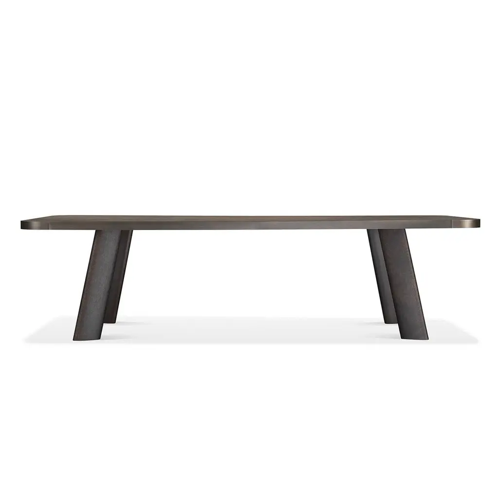 A deft balance of proportions and volumes ennobled by a sophisticated combination of finishes and textures defines the look of this precious dining table. It is crafted of solid wood and finished with a metallic band embracing the tabletop's perimeter that lends it a strong urban personality. Its bold silhouette consists of a majestic top with rounded corners resting on four bold, slanted legs.