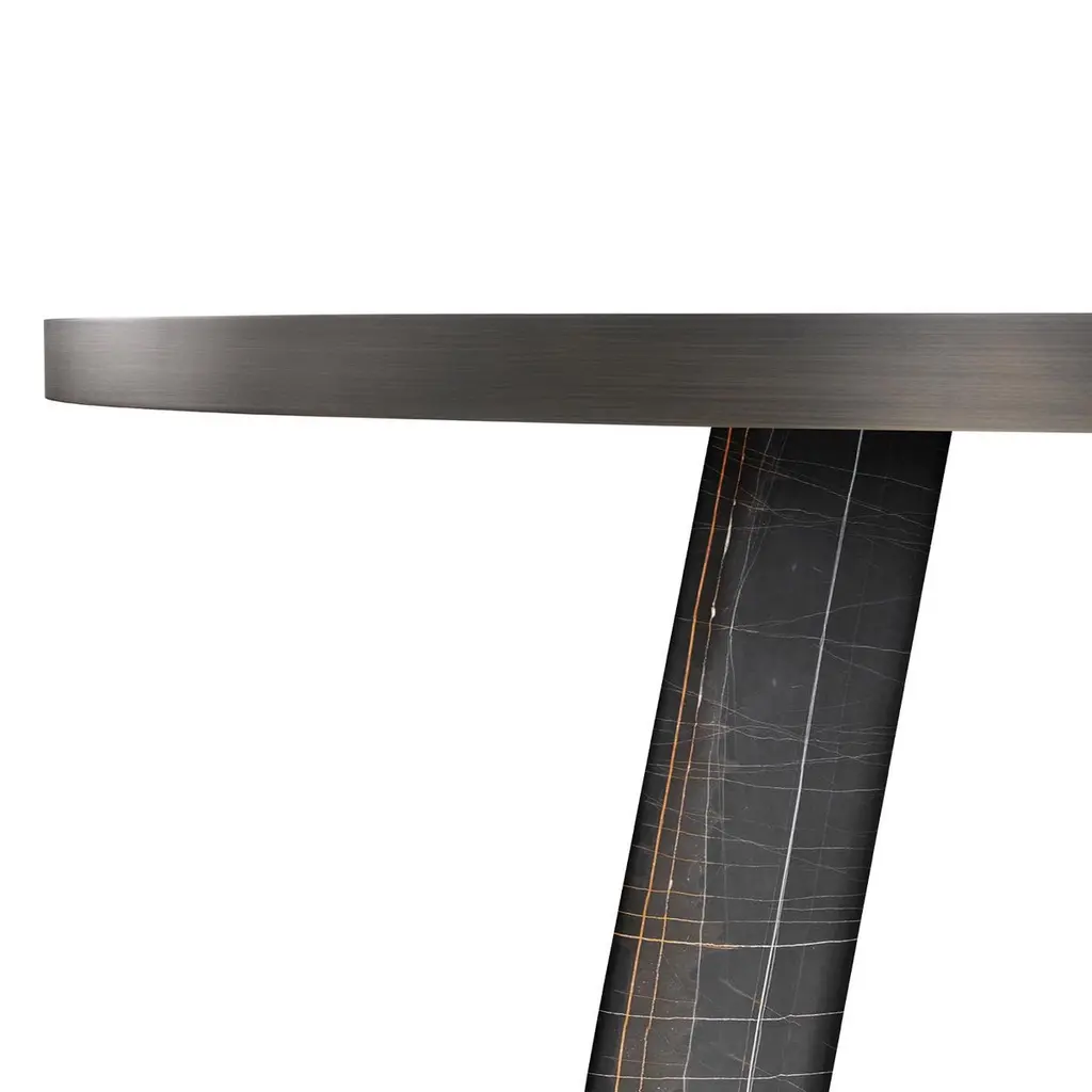 This precious dining table reveals a clear modern appeal with its balanced interplay of geometric figures. Crafted of Sahara Noir marble, it boasts a majestic round top resting on three bold, matching legs, which add to the extraordinary aesthetic distinguishing this piece, where the use of marble implies singular traceries where warm hues and intersecting lines prevail. Please ask the Concierge for other available marble options.