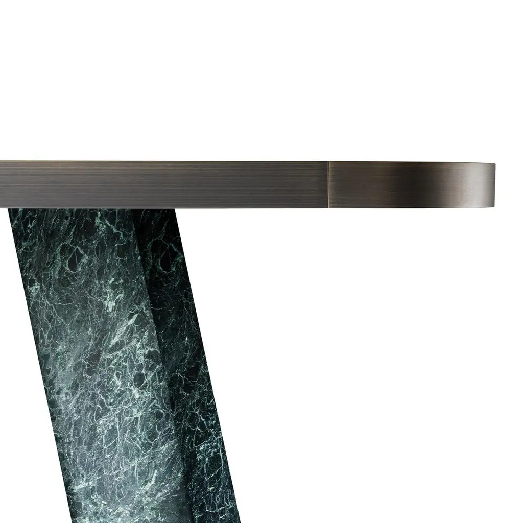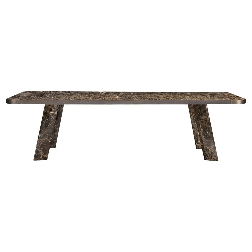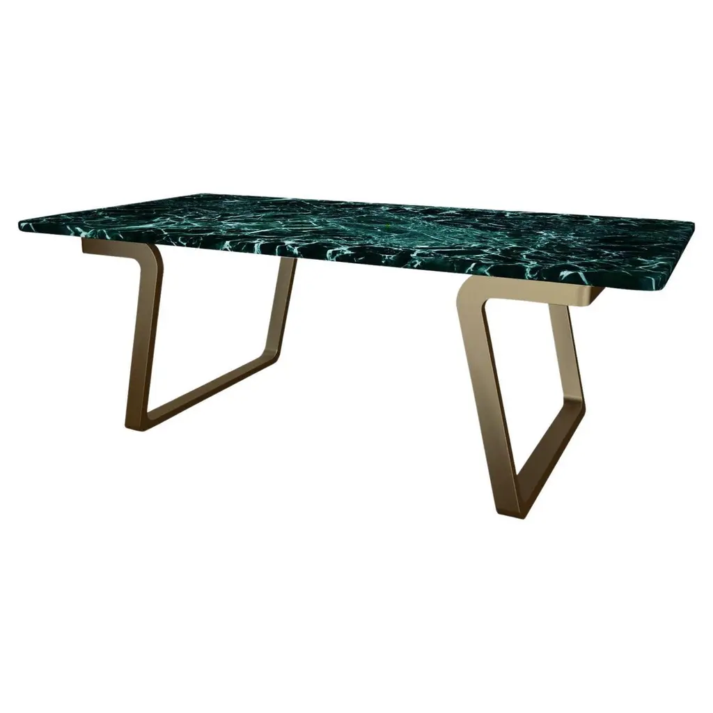 The spontaneous beauty of marble meets the cool charm of metallic finishes in this stupefying dining table designed by Stefano Giovannoni. Stately, slanted legs sustain the rectangular tabletop marked by smoothed corners, both crafted of vibrant green Alpi marble, enchanting with its intricate light tracery emerging from a deep-green backdrop. A metallic gray band envelops the tabletop's perimeter for a final twist.