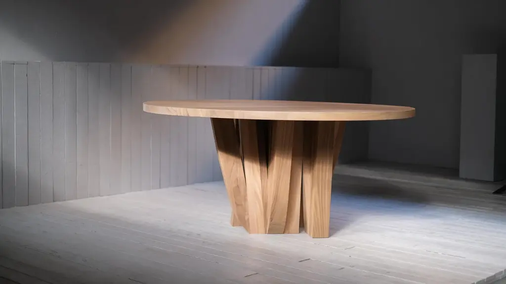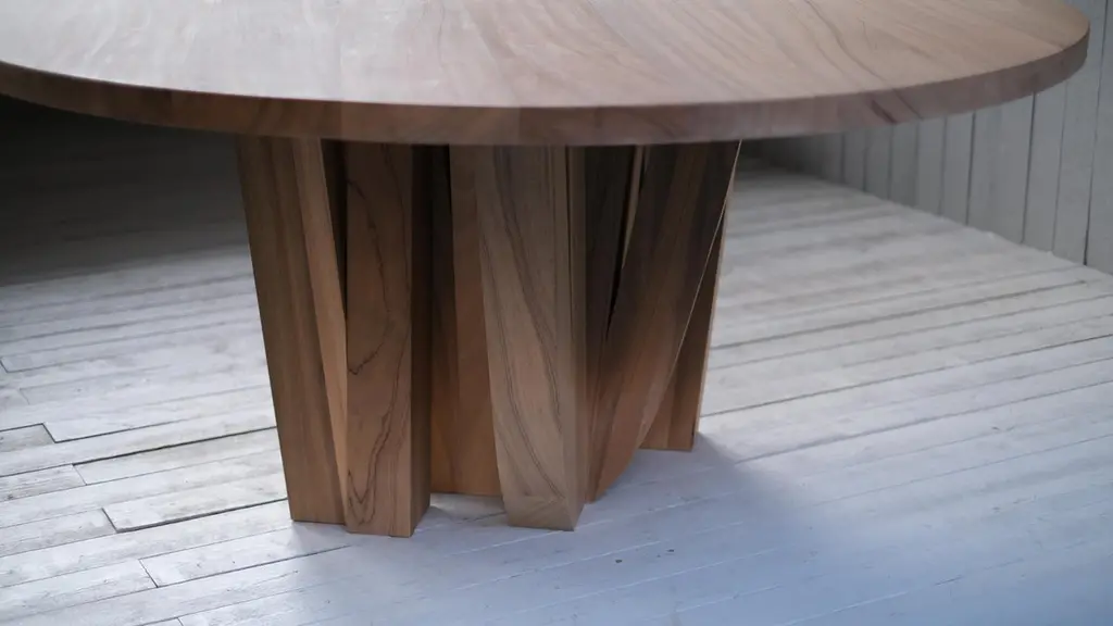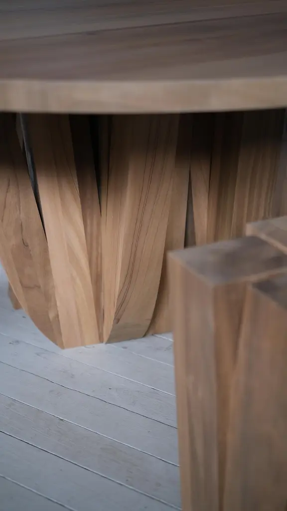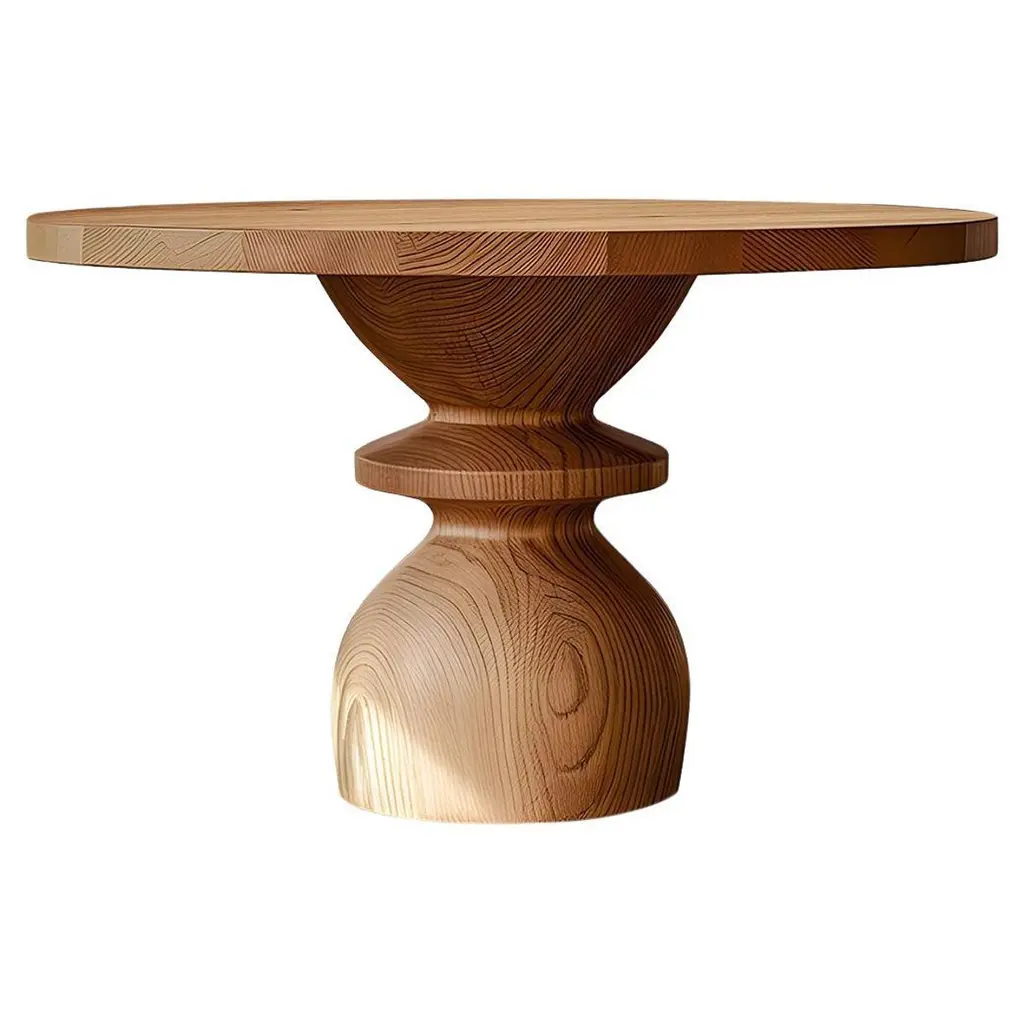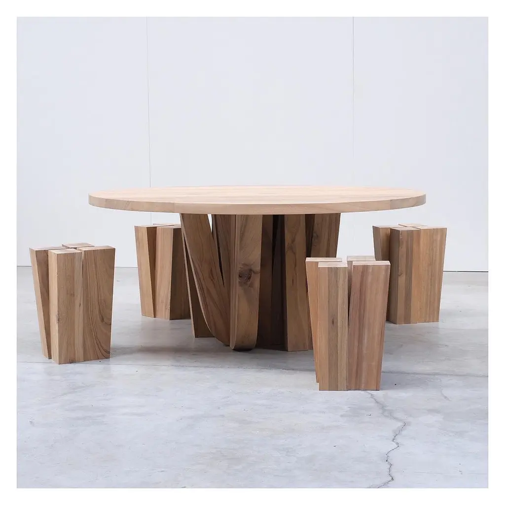 Zoumey round table by Arno DeclercqDimensions: diameter 160 x height 75 cmMaterials: African walnutA forest of table legs made out of 16 pieces of African walnut.A dining table for 6 personsArno DeclercqBelgian designer and art dealer who makes bespoke objects with passion for design, atmosphere, history and craft. Arno grew up in a family with parents who like to work with beautiful brands and objects.His father studied at the Royal Academy of Arts Fashion Department, he worked for Bikkembergs and made his own fashion brands, but has also collected tribal arts for more than 20 years. His mother, who worked with his father from the beginning, bought a shoe store in 2010 where they sold brands as Rick Owens, Ann Demeulemeester, Maison Martin Margiela, ... With the interest in beauty he learned from his parents, Arno studied interior design, after learning a lot about materials and with great knowledge of history he designed interiors and opened his own gallery for ethnographic art and design.The collection has come to the idea that there are too few interiors where they no longer have the big and static vases and candlesticks that the people had in big houses over 100 years ago. By focusing on architecture, ancient arts and design, after war buildings, defense buildings (bunkers and fortresses) and tribal arts, he created a collection that became a Classic.Each piece is unique because it is entirely handcrafted by him. Made of tropical hardwood called Iroko this he discovered after one of his many trips to West Africa interested in voodoo arts.In these strange tribal arts, the wood "Iroko" is used in many objects, according to their culture, the ancestors lives in these trees, and they also call this tree "the king of the forest".Arno also combines this with Belgian oak, that dried for more than 30 years, wood that was provided for the many furniture makers in Mechelen.By treating these objects through the Yakusugi technique or another mentioned "Shou Sugi Ban" an ancient Japanese technique where the objects are burned to protect the wood from weathering and subsequently fixed to get a patina look as long as possible. This gives each object a unique texture.
