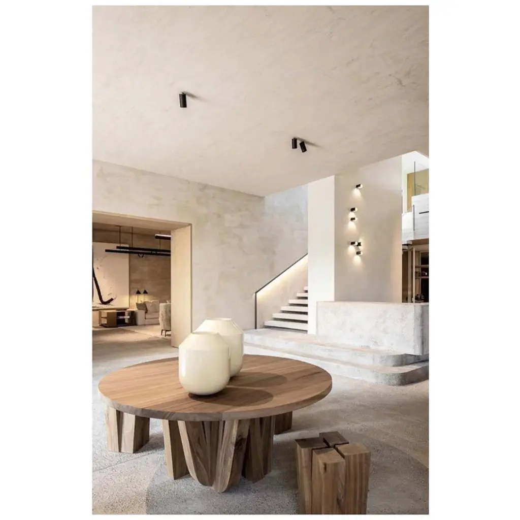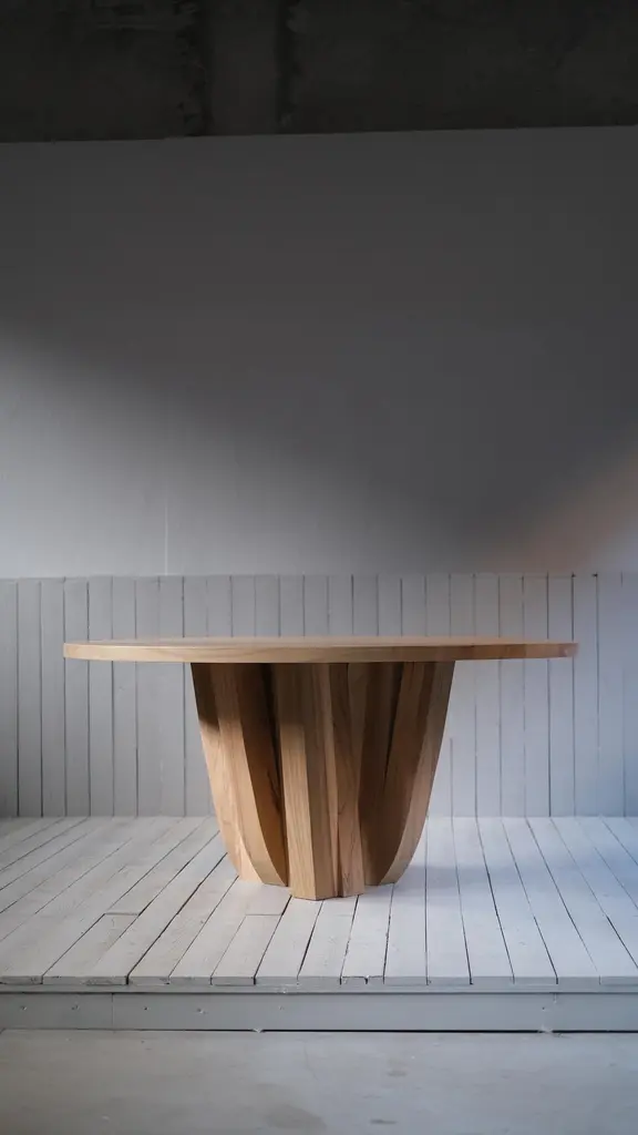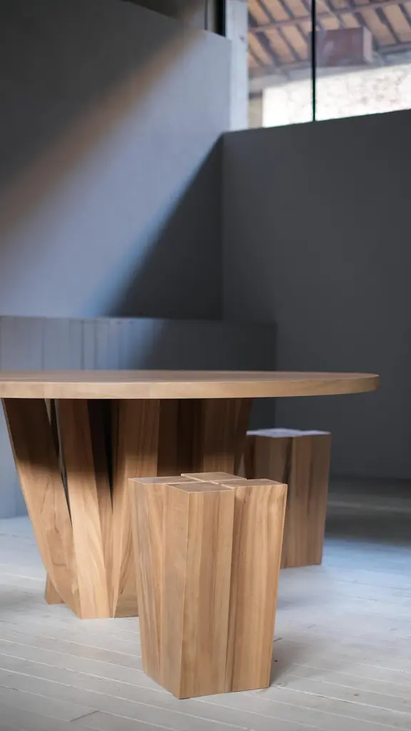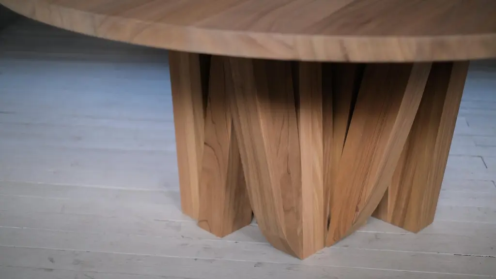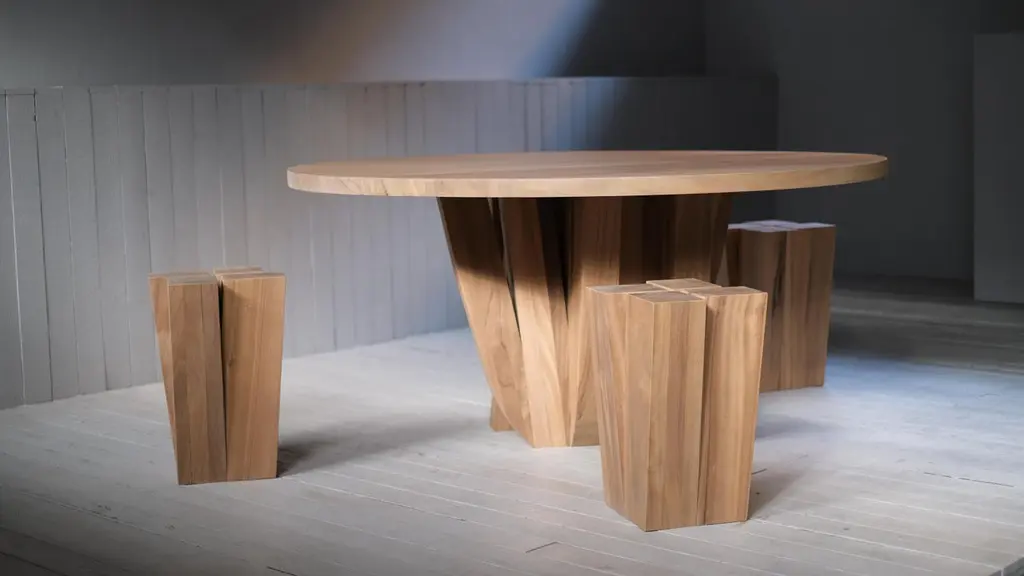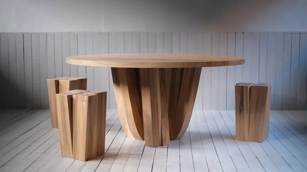 Zoumey round table by Arno DeclercqDimensions: diameter 160 x height 75 cmMaterials: African walnutA forest of table legs made out of 16 pieces of African walnut.A dining table for 6 personsArno DeclercqBelgian designer and art dealer who makes bespoke objects with passion for design, atmosphere, history and craft. Arno grew up in a family with parents who like to work with beautiful brands and objects.His father studied at the Royal Academy of Arts Fashion Department, he worked for Bikkembergs and made his own fashion brands, but has also collected tribal arts for more than 20 years. His mother, who worked with his father from the beginning, bought a shoe store in 2010 where they sold brands as Rick Owens, Ann Demeulemeester, Maison Martin Margiela, ... With the interest in beauty he learned from his parents, Arno studied interior design, after learning a lot about materials and with great knowledge of history he designed interiors and opened his own gallery for ethnographic art and design.The collection has come to the idea that there are too few interiors where they no longer have the big and static vases and candlesticks that the people had in big houses over 100 years ago. By focusing on architecture, ancient arts and design, after war buildings, defense buildings (bunkers and fortresses) and tribal arts, he created a collection that became a Classic.Each piece is unique because it is entirely handcrafted by him. Made of tropical hardwood called Iroko this he discovered after one of his many trips to West Africa interested in voodoo arts.In these strange tribal arts, the wood "Iroko" is used in many objects, according to their culture, the ancestors lives in these trees, and they also call this tree "the king of the forest".Arno also combines this with Belgian oak, that dried for more than 30 years, wood that was provided for the many furniture makers in Mechelen.By treating these objects through the Yakusugi technique or another mentioned "Shou Sugi Ban" an ancient Japanese technique where the objects are burned to protect the wood from weathering and subsequently fixed to get a patina look as long as possible. This gives each object a unique texture.