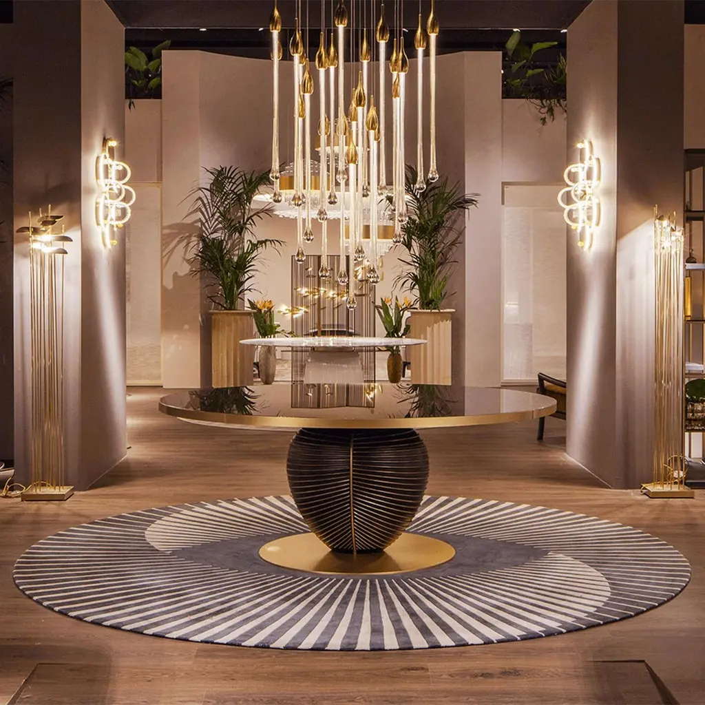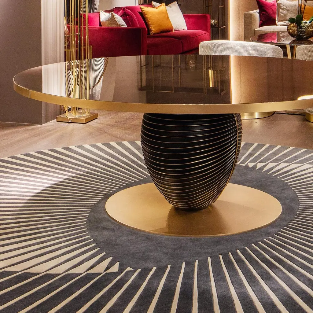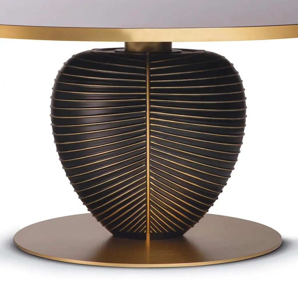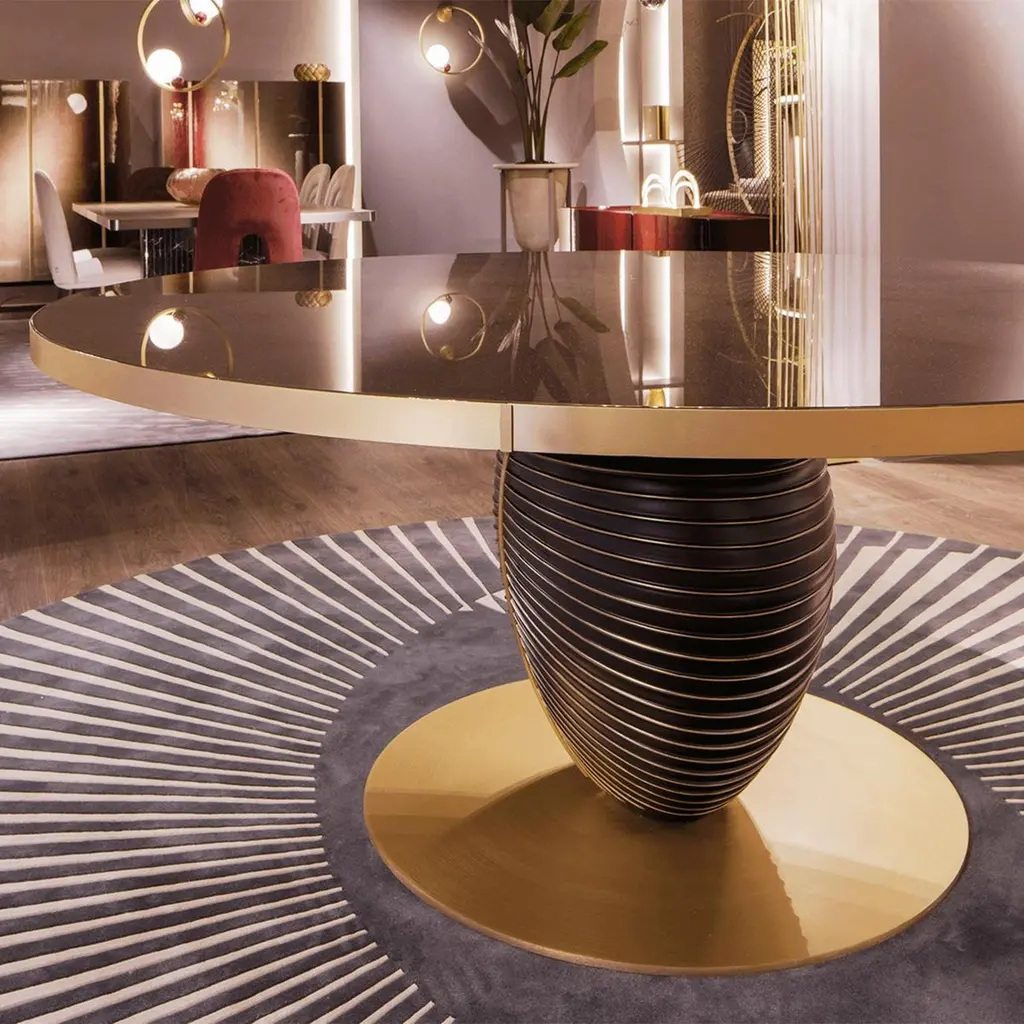 Dining table nature round with resin concrete pedestalin matt satinated gilted finish and with round metal base inmatt satinated gilted finish. With round glass top back lacquered in brown color lacquered finish and with metal trim in matt satinated gilted finish.Also available in Diameter 160xH75cm, price: 25900,00€ on request.