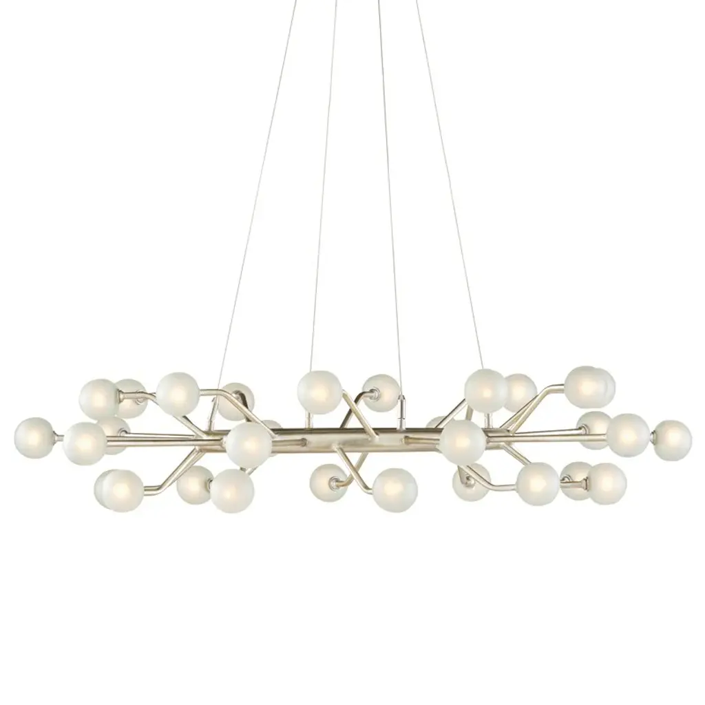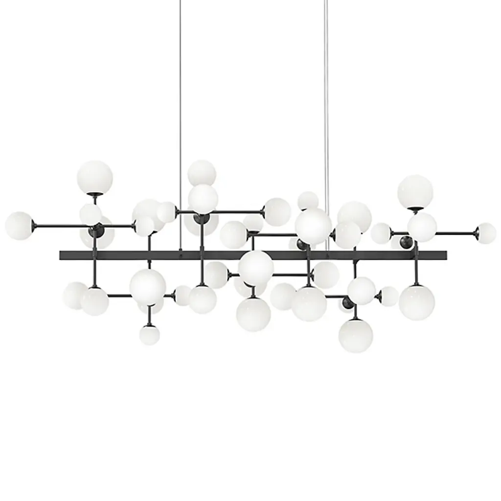 An eye-catching way to light up large spaces. The Nebula LED Bar Linear Suspension by SONNEMAN Lighting was designed to create a dazzling, and almost dance-like, lighting effect. It does so with its unique configuration of shades and spokes; it includes many differently sized White Cased Glass spheres arranged in geometric clusters at the end of slender Metal spokes. These clusters are then clustered together again around a long, barred frame, making the overall proportions generally linear. Whether placed over a large conference table, a dining table or hotel reception area, this linear suspension is certain to be a main topic of conversation.