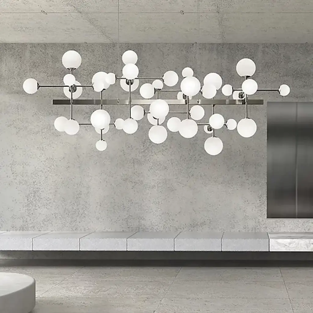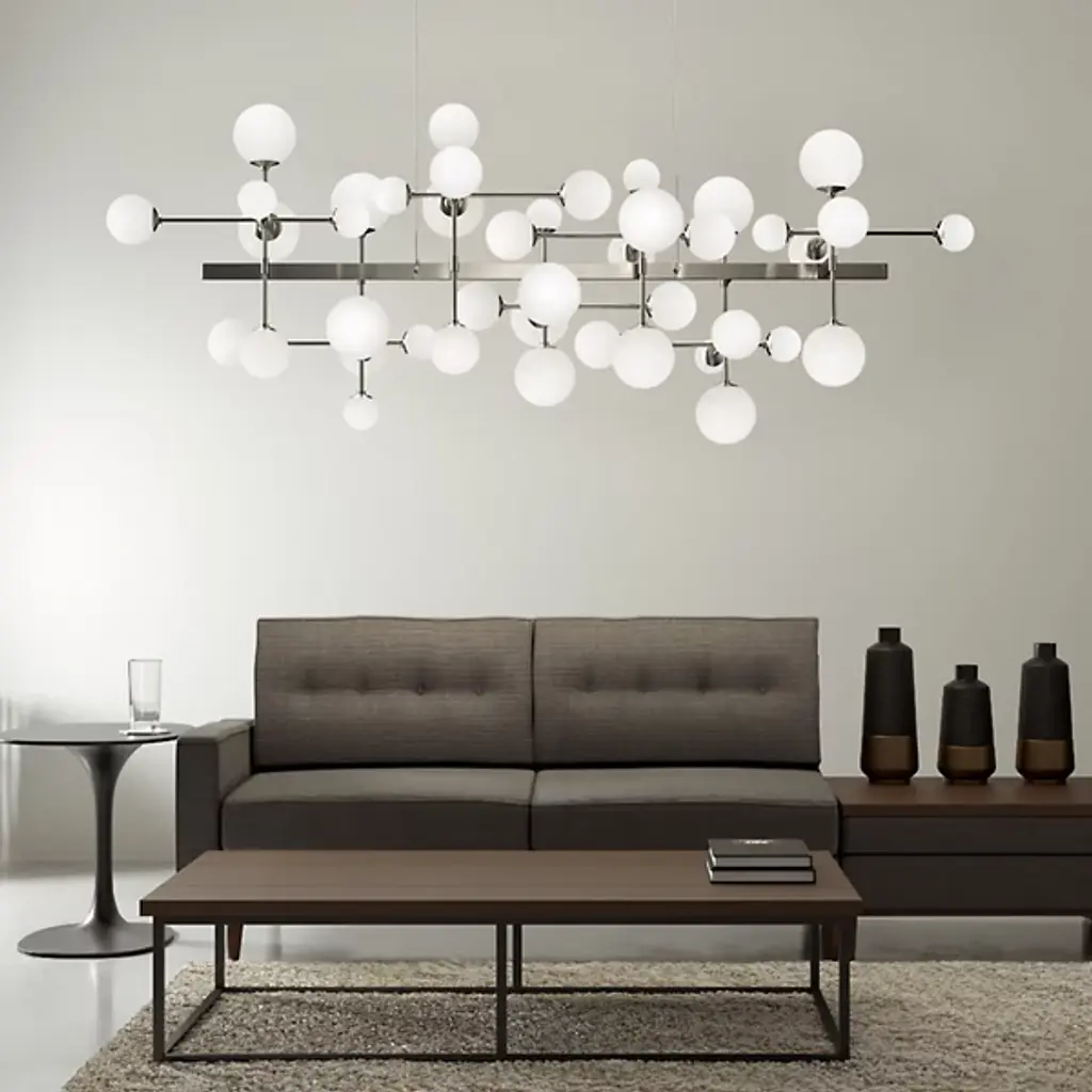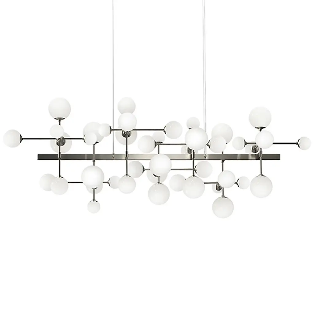 An eye-catching way to light up large spaces. The Nebula LED Bar Linear Suspension by SONNEMAN Lighting was designed to create a dazzling, and almost dance-like, lighting effect. It does so with its unique configuration of shades and spokes; it includes many differently sized White Cased Glass spheres arranged in geometric clusters at the end of slender Metal spokes. These clusters are then clustered together again around a long, barred frame, making the overall proportions generally linear. Whether placed over a large conference table, a dining table or hotel reception area, this linear suspension is certain to be a main topic of conversation.