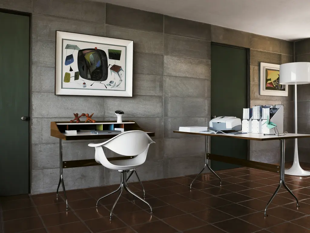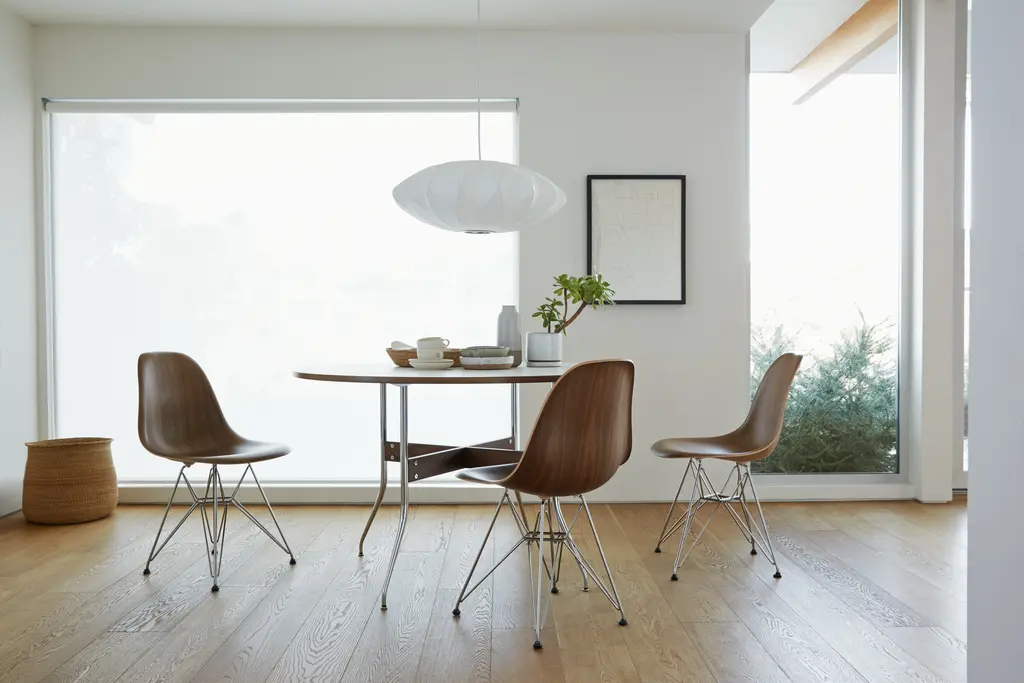 George Nelson used solid, straightforward materials to create his Swag Leg Table (1958). The modern, rectangular wood dining table comes with a choice of a laminate or walnut-veneer top; the chrome legs, fashioned from 16-gauge steel, feature leveling floor glides to accommodate uneven surfaces. This is the authentic Swag Leg Dining Table by Herman Miller.