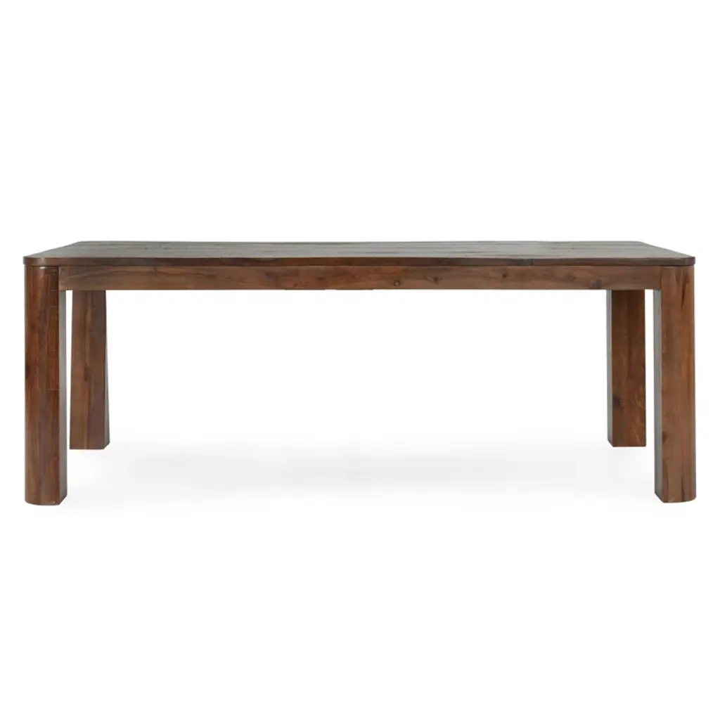 Thick, curved legs give this dining table a solid, grounded effect, making it an ideal focal point for any space. Carefully crafted from reclaimed pine wood, this piece celebrates the distinctive character of aged wood by showcasing its natural variations and imperfections. Generous dimensions ensure comfortable seating for up to eight people.