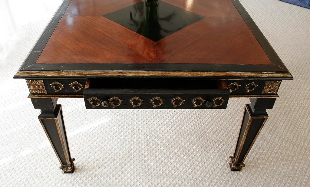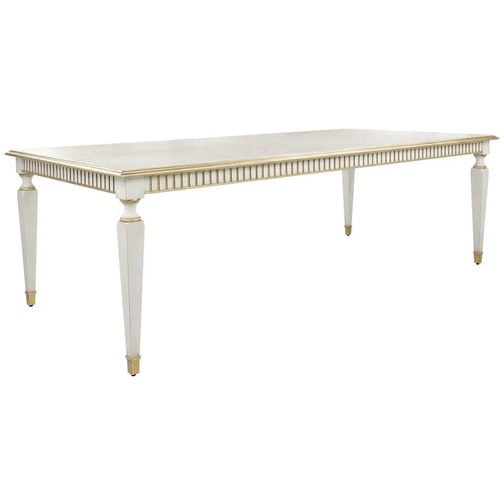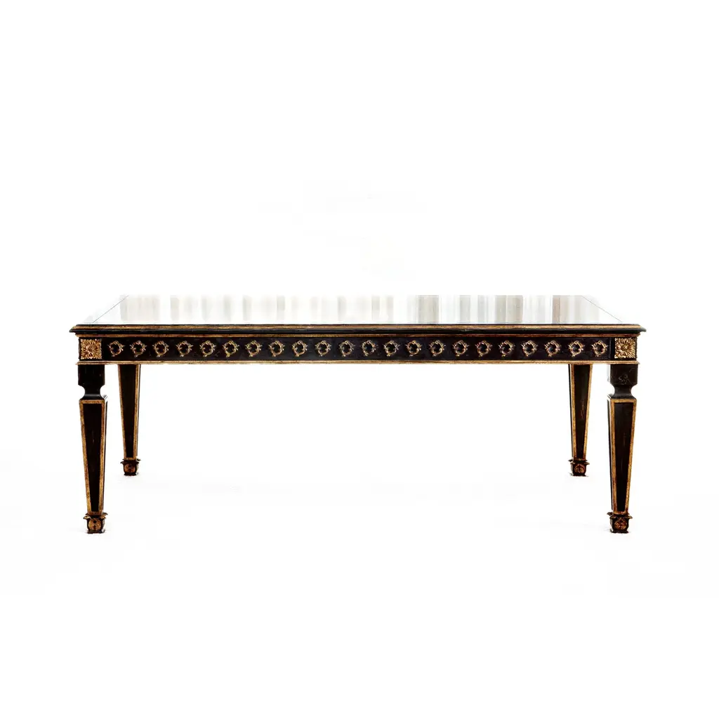 Created for The Rothschild Collection - "Nancee" 1996 © Of continental neoclassic style, manufactured from American Hard Maple. The rectangular top with ebonized hard maple is surrounded with mahogany inlay above a solid frieze carved with foliate cartouches. A drawer at each end of the dining table with foliate-cast antiqued bronze pulls, the corners with square paterae, on square tapering paneled legs with waisted collars ending in acanthus-form feet, with an antiqued ebonized finish highlighted with parcel-gilding, extending with two extra leaves. 84"w x 48"d x 31.50"h - Table comes with 2 leaves each measuring 24". Fully extended the table is 132"w x48" x 31.50"h Quite simply, this represents my bestie. Classy, sturdy, beautiful, dependable, and full of surprises! Photo #1 is without the two leaves. Photo #11 shows two leaves have been inserted.