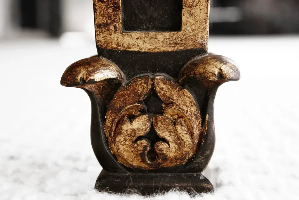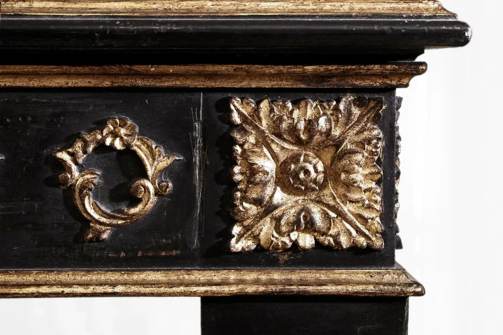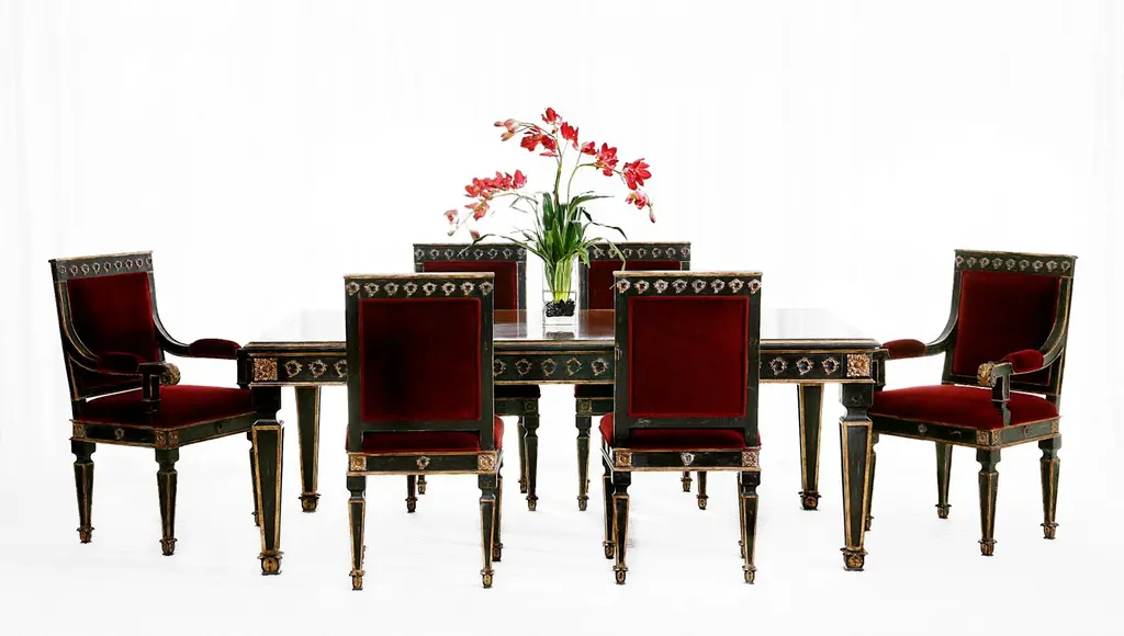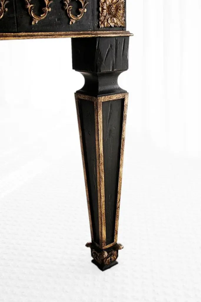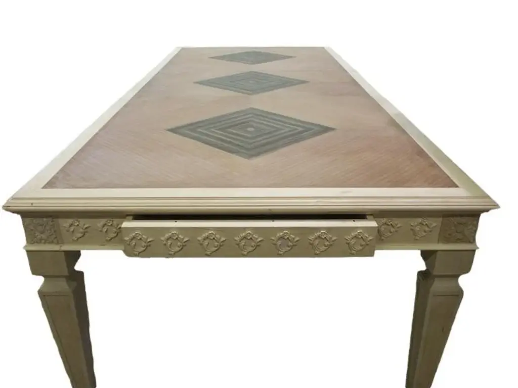 Created for The Rothschild Collection - "Nancee" 1996 © Of continental neoclassic style, manufactured from American Hard Maple. The rectangular top with ebonized hard maple is surrounded with mahogany inlay above a solid frieze carved with foliate cartouches. A drawer at each end of the dining table with foliate-cast antiqued bronze pulls, the corners with square paterae, on square tapering paneled legs with waisted collars ending in acanthus-form feet, with an antiqued ebonized finish highlighted with parcel-gilding, extending with two extra leaves. 84"w x 48"d x 31.50"h - Table comes with 2 leaves each measuring 24". Fully extended the table is 132"w x48" x 31.50"h Quite simply, this represents my bestie. Classy, sturdy, beautiful, dependable, and full of surprises! Photo #1 is without the two leaves. Photo #11 shows two leaves have been inserted.