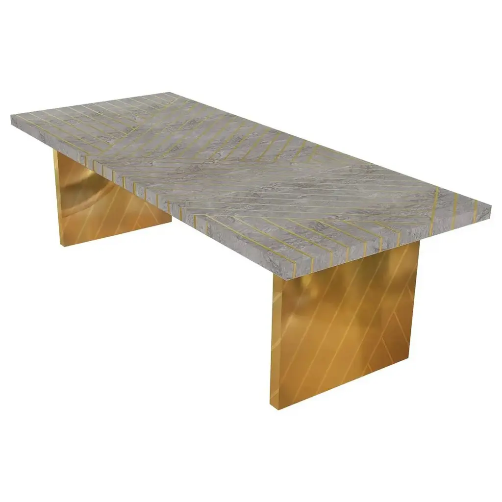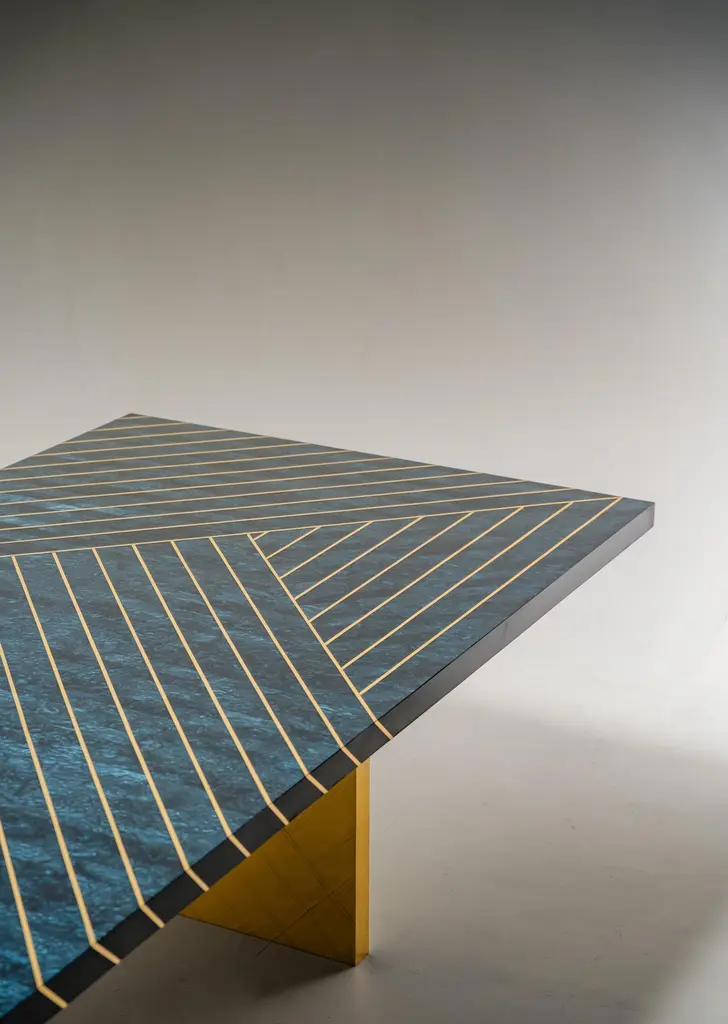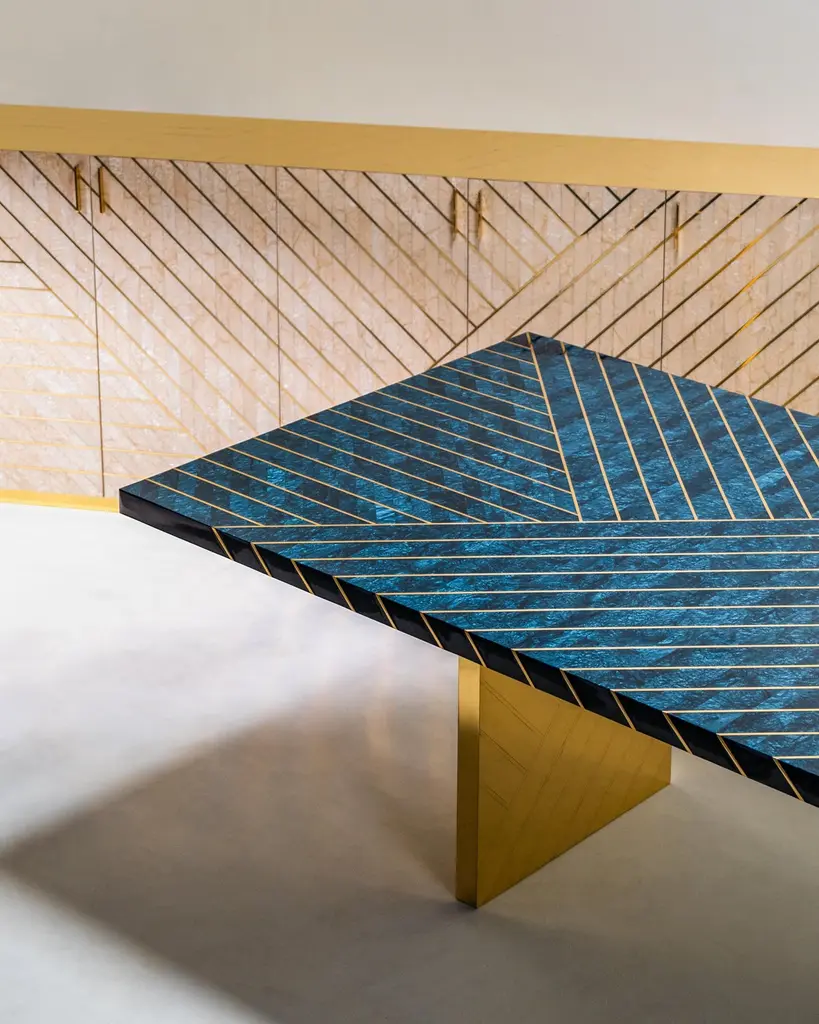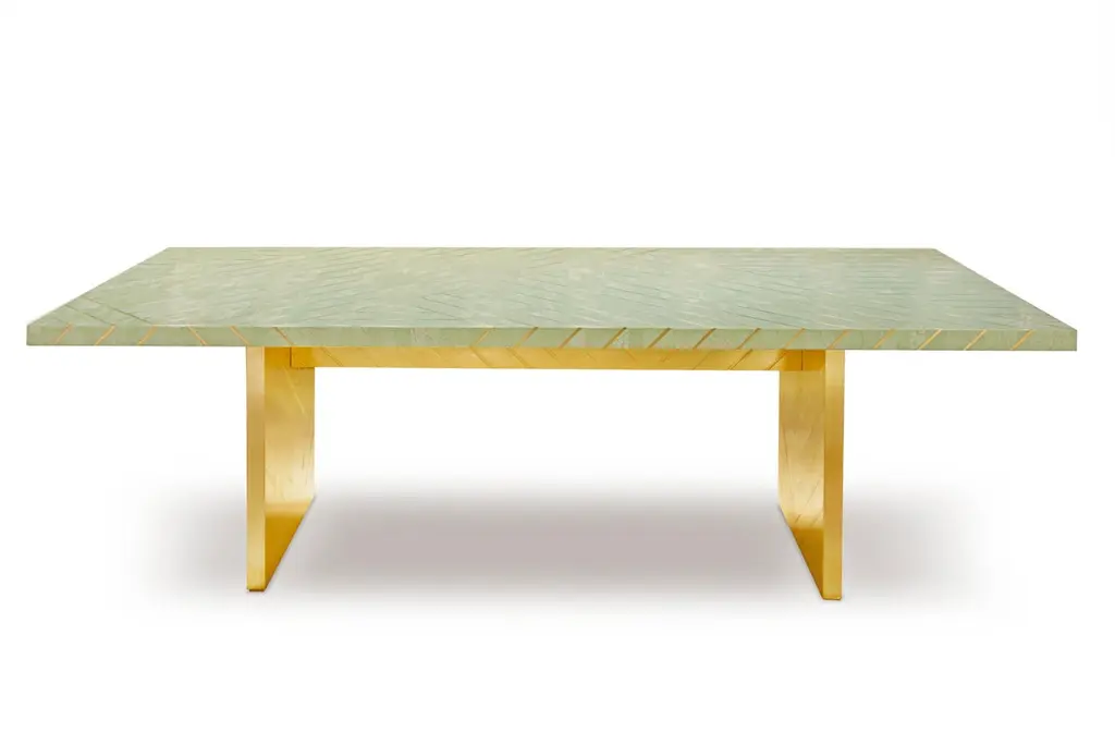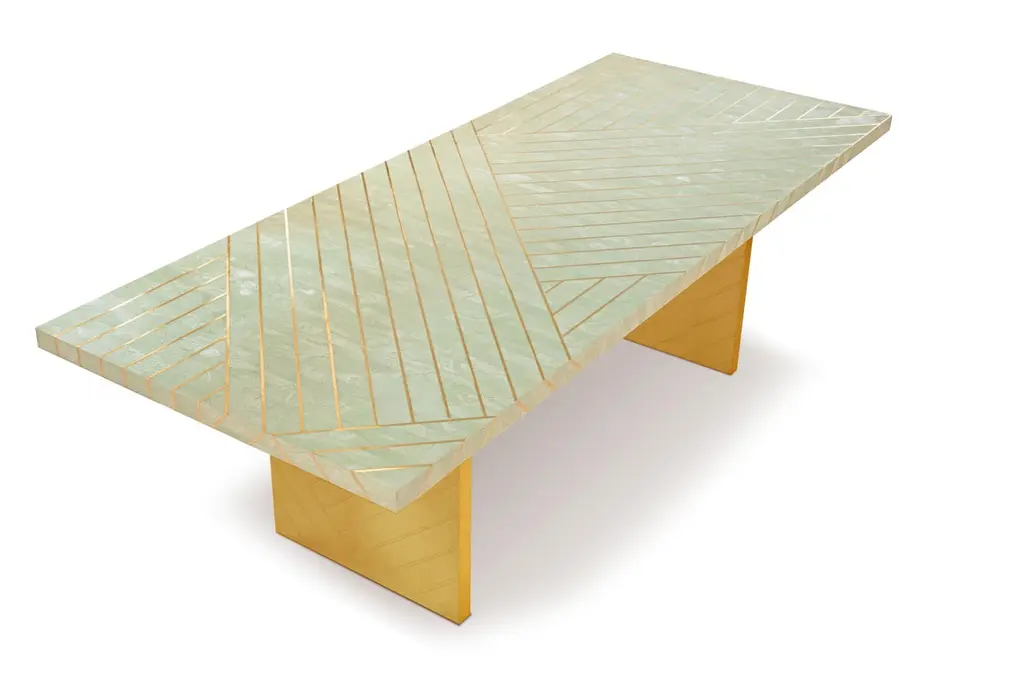 Nesso Large Dining Table with Brass Inlayby Matteo Cibic is luxurious in a pearly resin, brass inlay top and brass legs. It comes in three colors, beige, gray and mint. Custom sizes, colours and finishes are available on request. Awarded designer Matteo Cibic's playful style has helped magnify the confluence between Indian and Western references, bridging elements of Renaissance architecture, Art Deco and pop art, cohesively into the Nesso collection. This Italian trans-media designer likes to experiment with material and design, but always respects the integrity of the final piece The Nesso collection seems naturally drawn to drama, creating gallant spaces, wherever placed. The theatrical shapes and wildly expressive decor define the designer's brilliance. The furniture in this collection traces its roots to traditional Italian Boulle inlay work and the lineage of the brass workers of India, creating a unique yet authentic synchronicity of the two cultures. Each strip is individually placed on to the furniture, delightfully combining resin and brass. This very skilful technique, one may say, is an invention on its own. The entire collection is delicately finished with mother of pearl. The Scarlet Splendour duo and Cibic have taken India's traditional brass work to refreshing heights of luxury. Each product is meticulously handmade in India.Care: Wipe with a soft, dry cloth. Use a brass cleaner if required.Please note: Each piece in the Nesso collection exalts the handmade, the painstakingly crafted, the authentic. A piece may have slight variations and tiny imperfections but these are the marks of an artisan, a testament to the individuality of each work of art. It is our belief that these variations infuse our objects d'art which desire and we assert our right to make the necessary qualitative changes. Prices do not include VAT. VAT may be applied depending on the ship-to location.