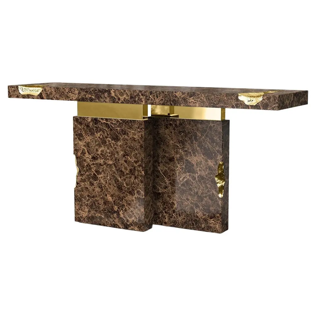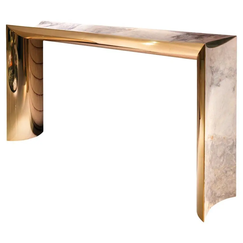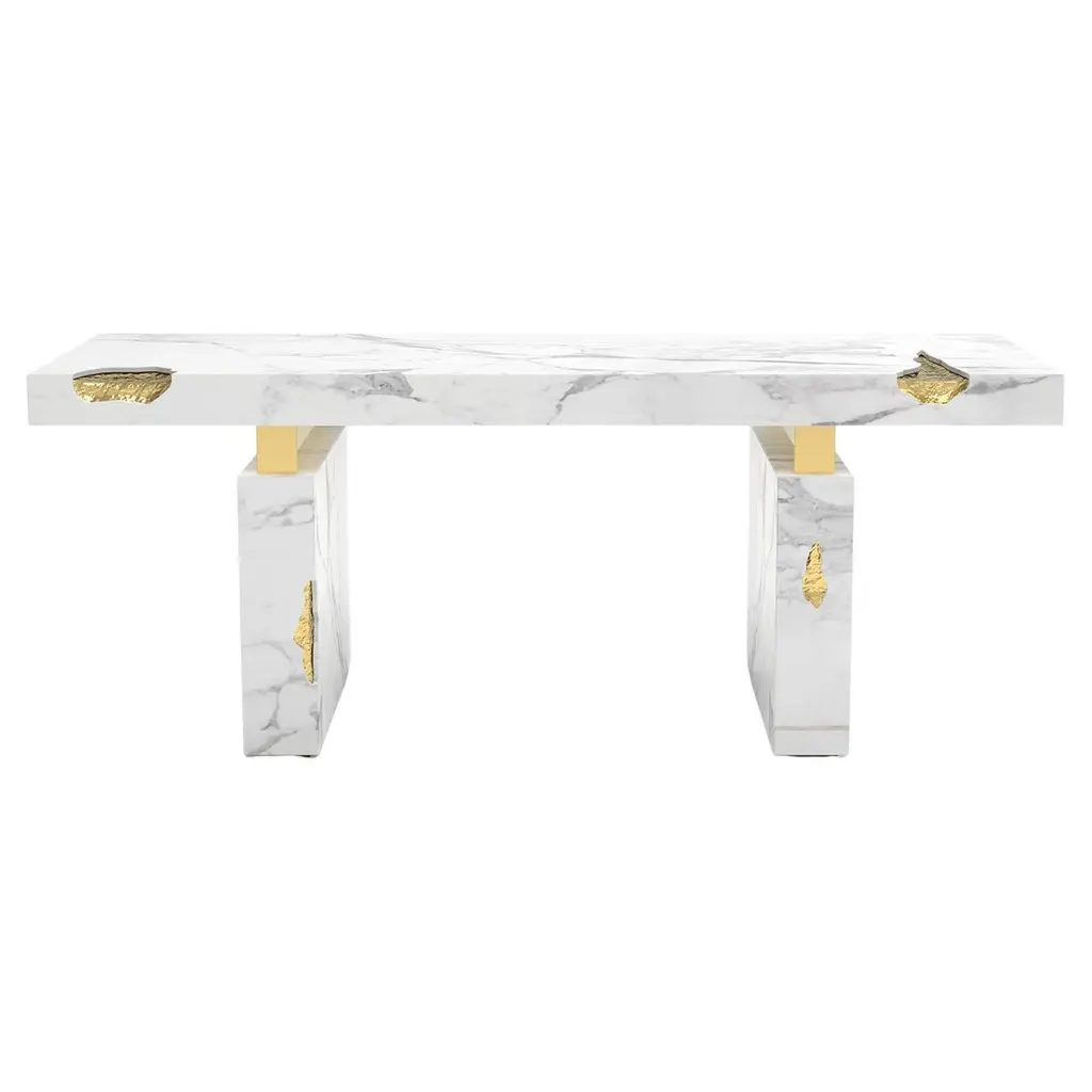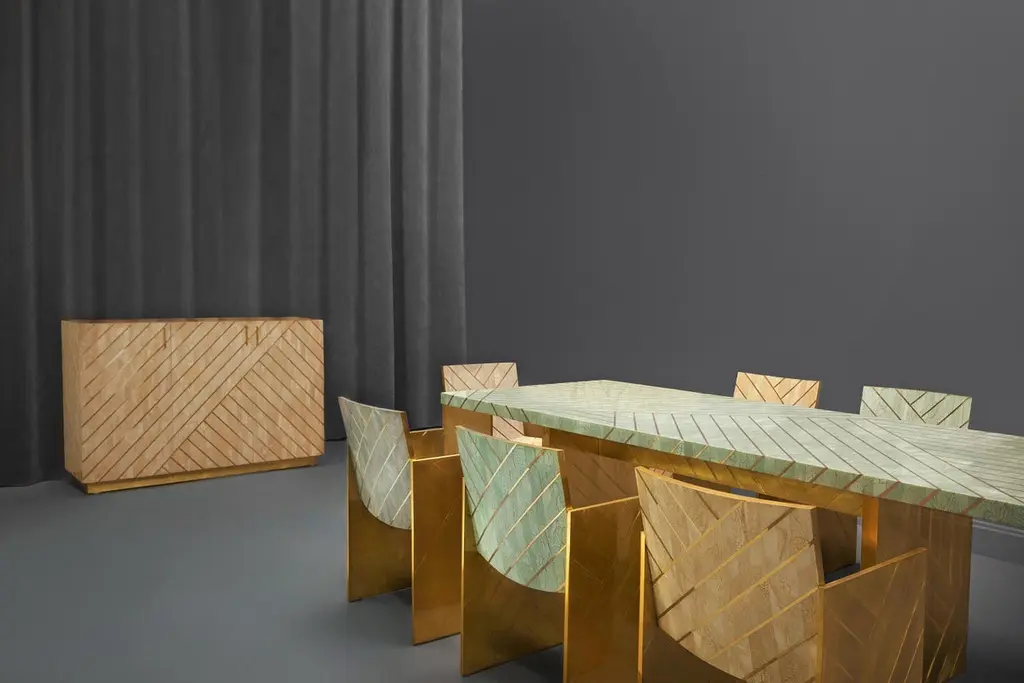 Nesso Large Dining Table with Brass Inlayby Matteo Cibic is luxurious in a pearly resin, brass inlay top and brass legs. It comes in three colors, beige, gray and mint. Custom sizes, colours and finishes are available on request. Awarded designer Matteo Cibic's playful style has helped magnify the confluence between Indian and Western references, bridging elements of Renaissance architecture, Art Deco and pop art, cohesively into the Nesso collection. This Italian trans-media designer likes to experiment with material and design, but always respects the integrity of the final piece The Nesso collection seems naturally drawn to drama, creating gallant spaces, wherever placed. The theatrical shapes and wildly expressive decor define the designer's brilliance. The furniture in this collection traces its roots to traditional Italian Boulle inlay work and the lineage of the brass workers of India, creating a unique yet authentic synchronicity of the two cultures. Each strip is individually placed on to the furniture, delightfully combining resin and brass. This very skilful technique, one may say, is an invention on its own. The entire collection is delicately finished with mother of pearl. The Scarlet Splendour duo and Cibic have taken India's traditional brass work to refreshing heights of luxury. Each product is meticulously handmade in India.Care: Wipe with a soft, dry cloth. Use a brass cleaner if required.Please note: Each piece in the Nesso collection exalts the handmade, the painstakingly crafted, the authentic. A piece may have slight variations and tiny imperfections but these are the marks of an artisan, a testament to the individuality of each work of art. It is our belief that these variations infuse our objects d'art which desire and we assert our right to make the necessary qualitative changes. Prices do not include VAT. VAT may be applied depending on the ship-to location.