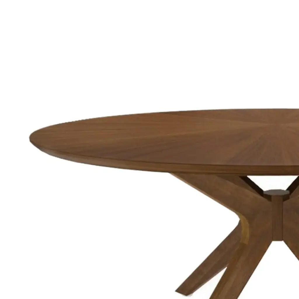 This sleek, round dining table is full of approachable modern style. It's crafted from solid wood with a warm walnut finish for a hint of rustic charm. Supported by a pedestal base, it also features spider-style legs for added stability. The circular table top has beveled-edge details and a subtle sunburst design to complete the look. With its spacious dimensions, it can accommodate between four and six people. Take note: Compatible benches and chairs are sold separately.