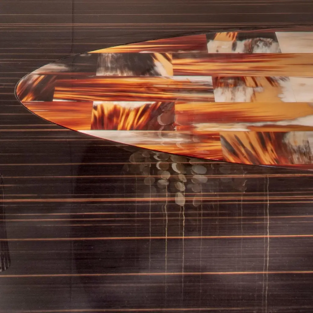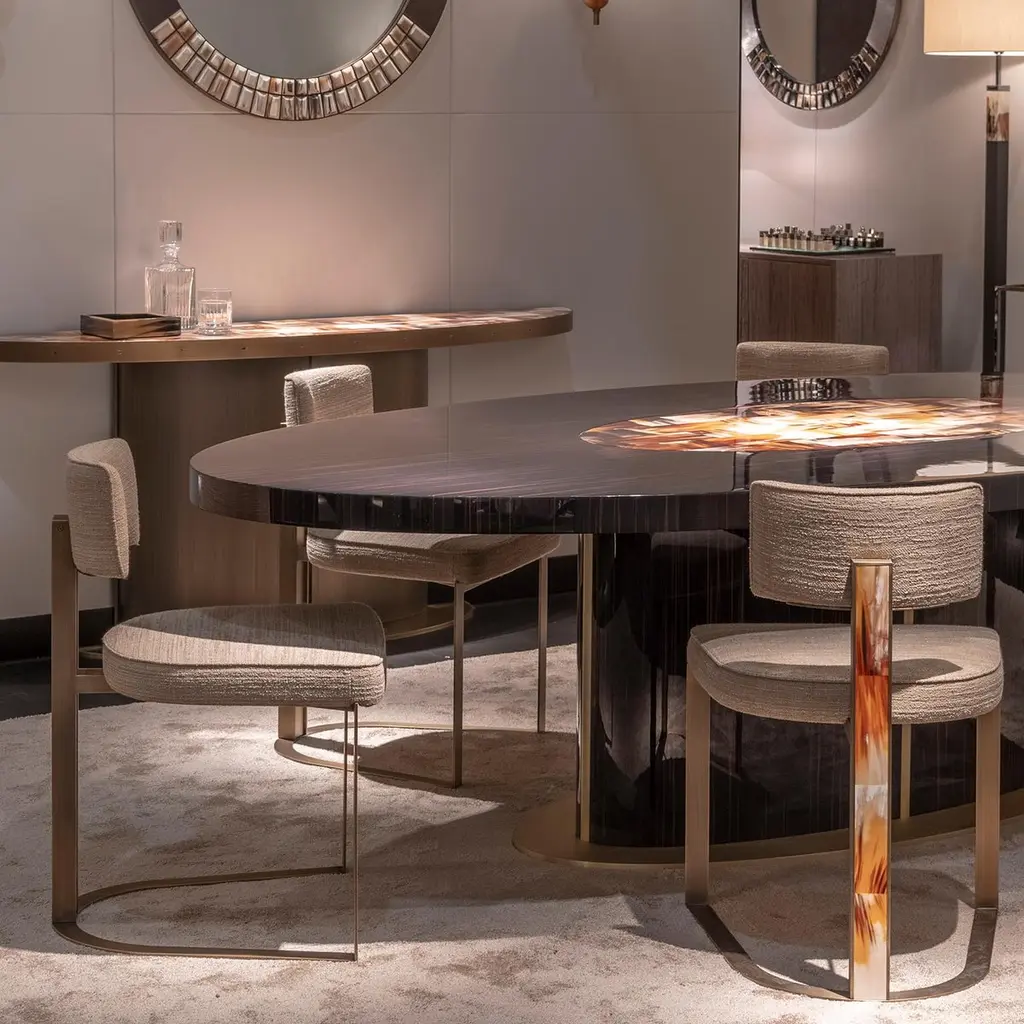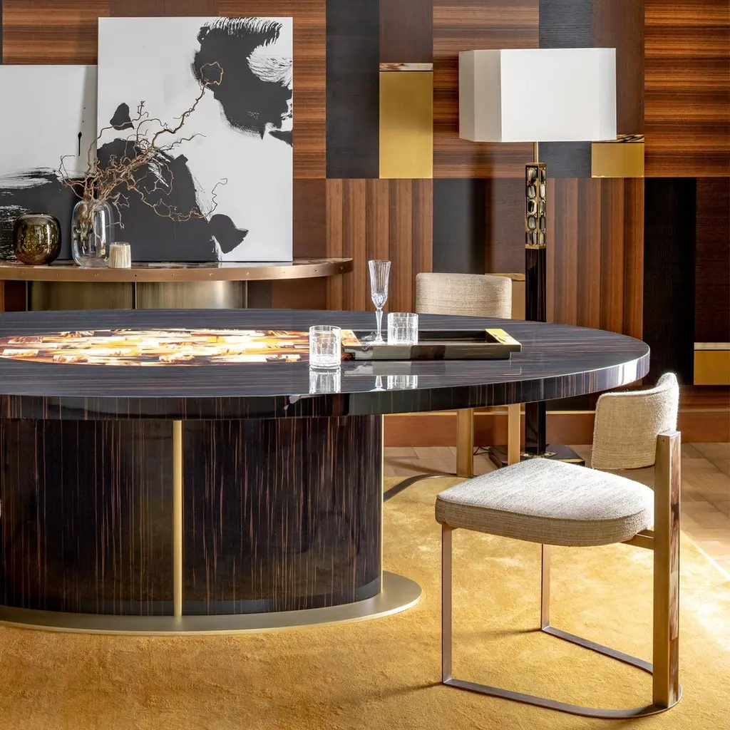 Symbol of conviviality, the dining table has always been the center of the home for gathering together. With a strong visual impact, Nettuno dining table offers a stunning outline and a singular level of refinement. Composed of an oval top in glossy ebony with a central marquetry in Corno Italiano, this table offers desirable natural hues and discerning details which are the epitome of luxury. The design is completed by a sturdy oval column in glossy ebony and a stunning base in satin brass adding a sense of charm to the design. Note: Colors and shades of Corno Italiano processed by our Company are unique and due to the natural origin of raw material. For this reason Corno Italiano tones that can be seen in pictures are indicative and cannot be reproduced in finished products.